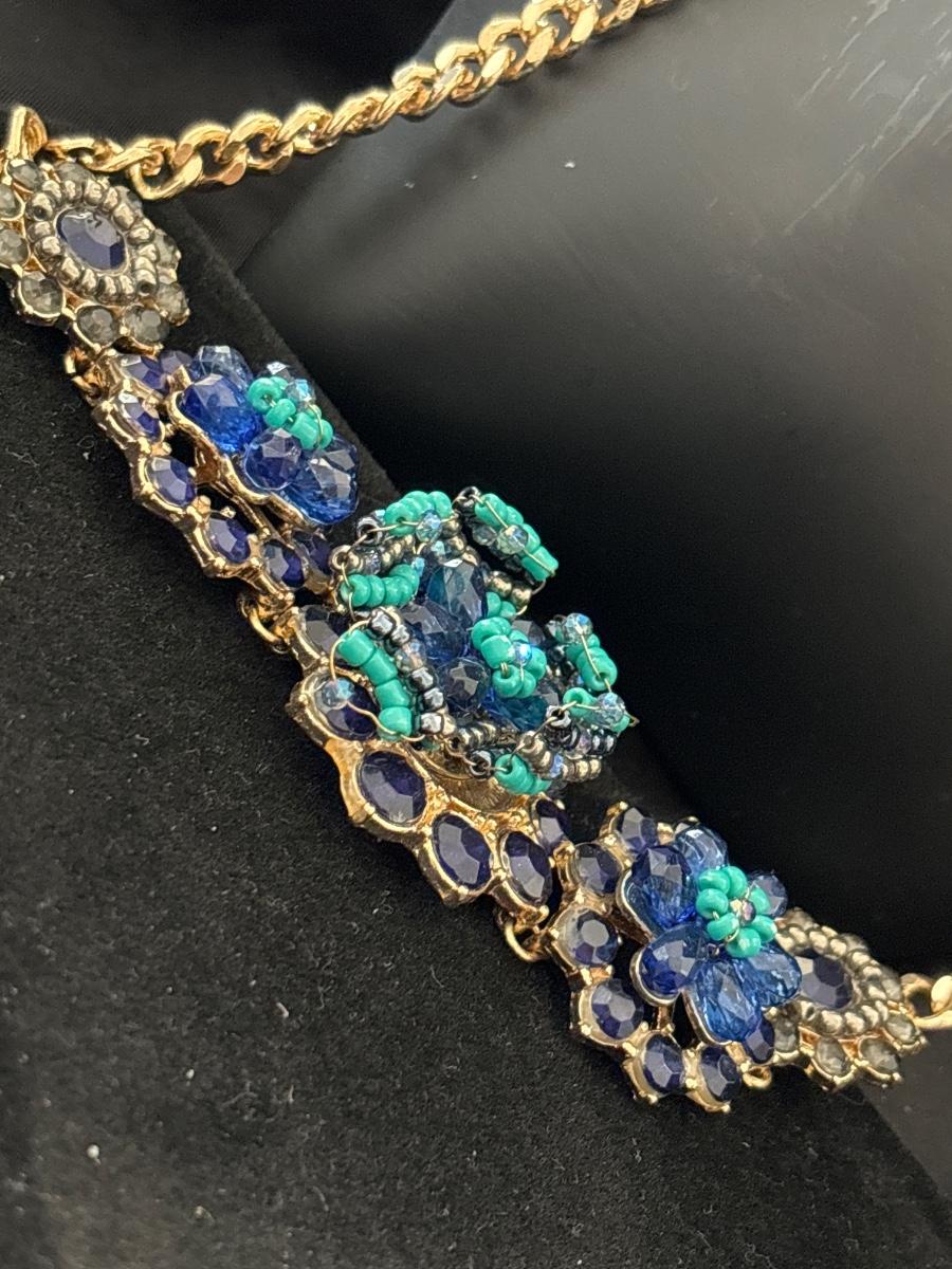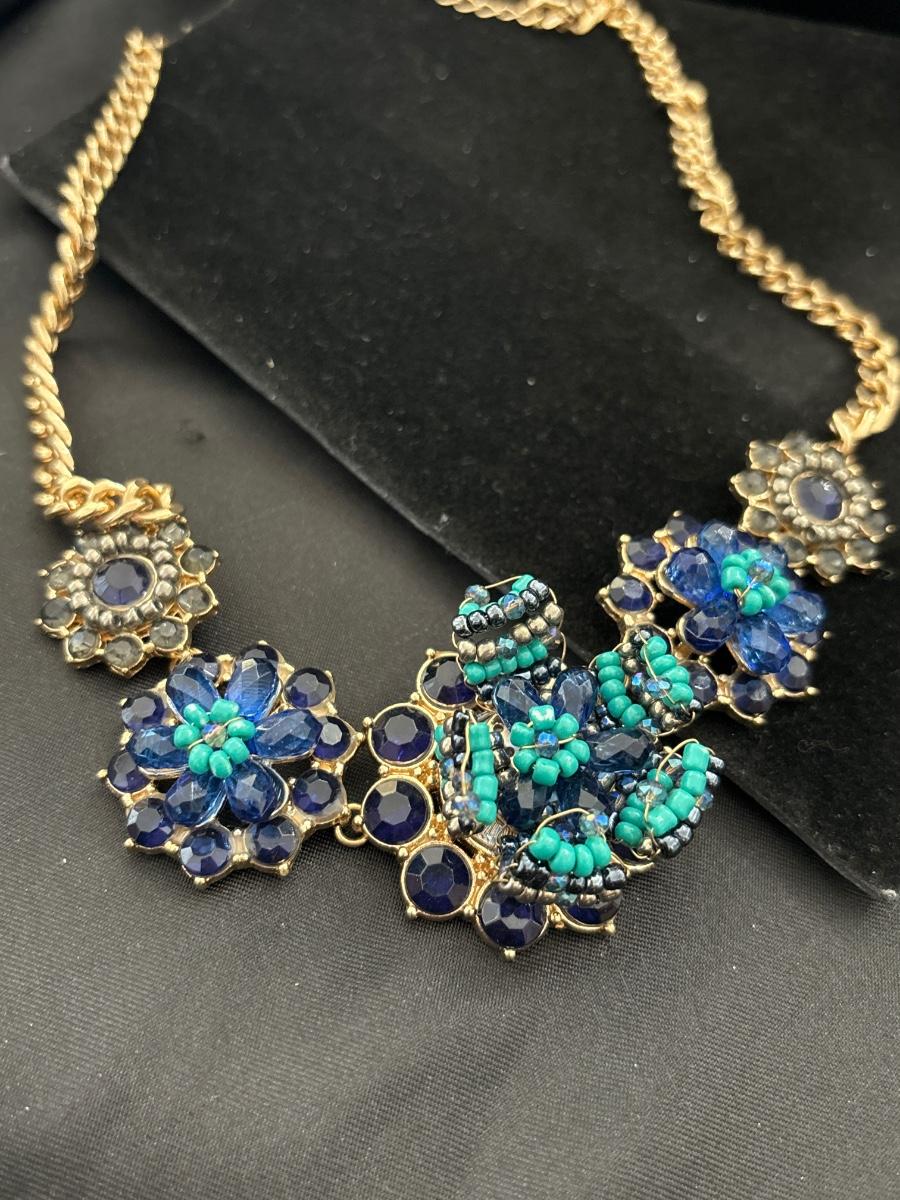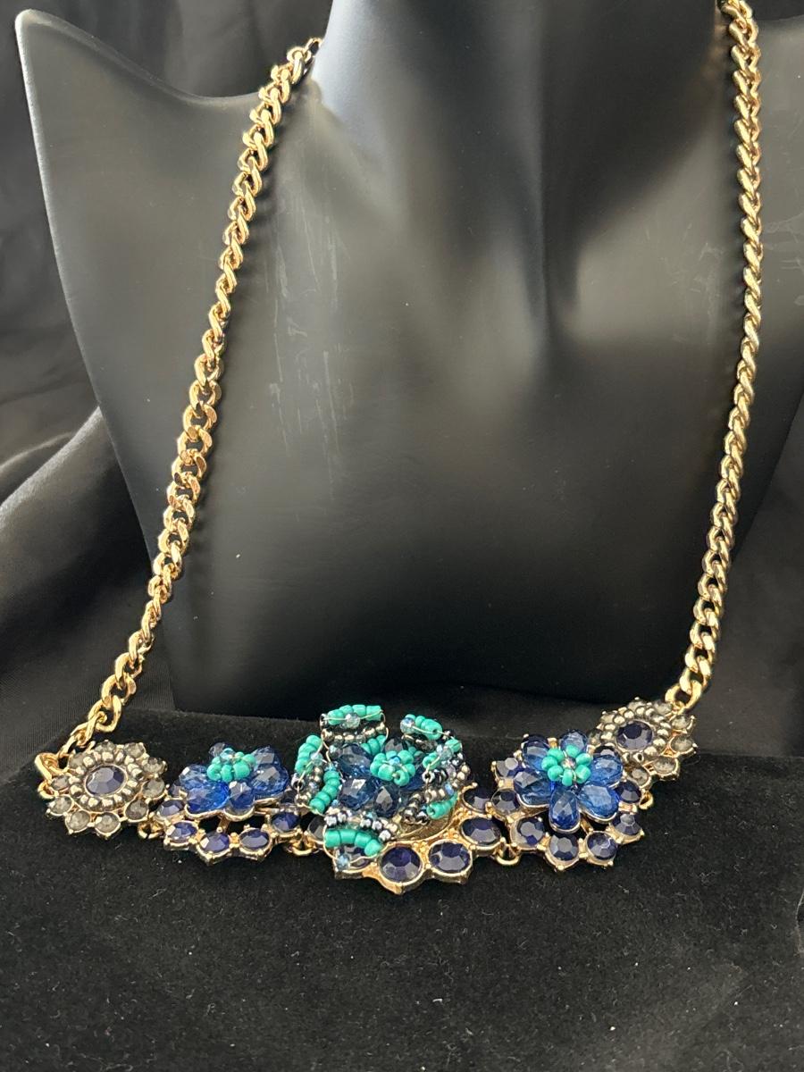 MNG gold tone statement blue flower necklace