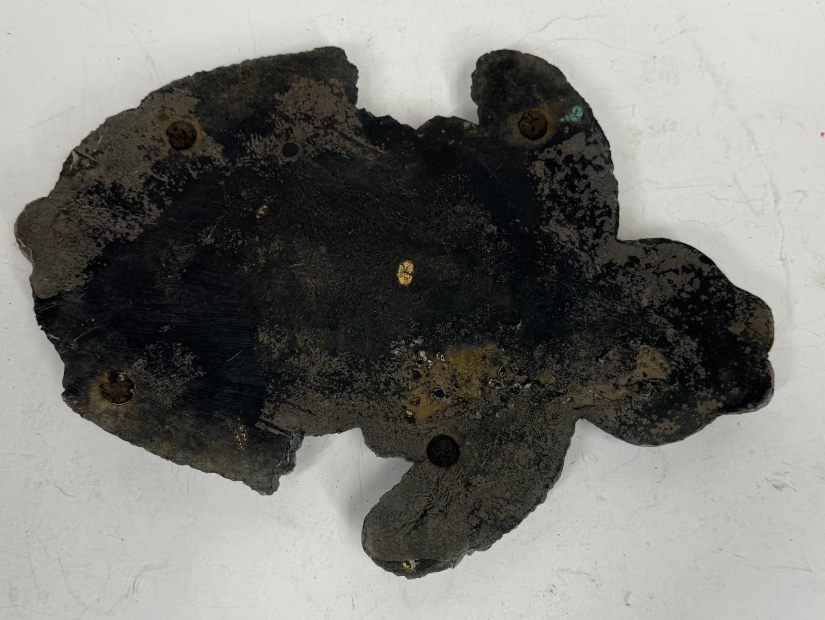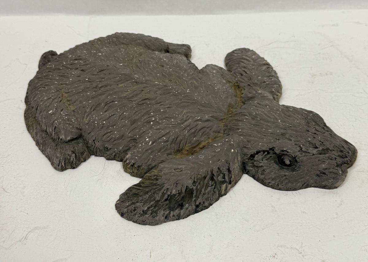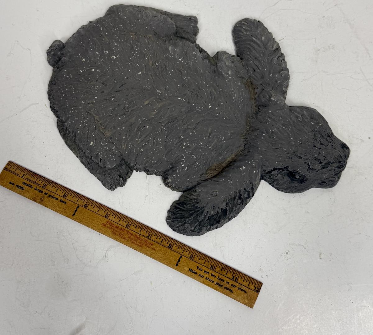 Concrete-colored resin, very heavy. In good condition. Approx. 13” long.