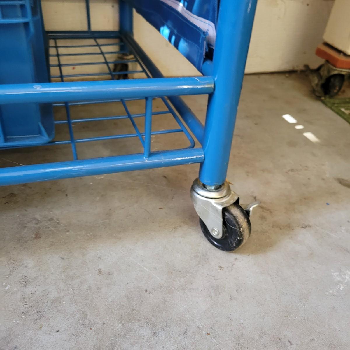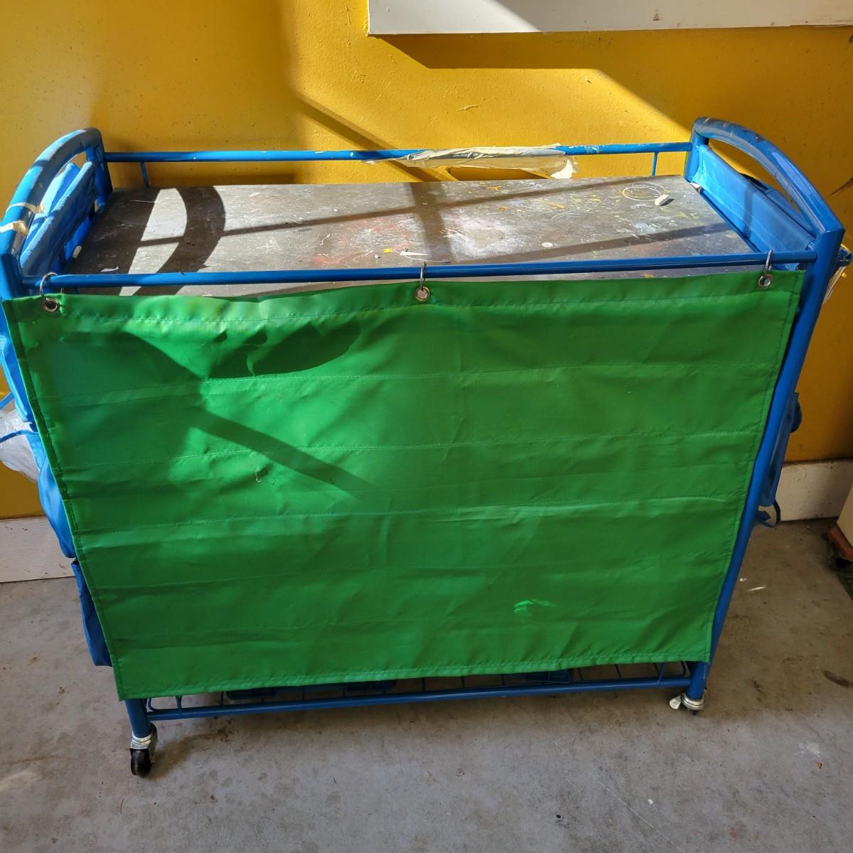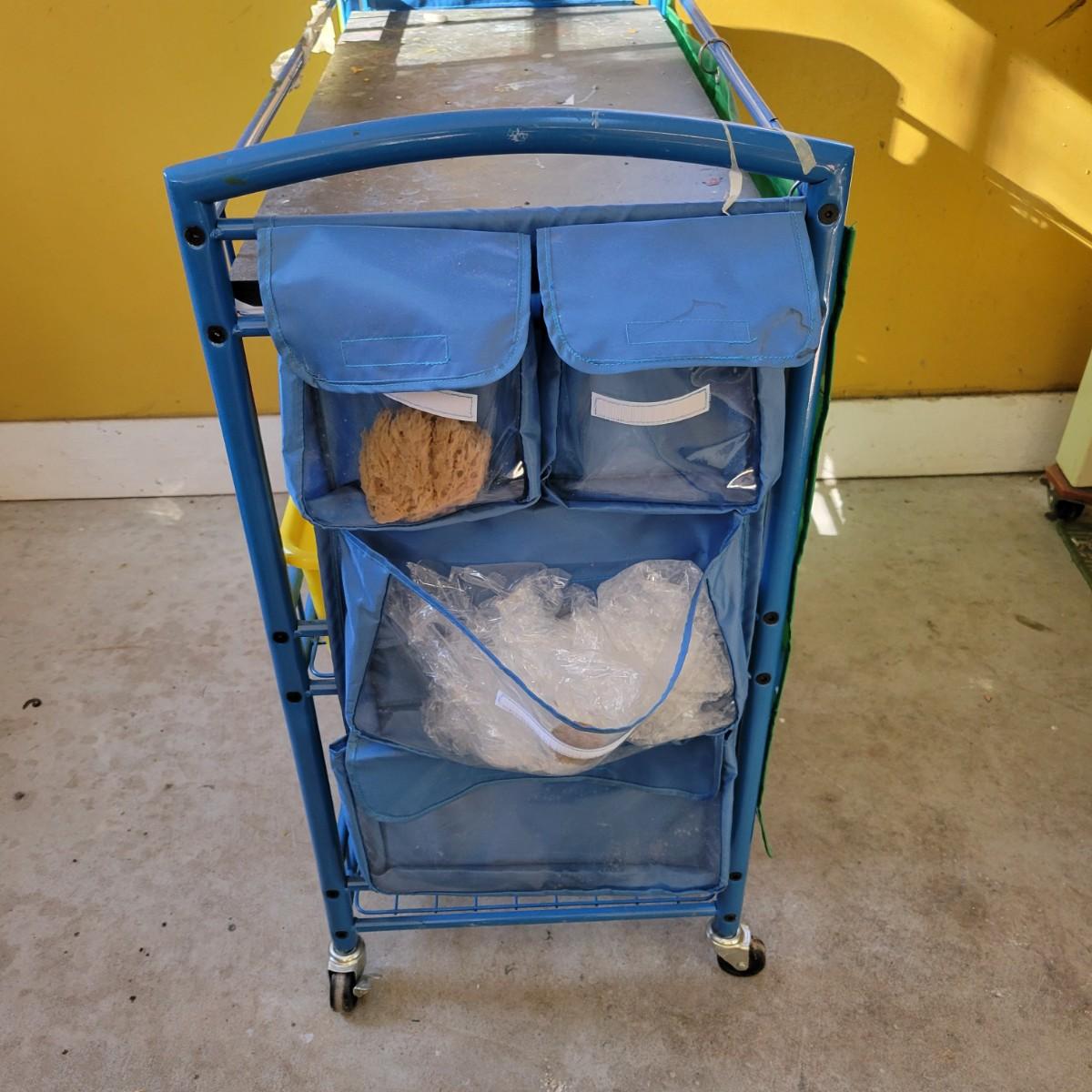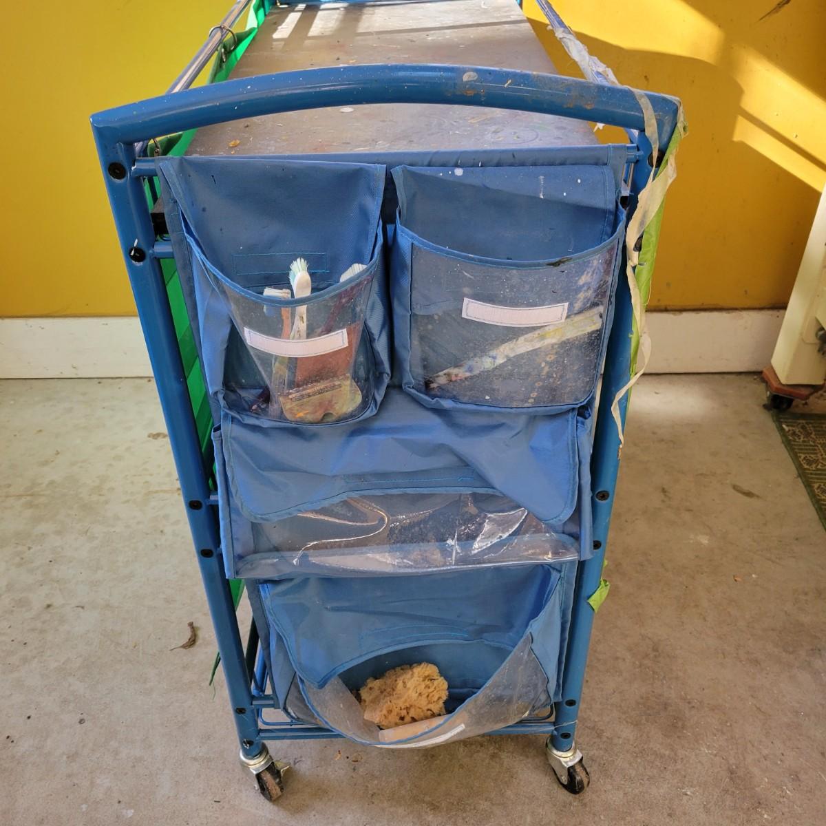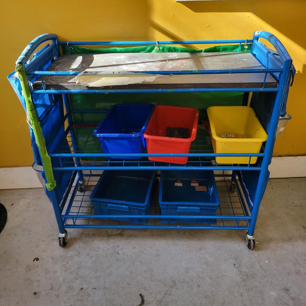 A mobile art caddy in good condition, but with some scratches and paint on it. This caddy has three shelves and casters. Also includes five bins that fit on the three shelves, and two hanging organizers on the ends. There are a few random art supplies still in the organizers. Measures approximately 34" x 16" x 34". Local pickup only