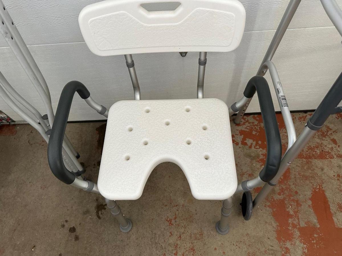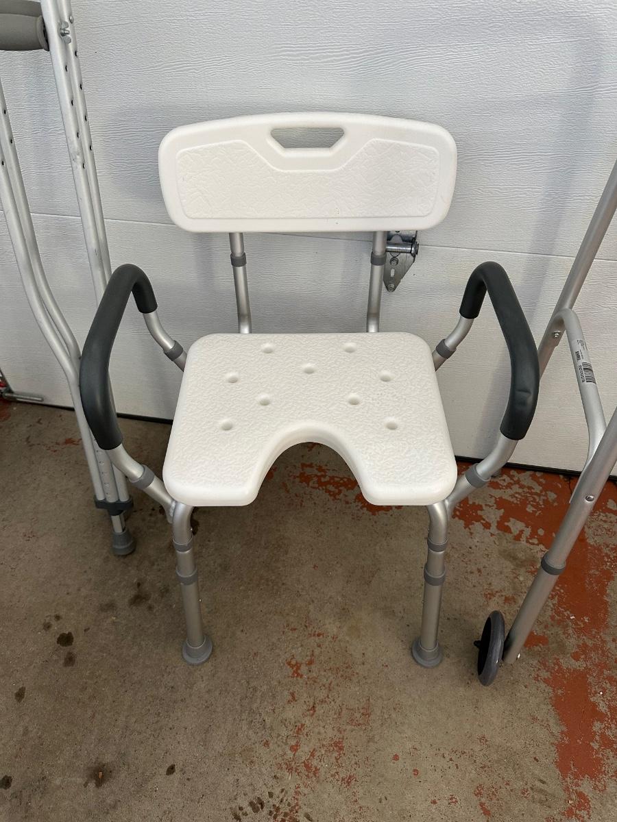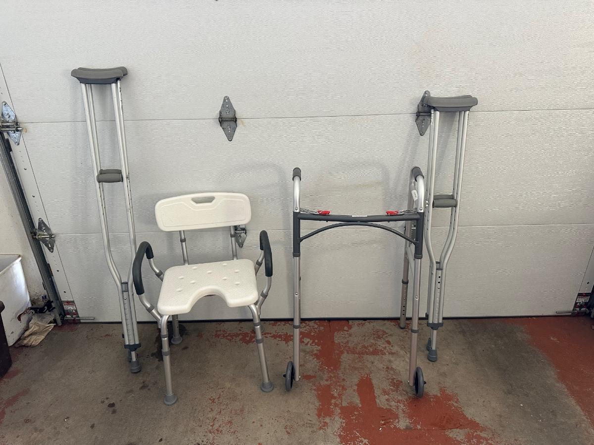 .2 PAIRS OF CRUTCHES, SHIWER SEAT AND WALKER