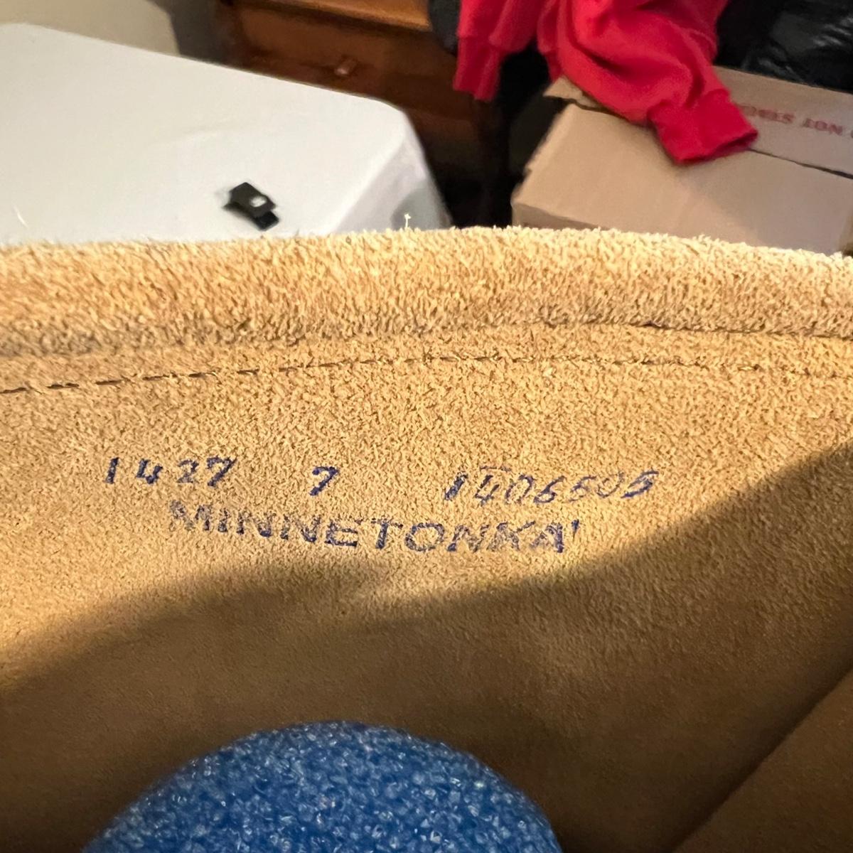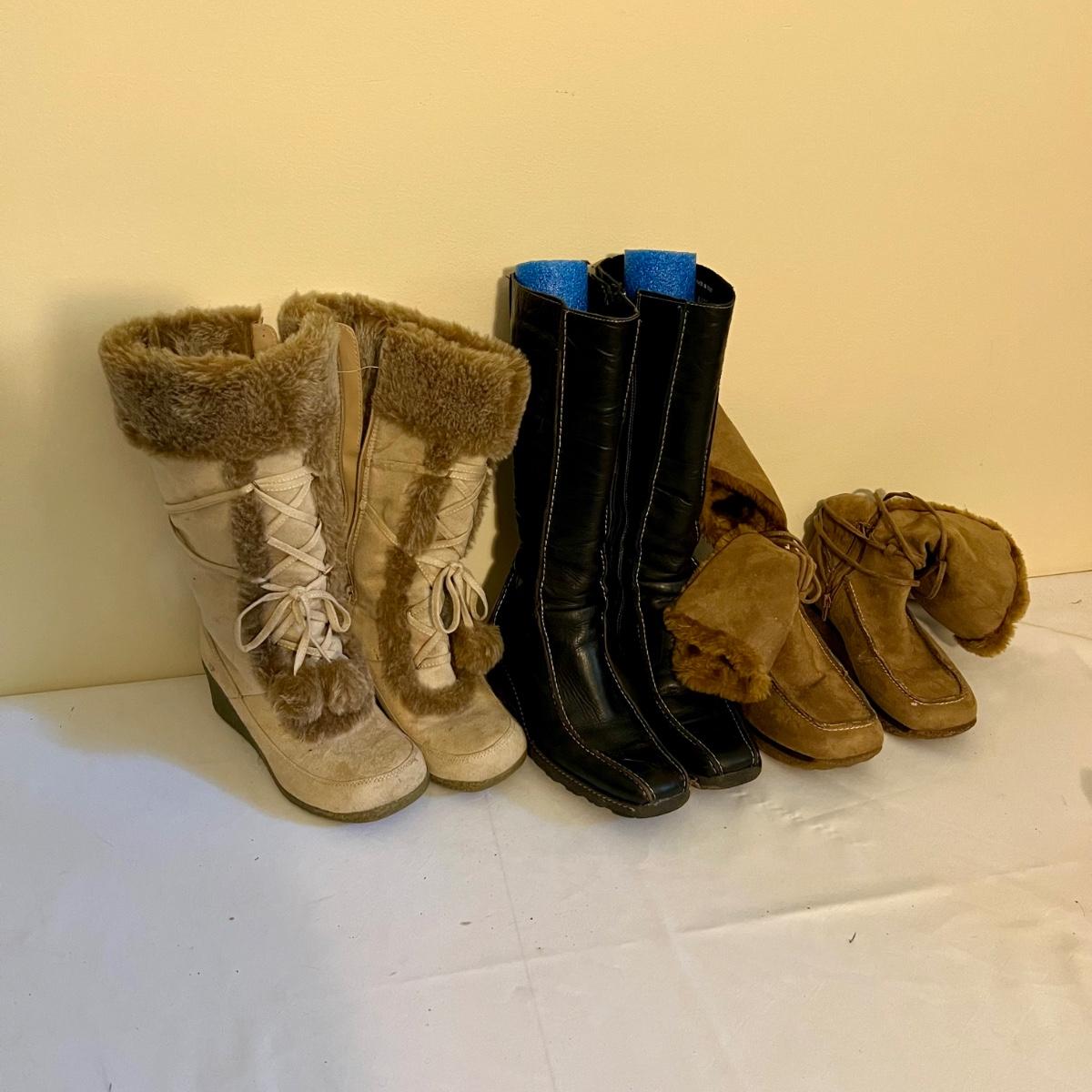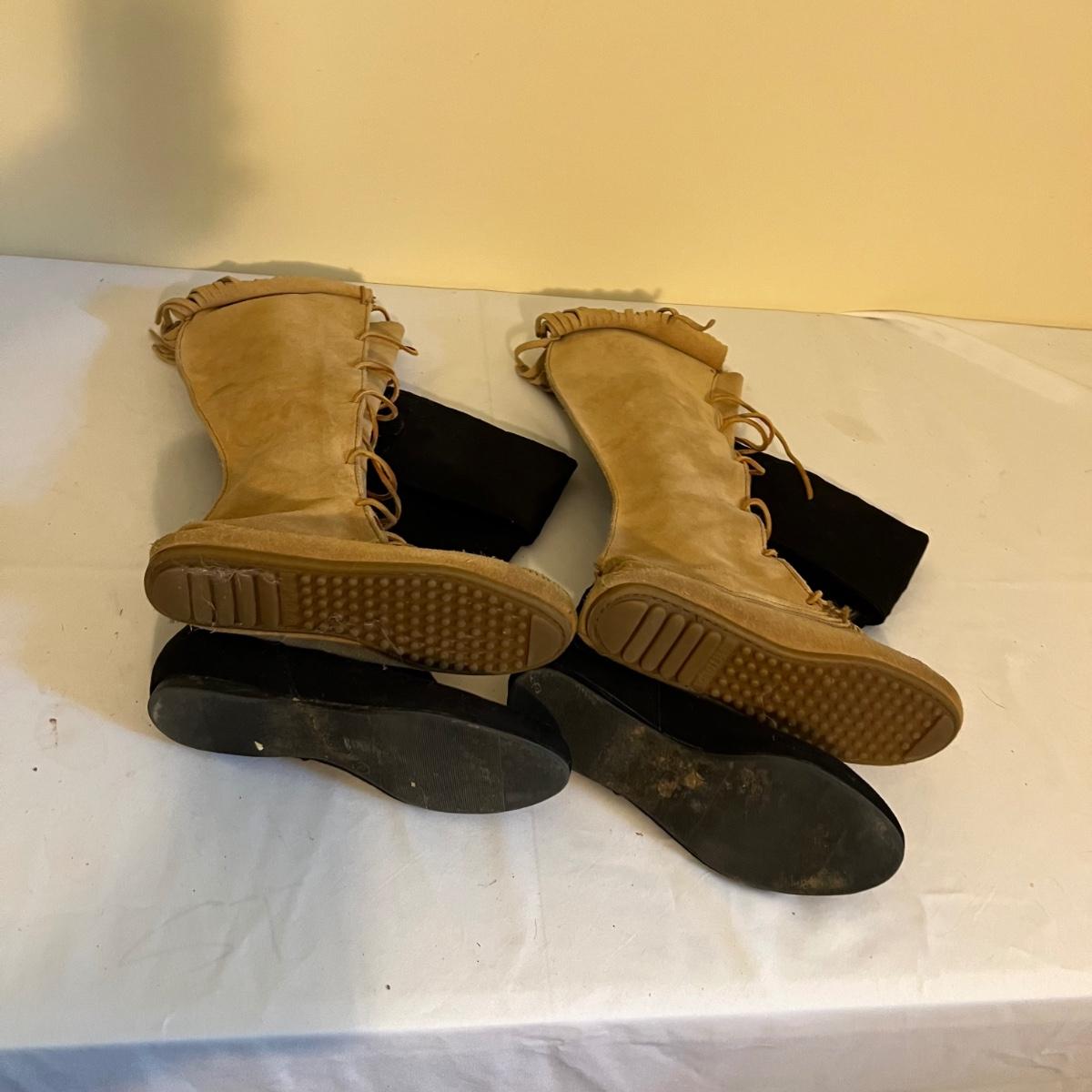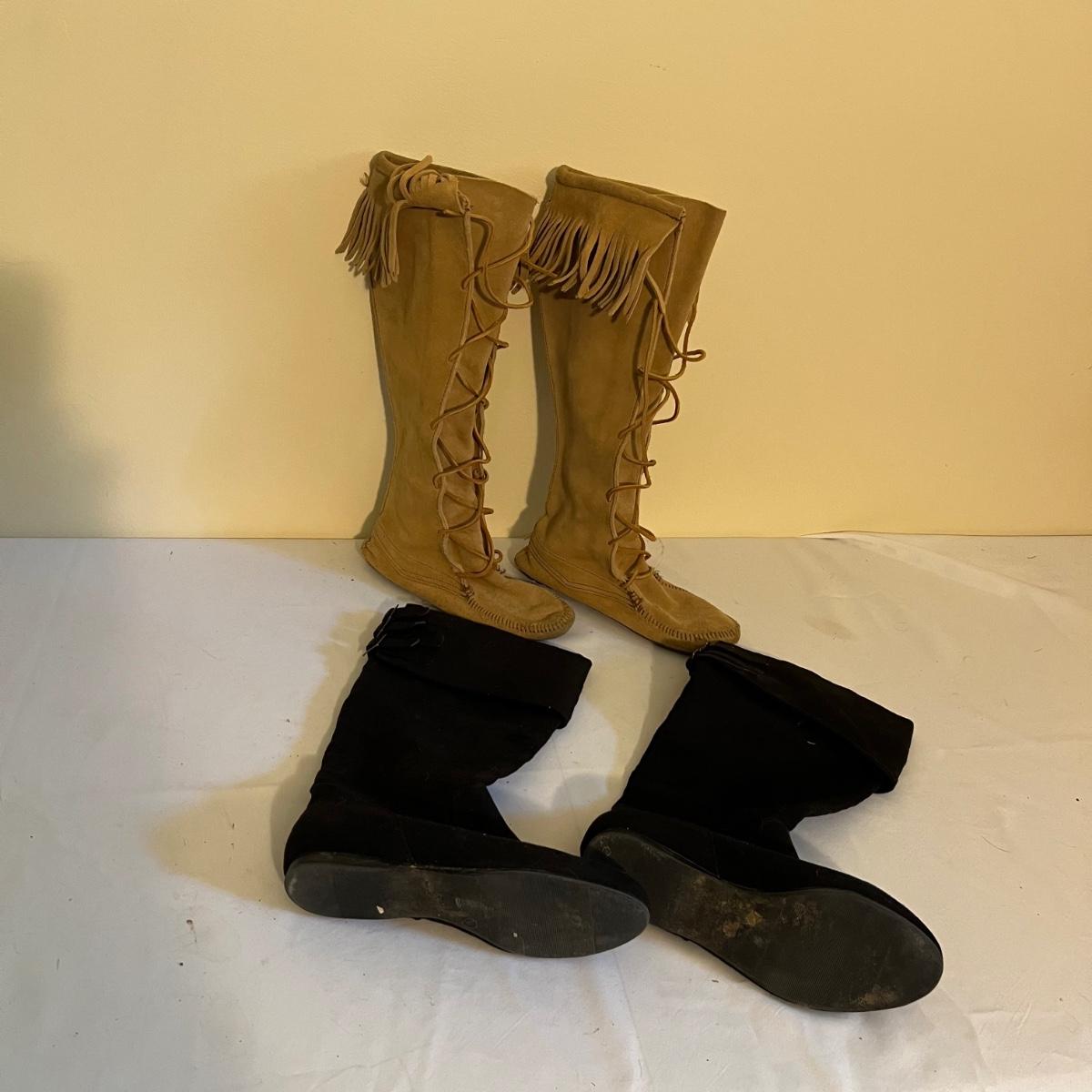Eight pairs of boots feature a pair of tan Minnetonka moccasin boots plus cowboy boots and other fashion boots. Some need a good cleaning with dirt on soles and dog hair on lining. See photos for brands and sizes. Not all have size labels but appear to be size 8.