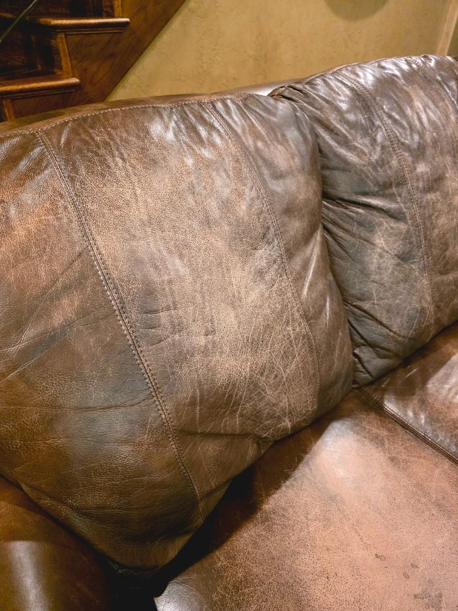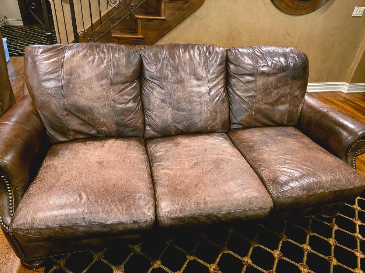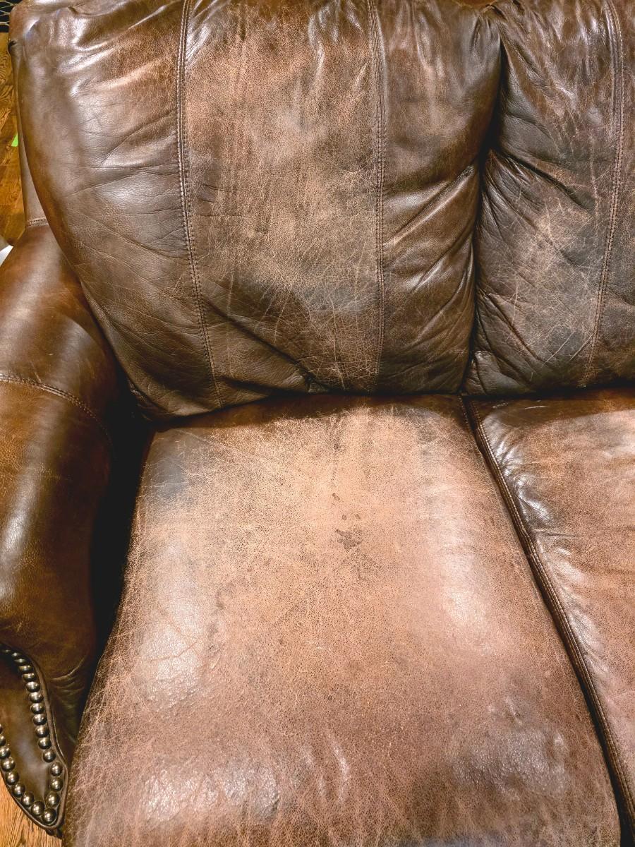 The seat cushion depth is 26". This sofa has more wear than sofa #1. Leather cleaner should help. No tears. It is a leather couch, so no peeling.