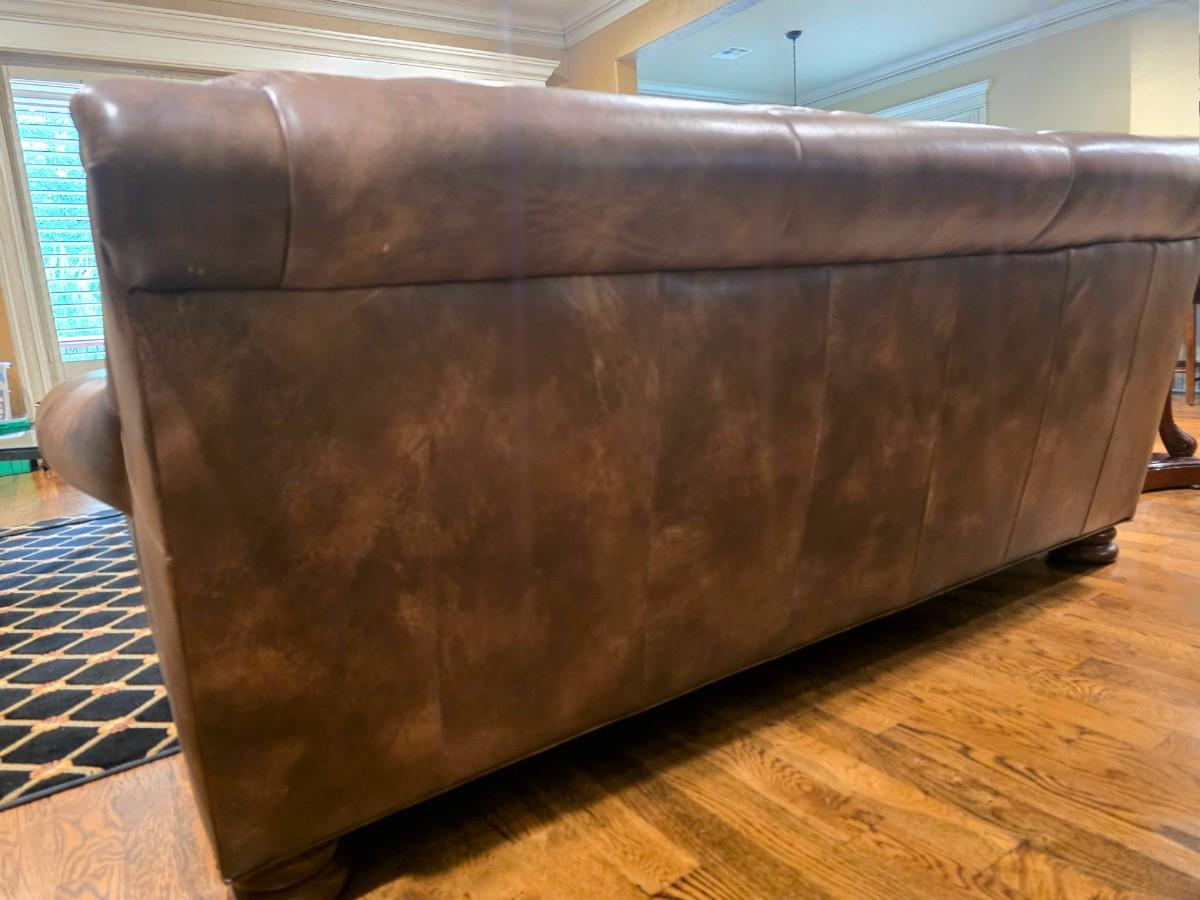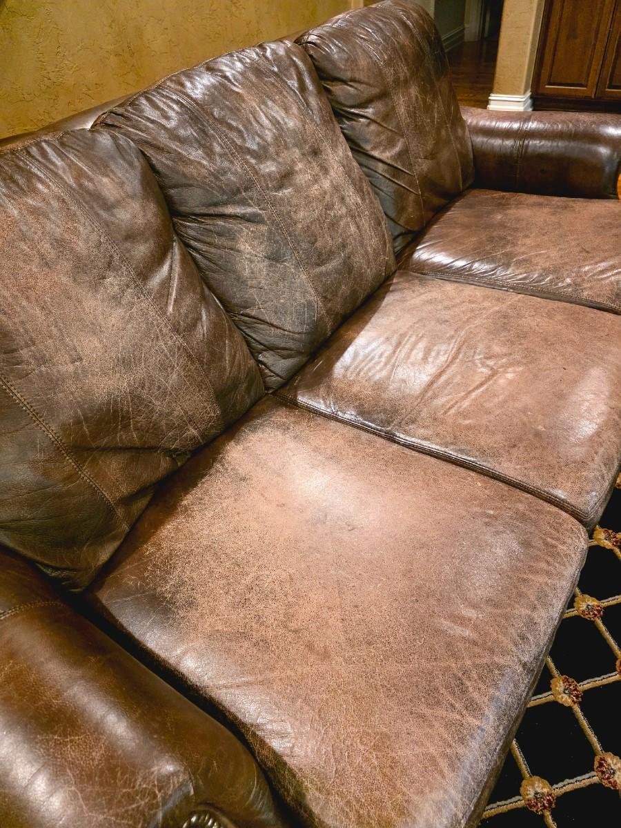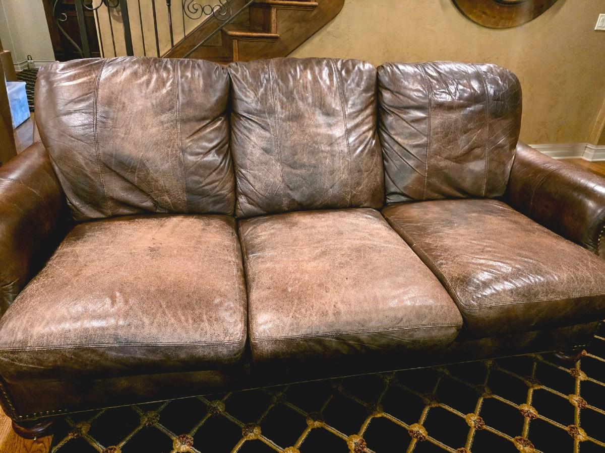 The seat cushion depth is 26". This sofa has more wear than sofa #1. Leather cleaner should help. No tears. It is a leather couch, so no peeling.