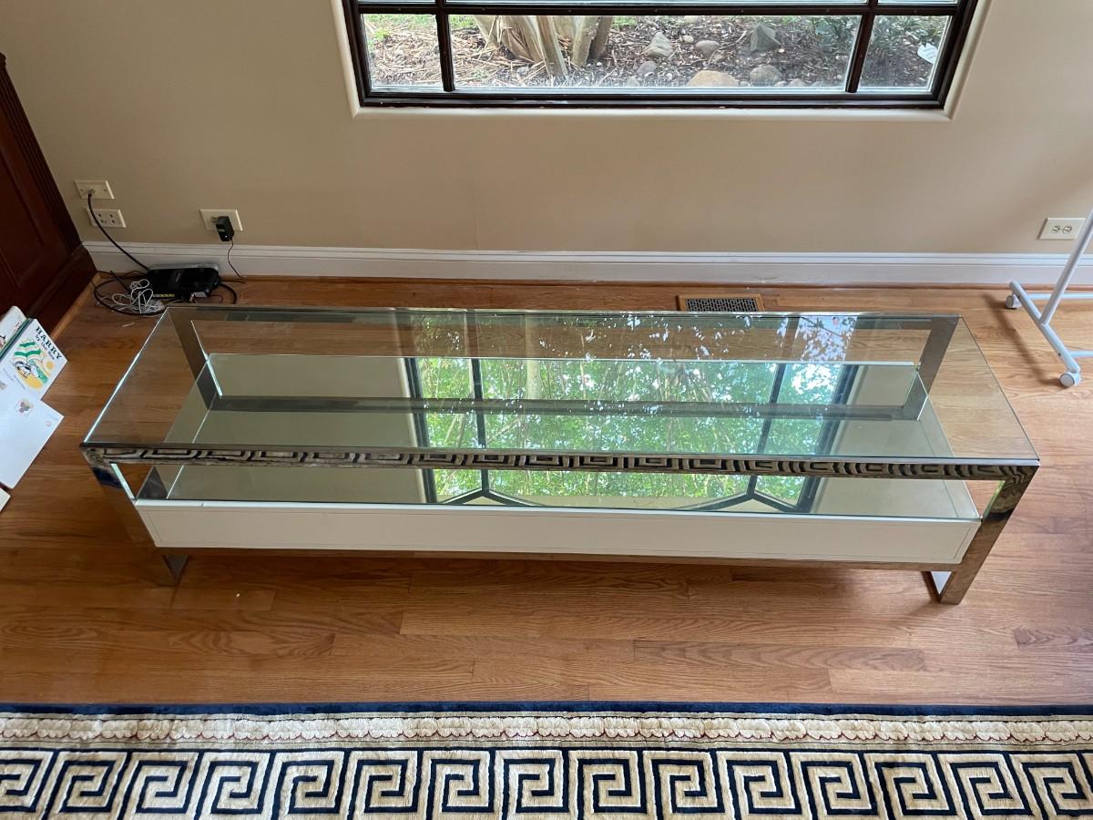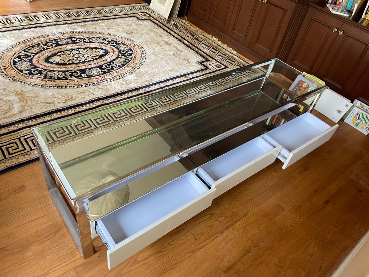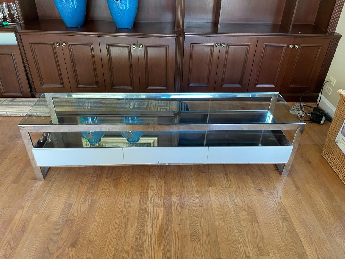 77L x 20H x 19 1/2h. Tempered Glass Upper Top, Mirror Lower Top, Polished Stainless Steel Frame, Matt White Lacquered Engineered Wood Body, 3 Drawers with Undermount Slides - Soft Closing System, Weight Capacity: 220 lbs. Original Price $1,200 USD.