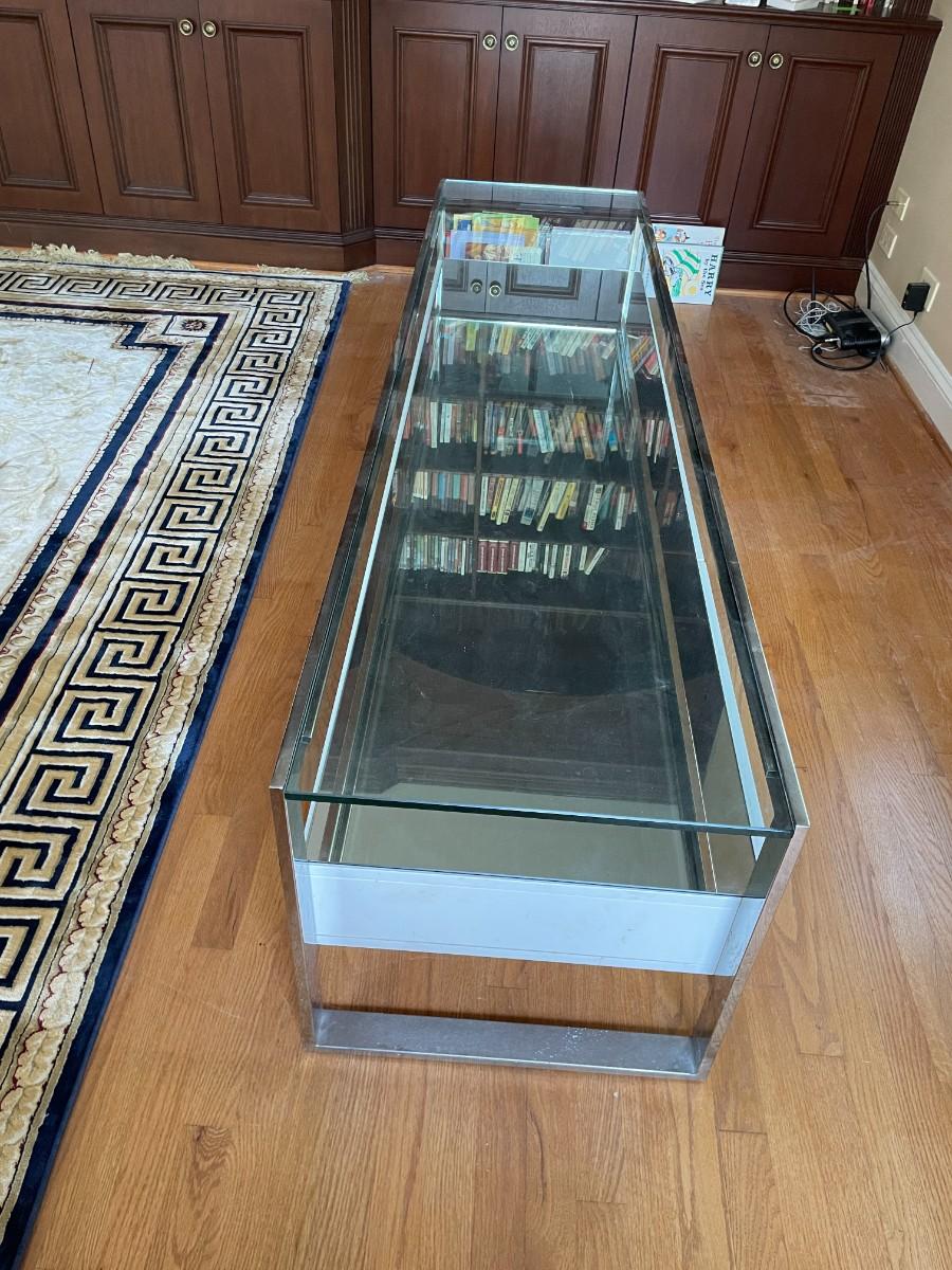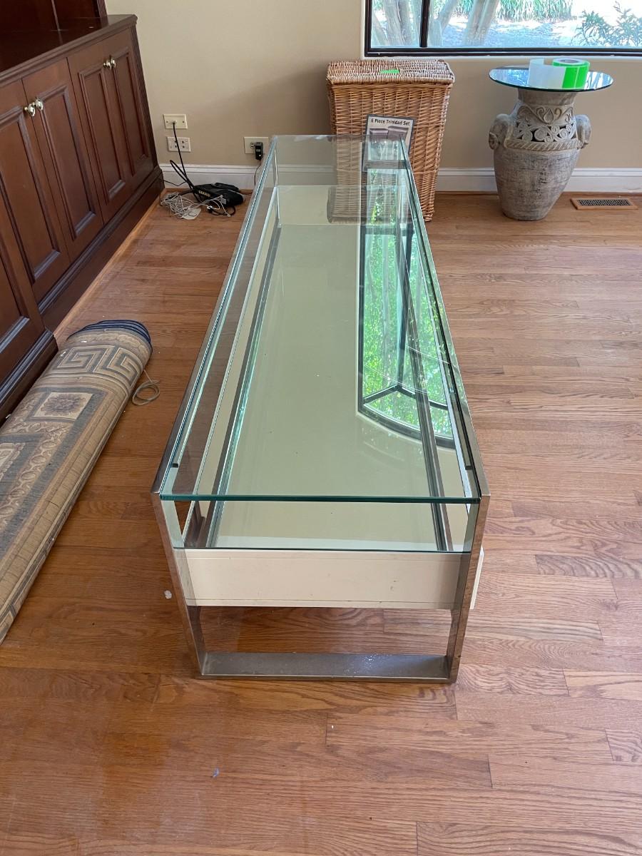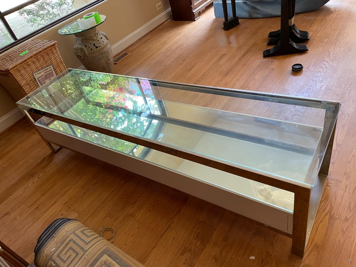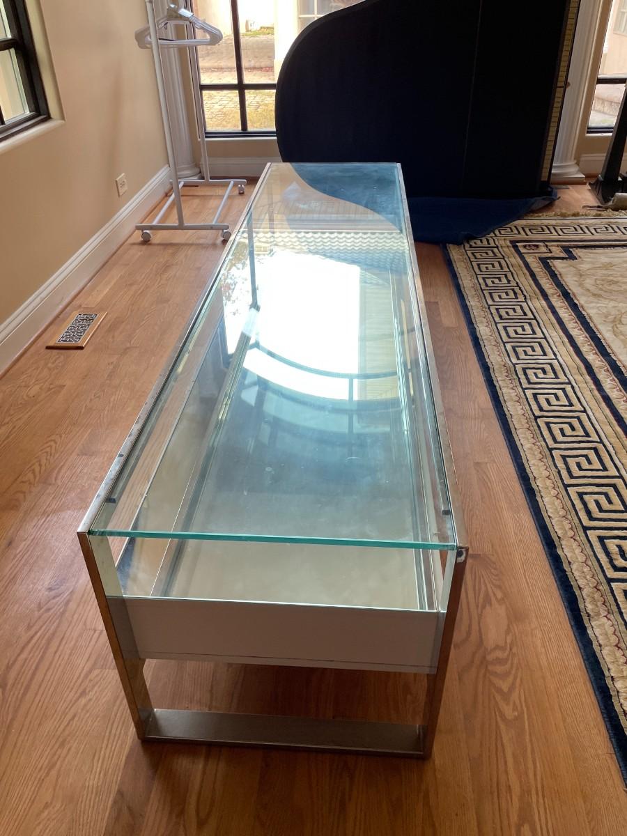 77L x 20H x 19 1/2h. Tempered Glass Upper Top, Mirror Lower Top, Polished Stainless Steel Frame, Matt White Lacquered Engineered Wood Body, 3 Drawers with Undermount Slides - Soft Closing System, Weight Capacity: 220 lbs. Original Price $1,200 USD.