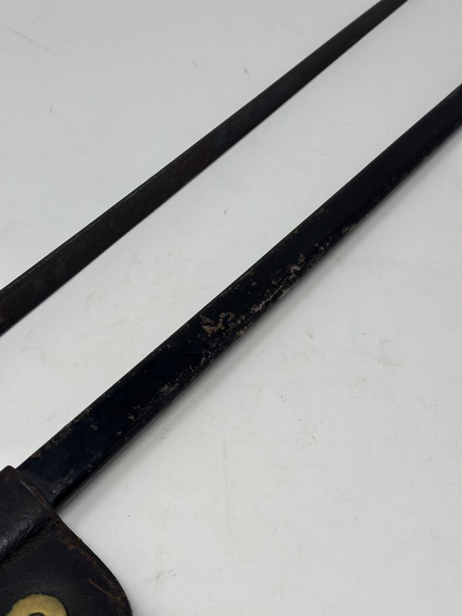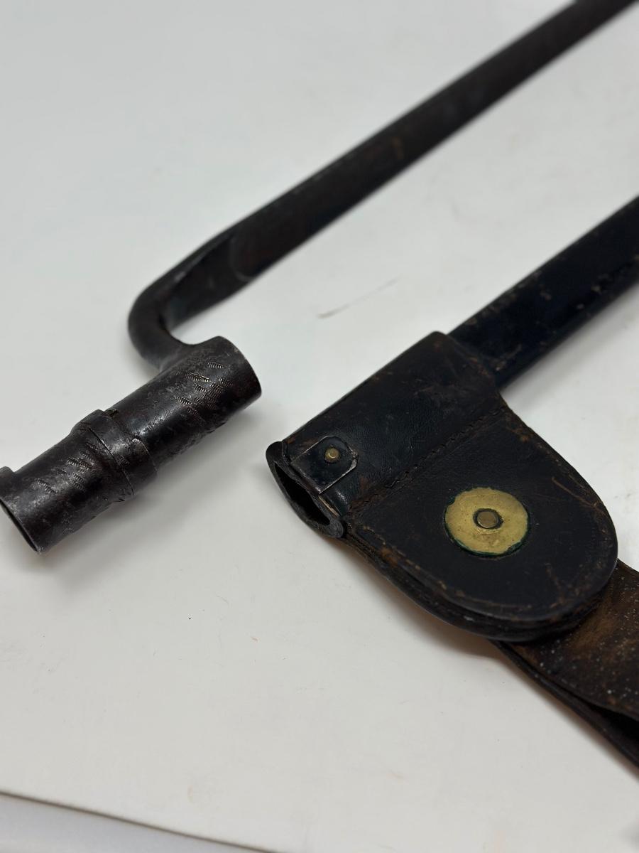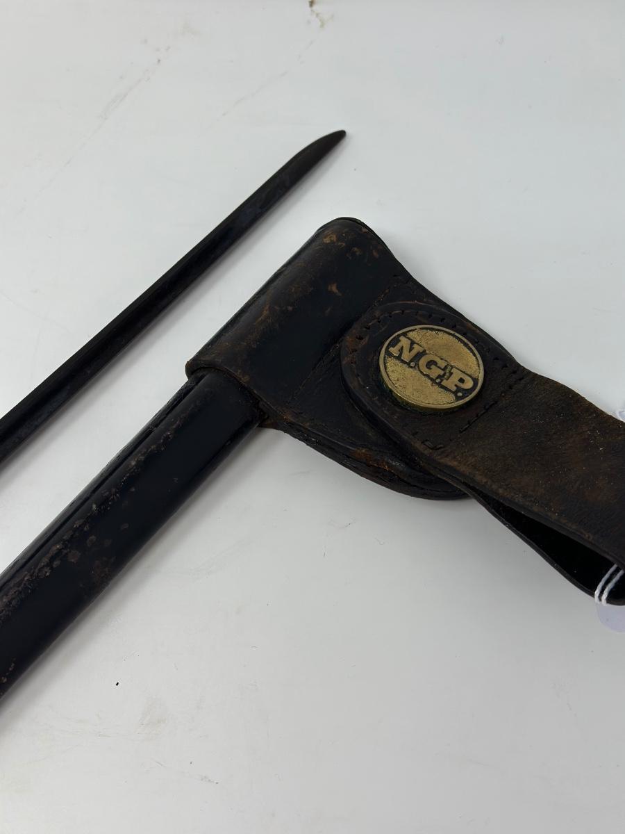 This is a US 45/70 Trapdoor Springfield Bayonet Scabbard with a National Guard Pennsylvania (NGP) brass frog. It was designed for the .45-70 Springfield trapdoor rifle most likely from the Indian Wars era. Likely patented by Mckenney's, this type of scabbard is a rare find because during WWII many surviving Model 1873's were cut up to make trench daggers.
