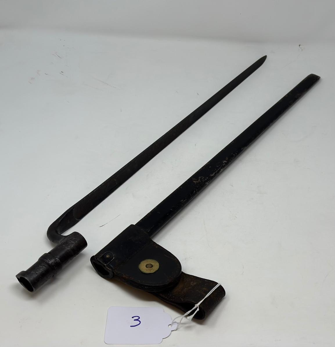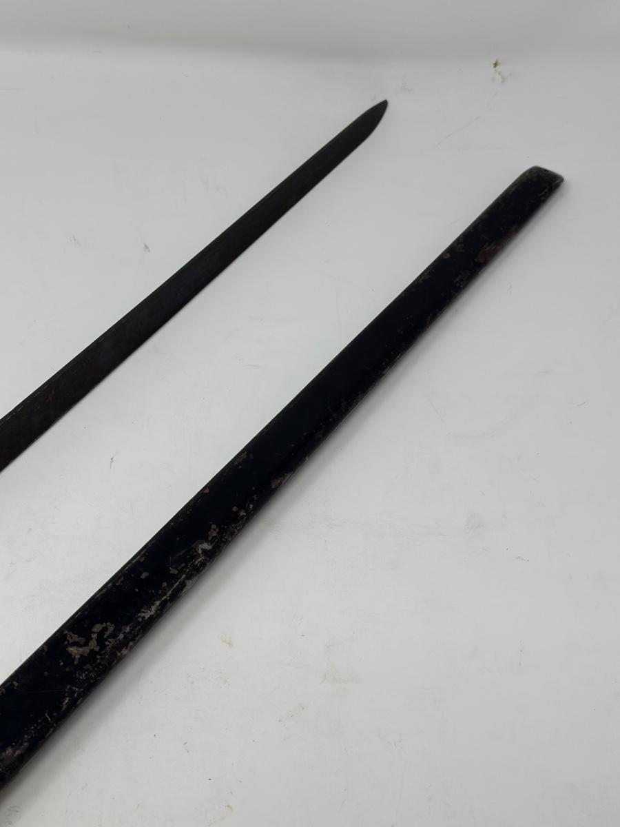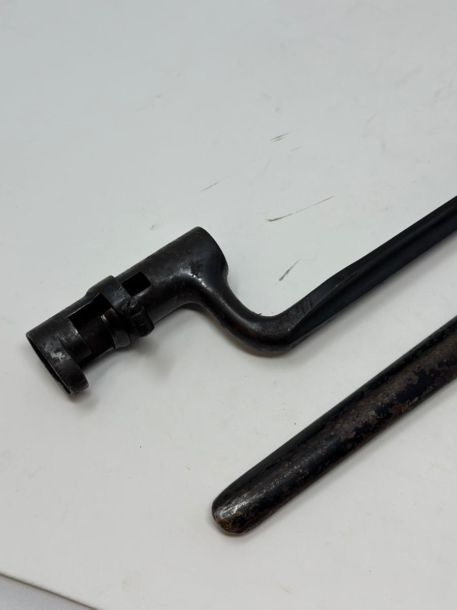 This is a US 45/70 Trapdoor Springfield Bayonet Scabbard with a National Guard Pennsylvania (NGP) brass frog. It was designed for the .45-70 Springfield trapdoor rifle most likely from the Indian Wars era. Likely patented by Mckenney's, this type of scabbard is a rare find because during WWII many surviving Model 1873's were cut up to make trench daggers.