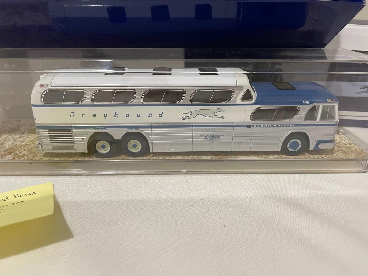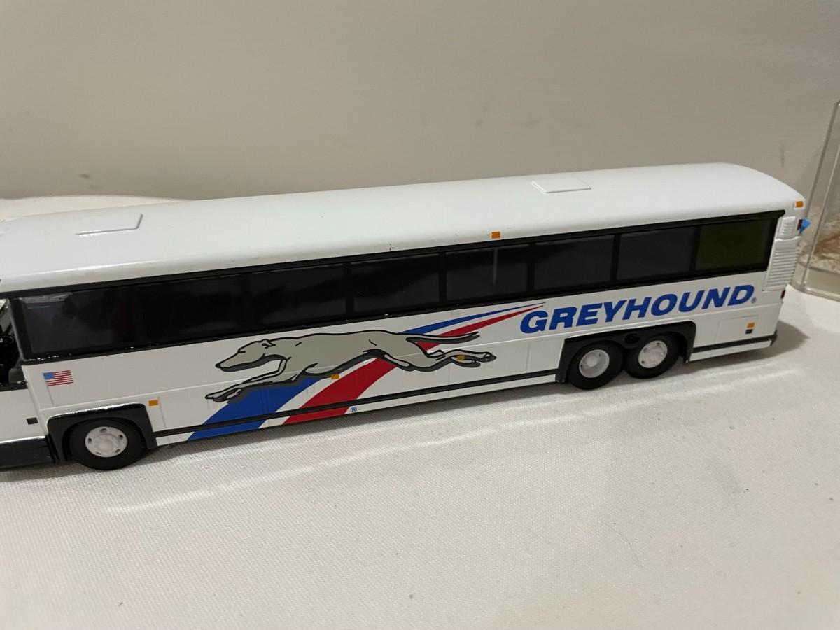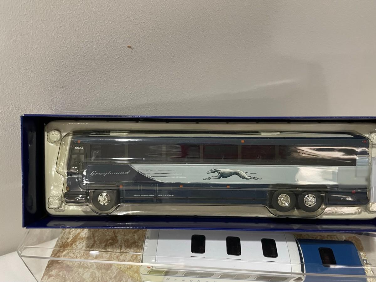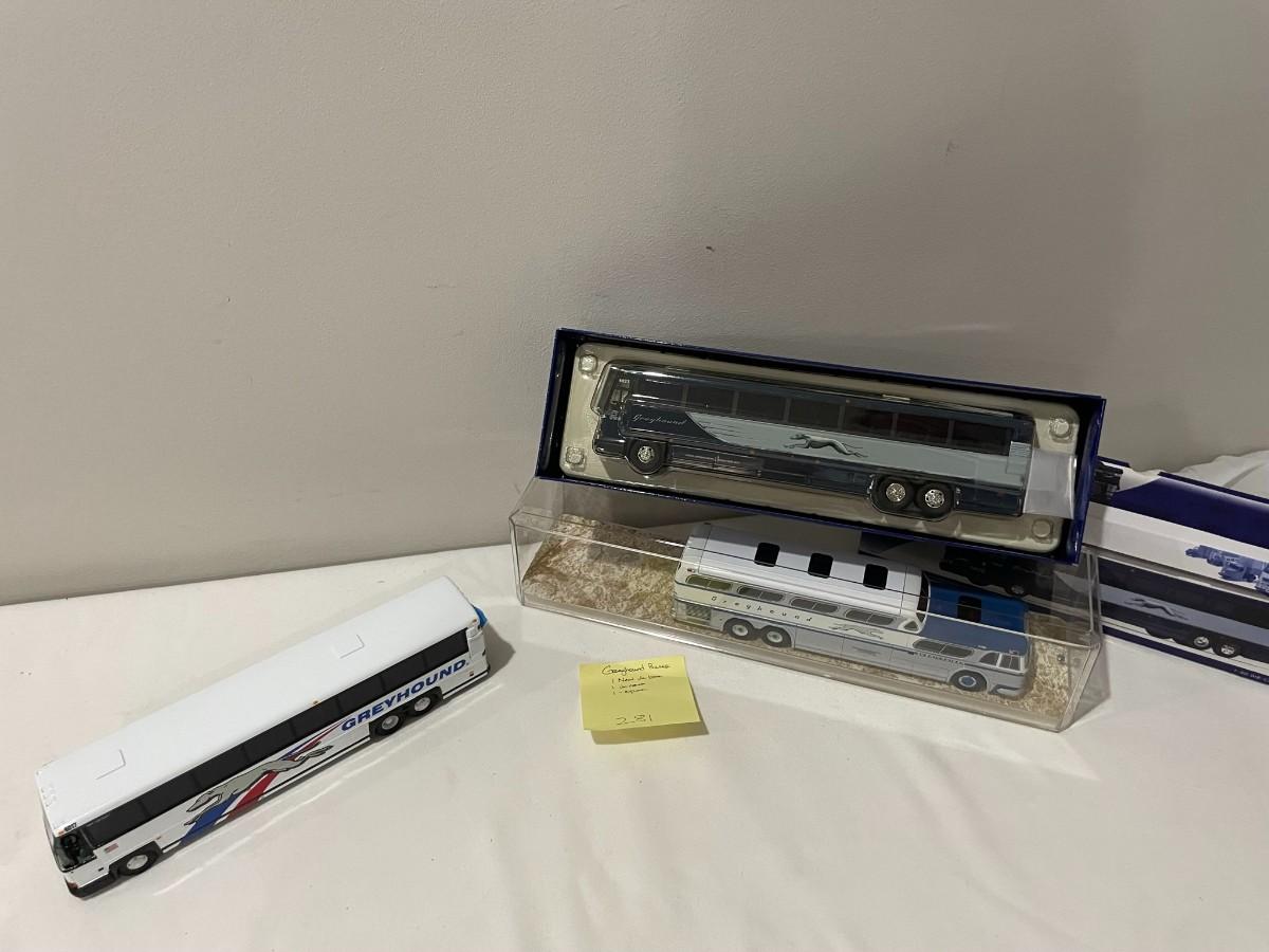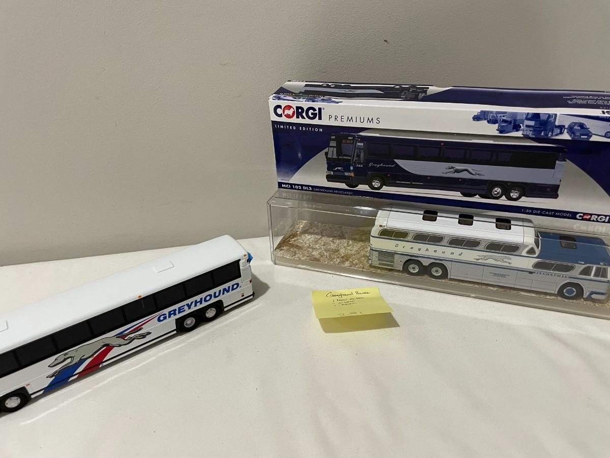 3 Greyhound Buses Diecast with 1 in case, 1 not in cae or box, 1 New in the Box