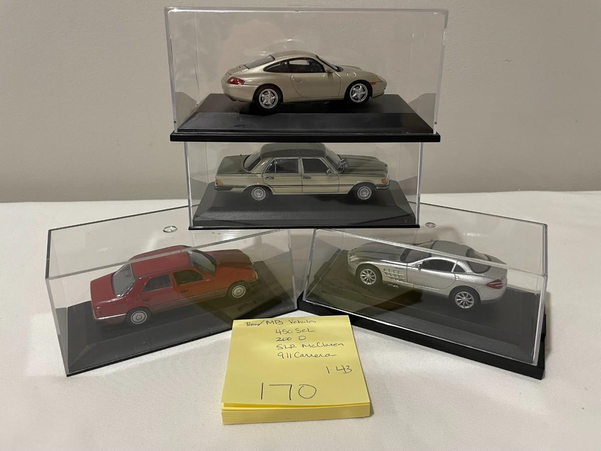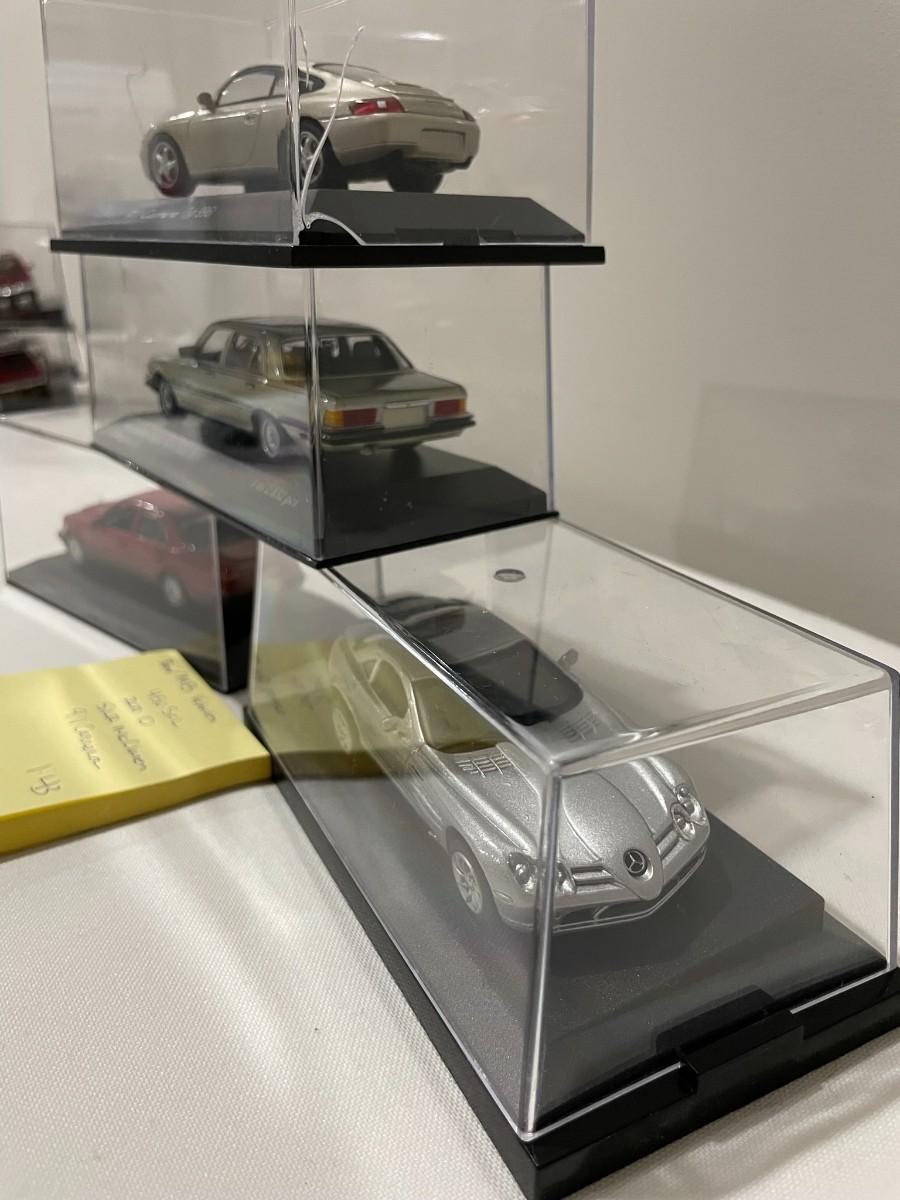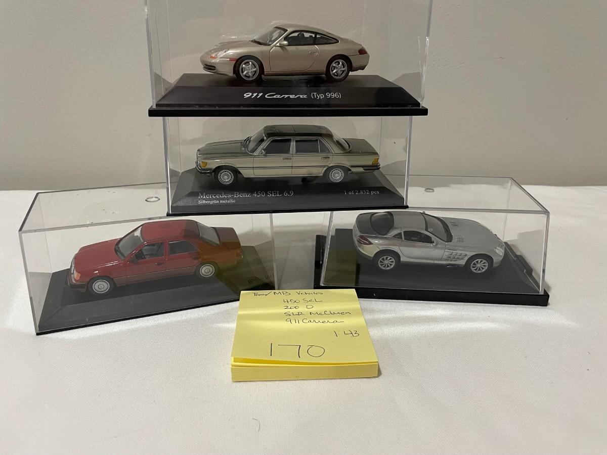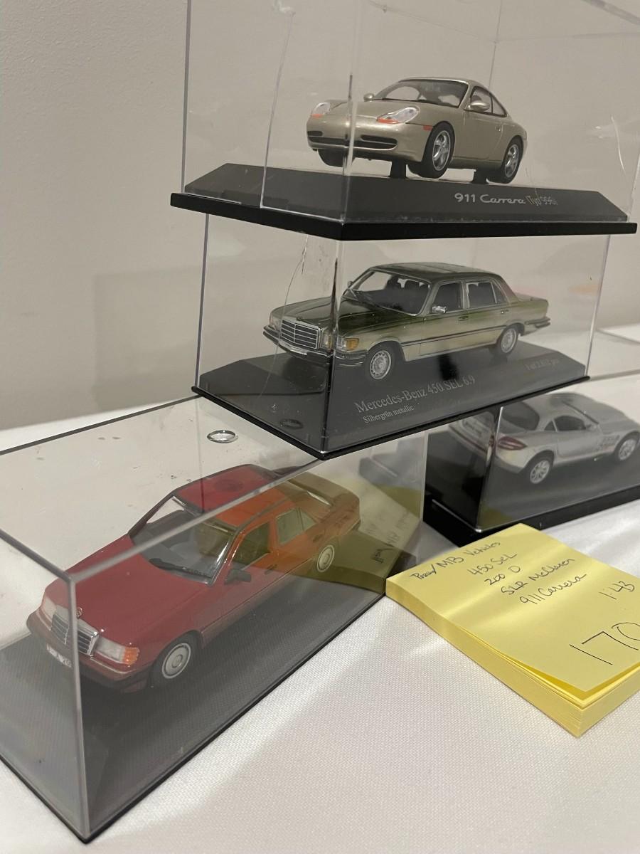 4 Misc Model Cars, 450 Sel, 200 O, SLR McClaren, 911 Carrera Diecast in case - 1:43 Scale