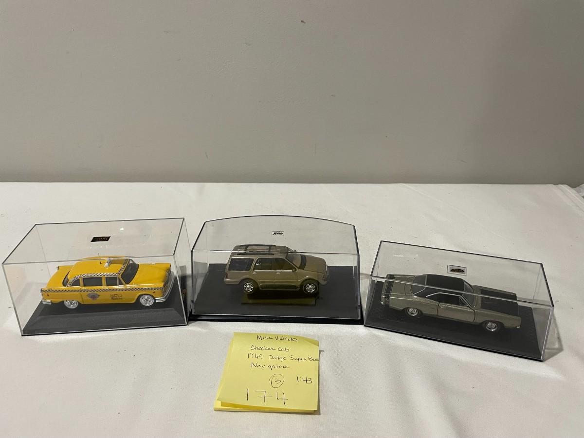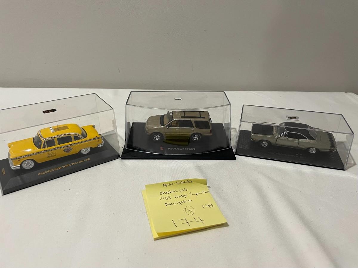 3 Misc Vehicles, Checker Cab, 1969 Dodge Super Bee, Lincoln Navigator Diecast in case - 1:43 Scale