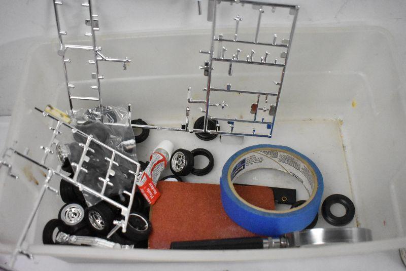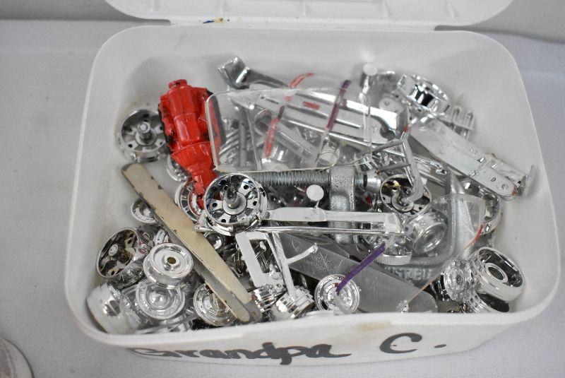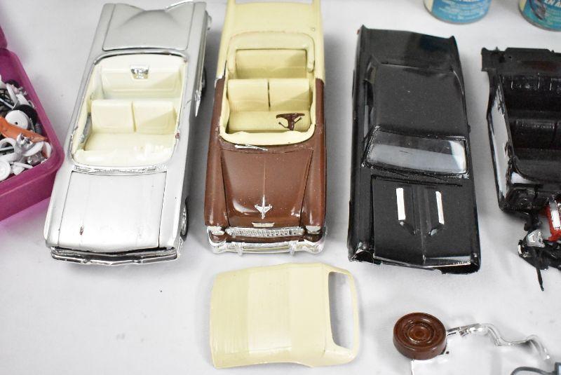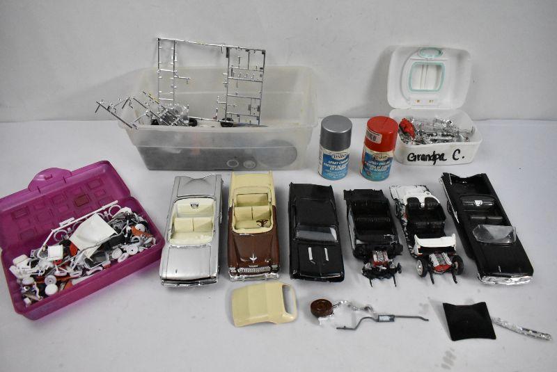 Model Cars in Various Stages of Completion, with Lots of Pieces and Parts