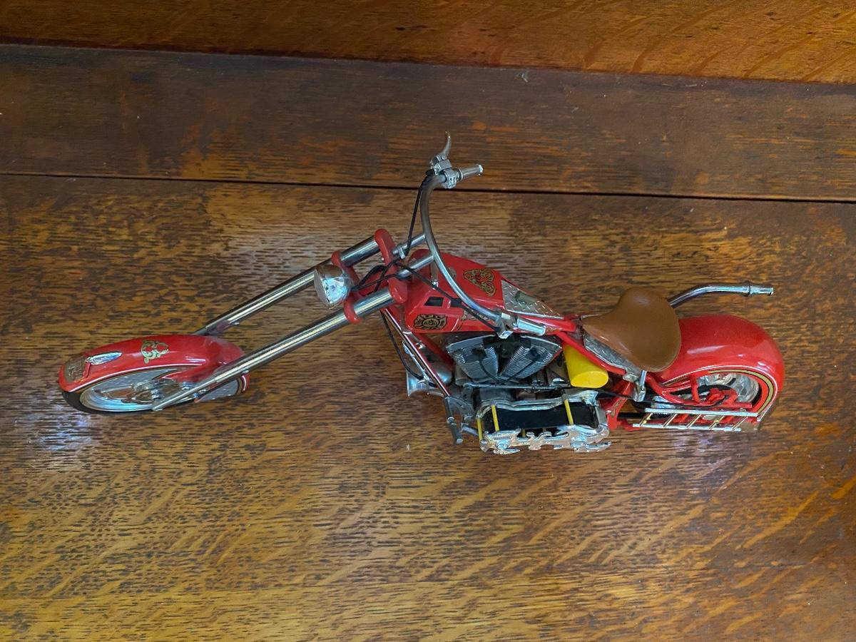 Model Harley Davidson Motocycle with Fire Dept Logos. Says “The Bravest 343” on back fender. 12 1/2" L x 4 1/2" H. Many movable parts. Missing clutch lever; otherwise in great condition. Very collectible.
