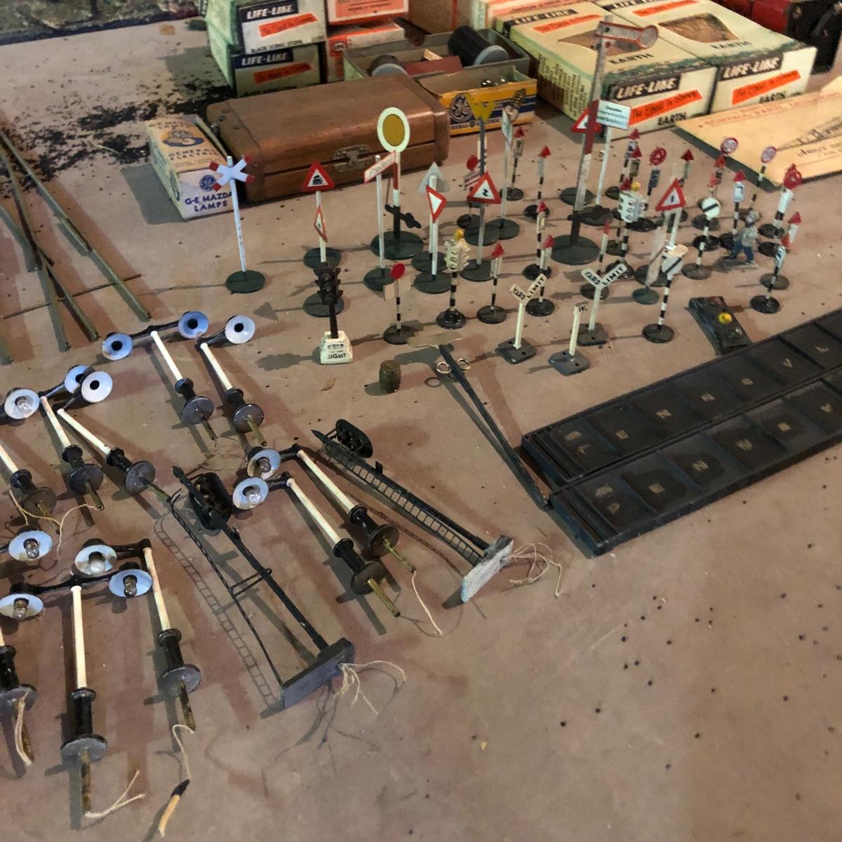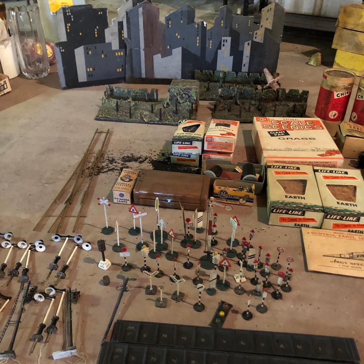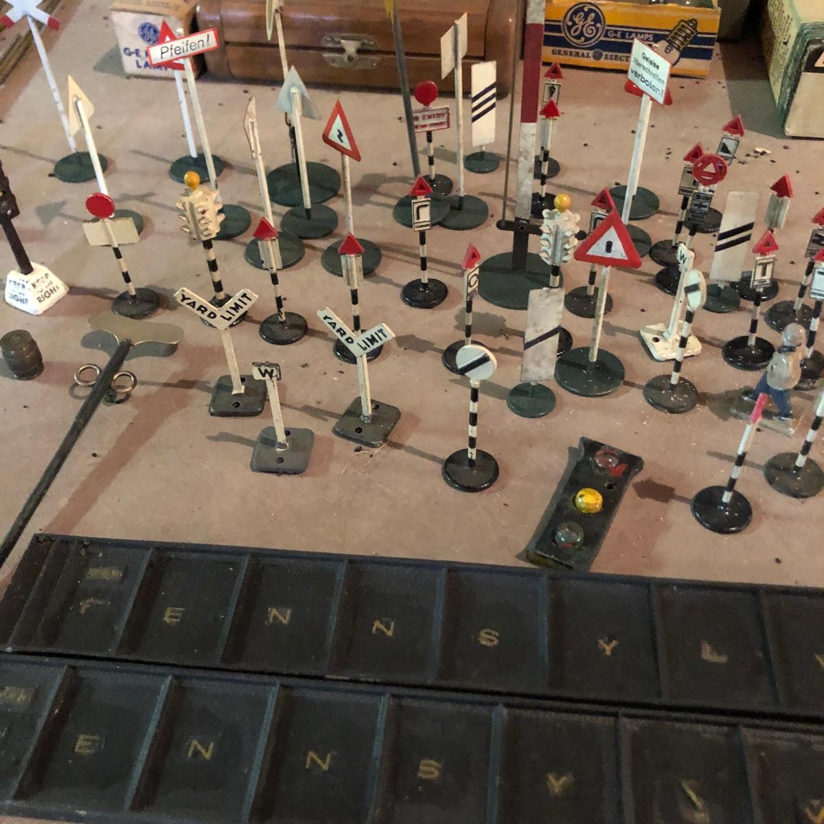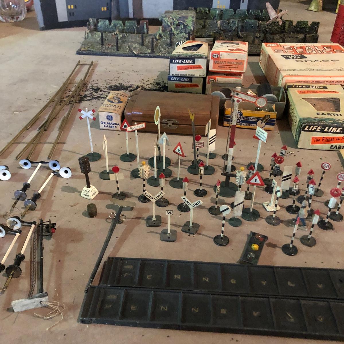 Lot contains a large selection of metal street signs, traffic light and railroad signals with some being marked Dinky Toys. Also includes streetlights, vintage boxes of earth, stone, grass and more.