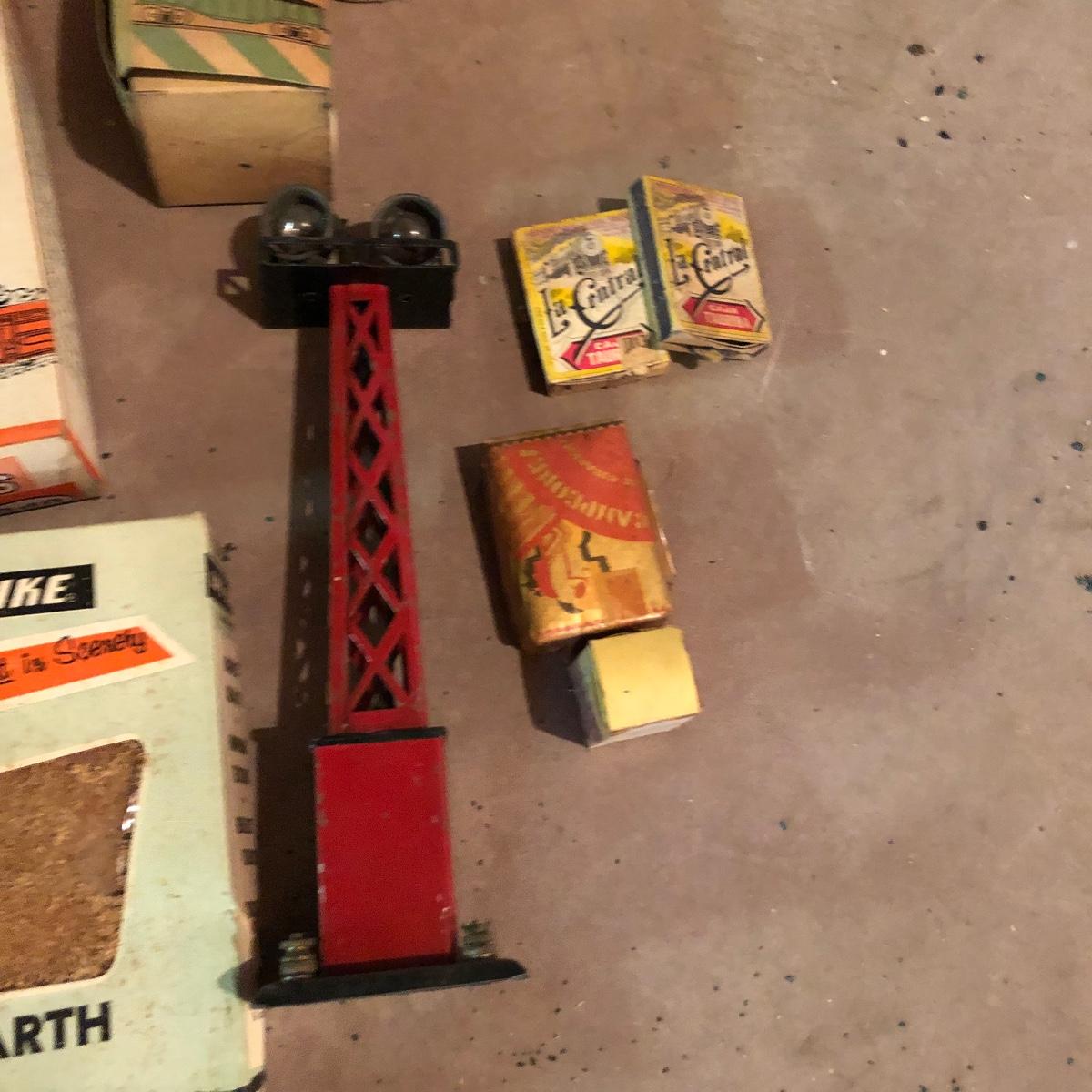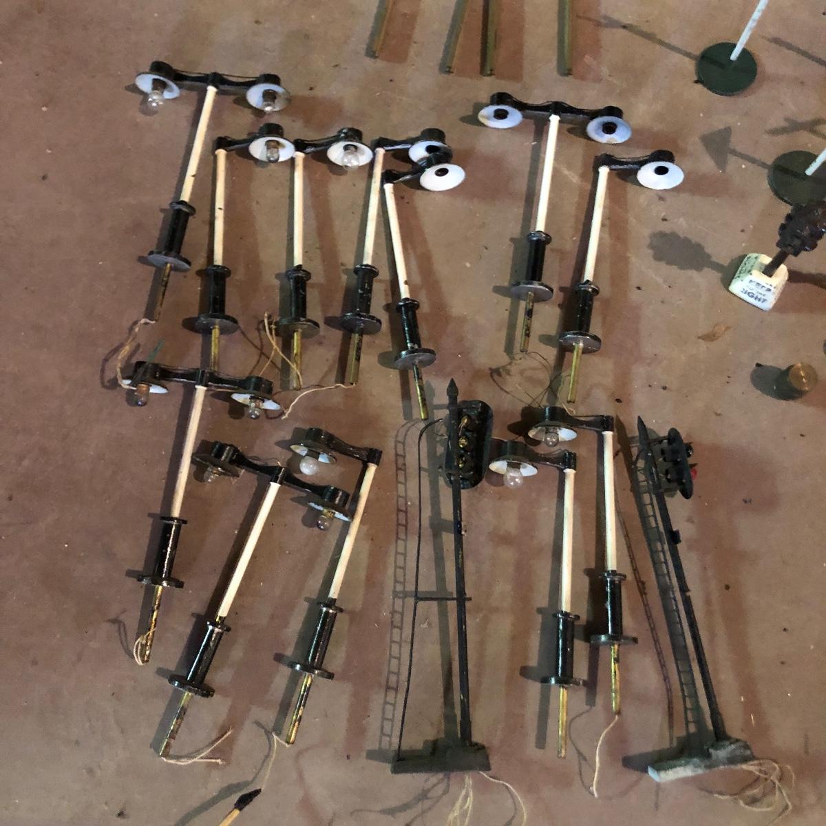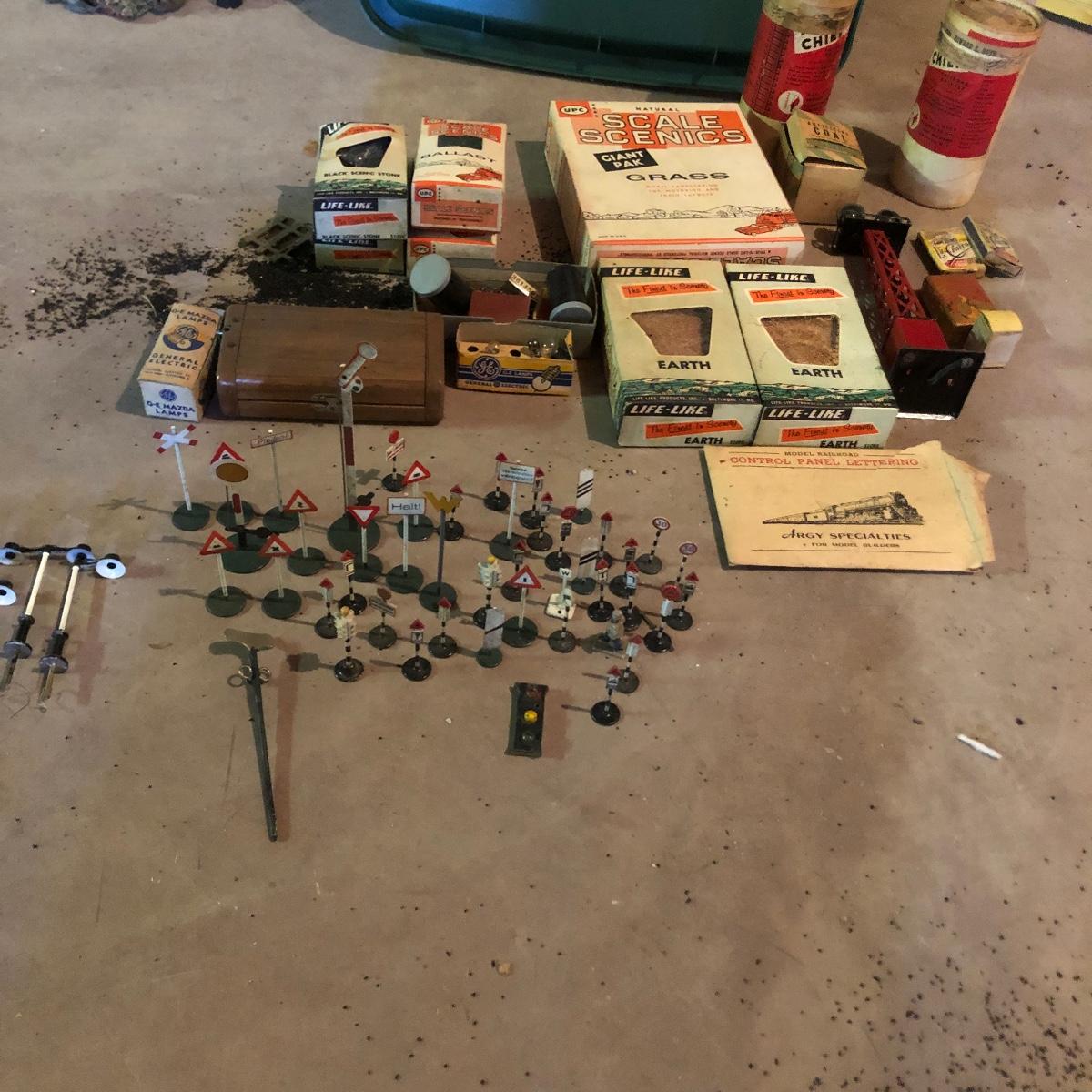Lot contains a large selection of metal street signs, traffic light and railroad signals with some being marked Dinky Toys. Also includes streetlights, vintage boxes of earth, stone, grass and more.