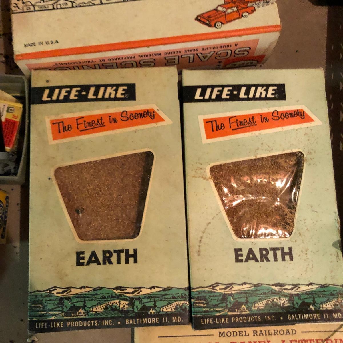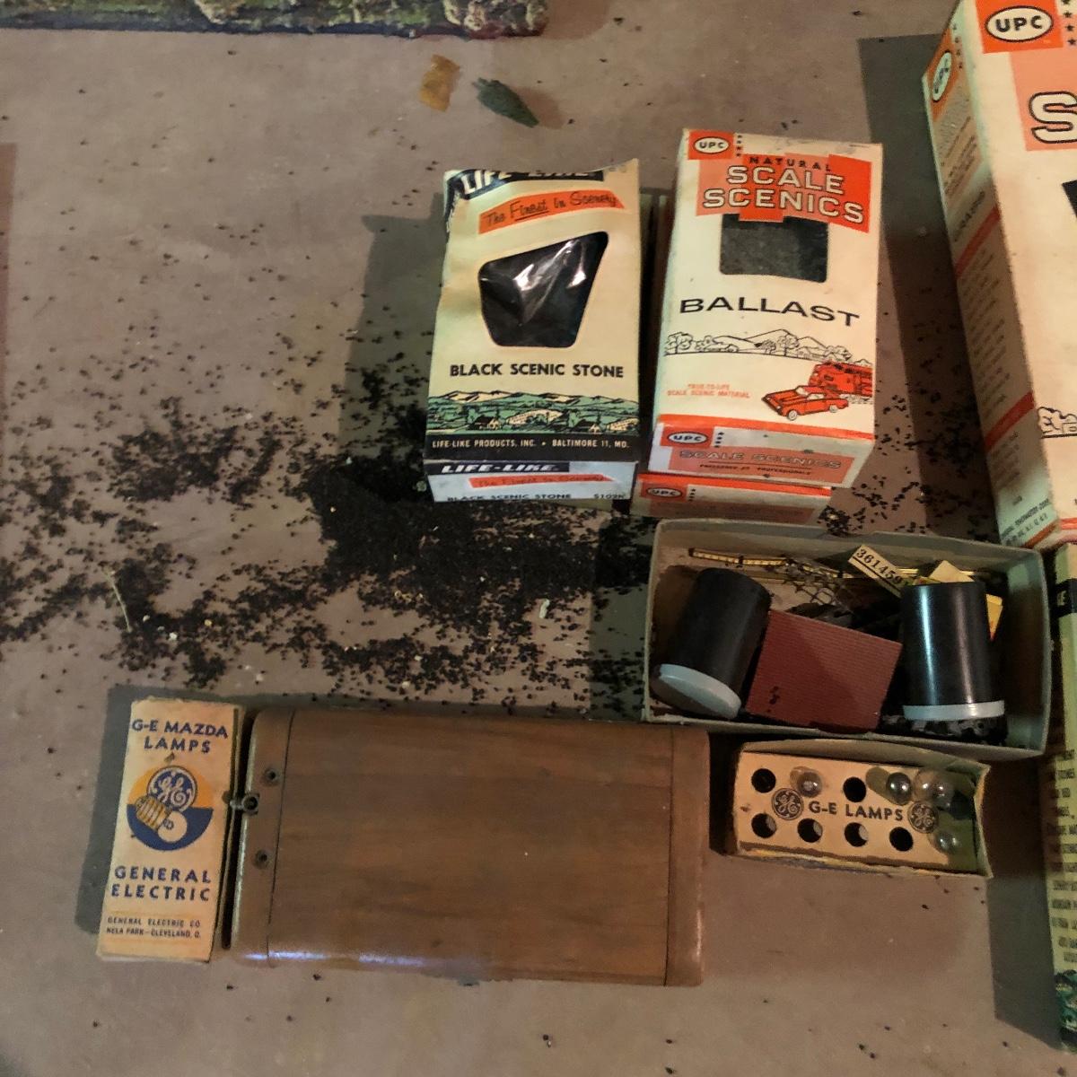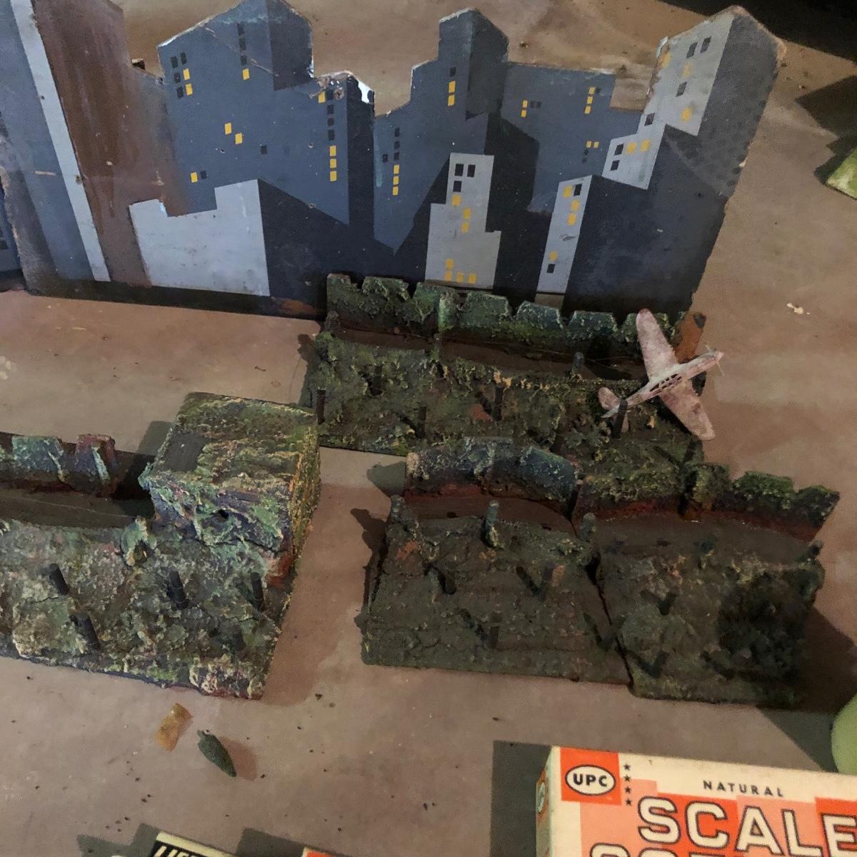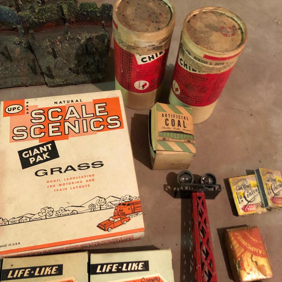 Lot contains a large selection of metal street signs, traffic light and railroad signals with some being marked Dinky Toys. Also includes streetlights, vintage boxes of earth, stone, grass and more.