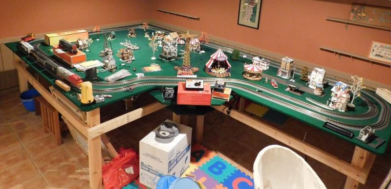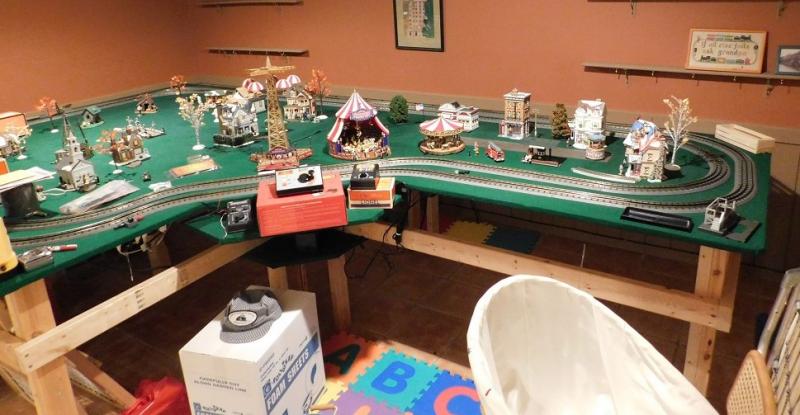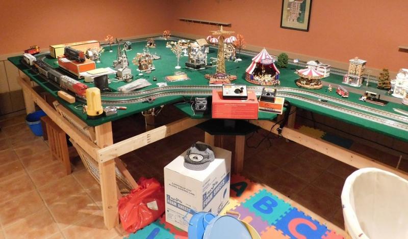 Model Train Track and Village Platform with Electric and Switch Kit 8'x8' square and 4'x5' on extension. Includes the track, 2x4 stand, green felt, electric hook up, lighting, top boards, and switch kit. DOES NOT include trains or cars, village pieces, or carnival pieces. Easy break down.
