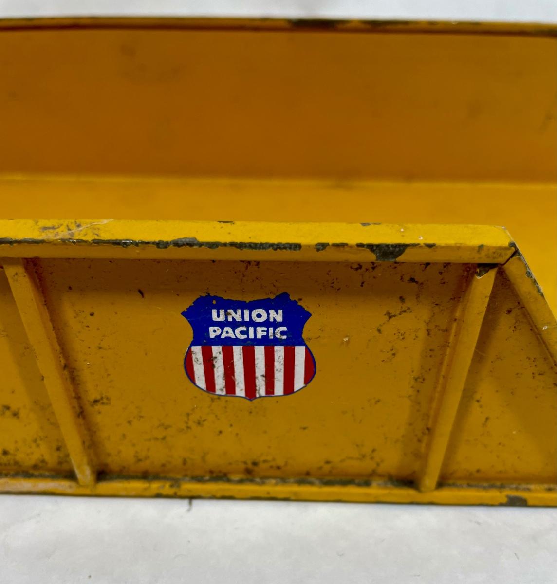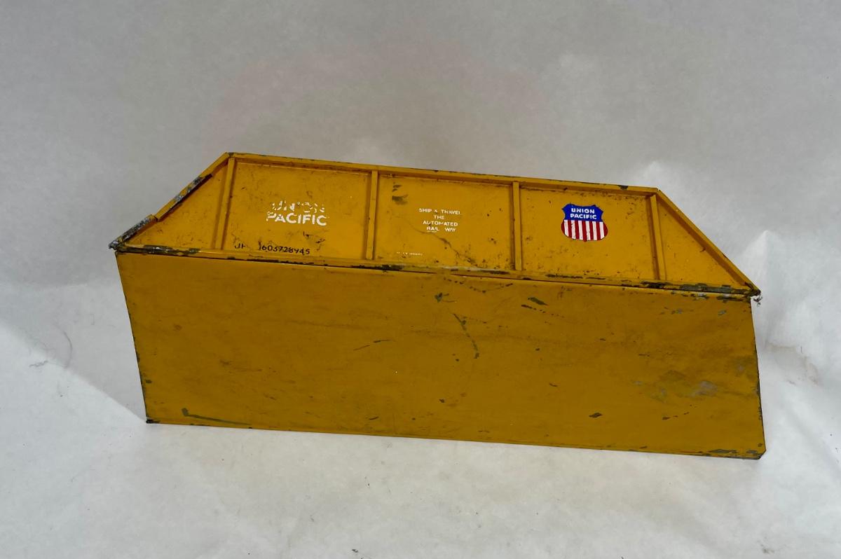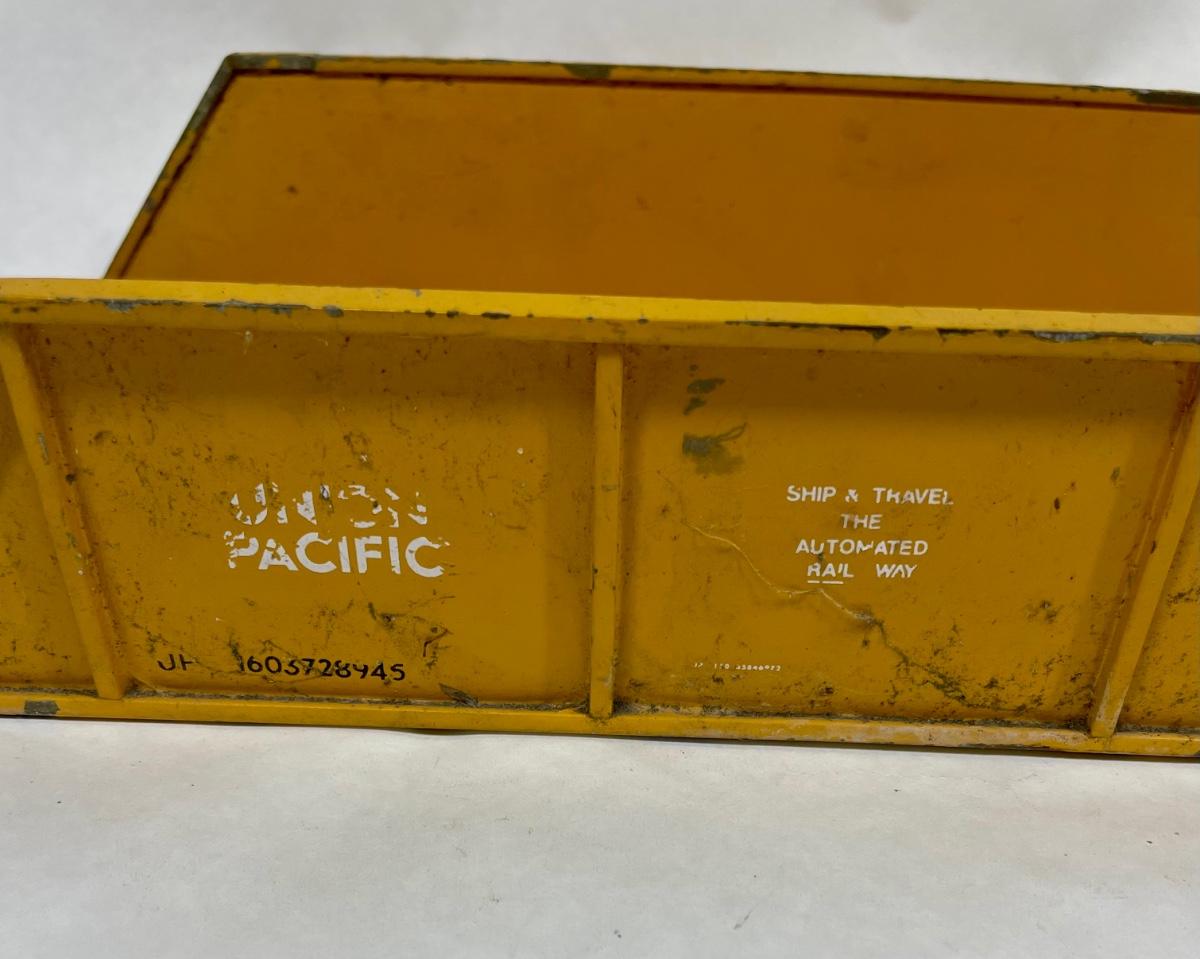 Metal construction, with authentic Union Pacific railroad logo on the sides, as well as life-life lettering and stenciling. Some paint chipping but no rust or damage.