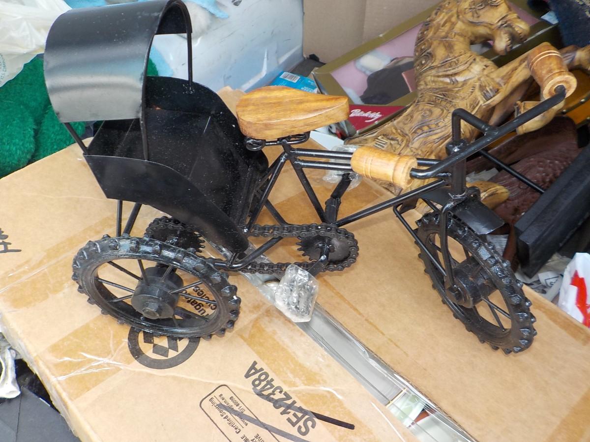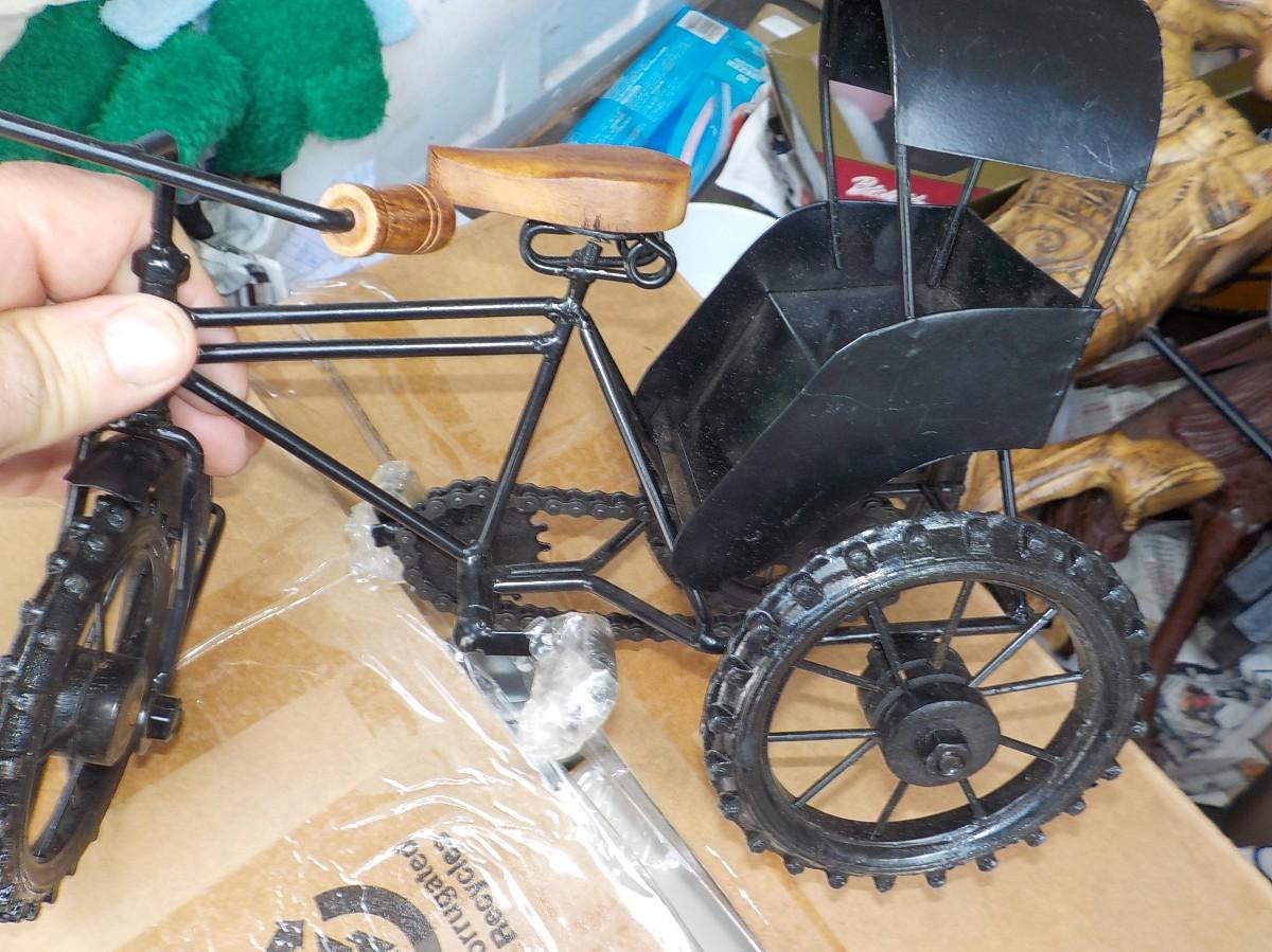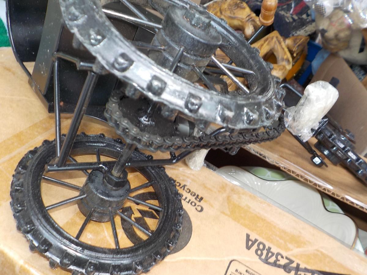Actually has real chain for wheels and moves when pedaling. Stand 10 in by 14 in.