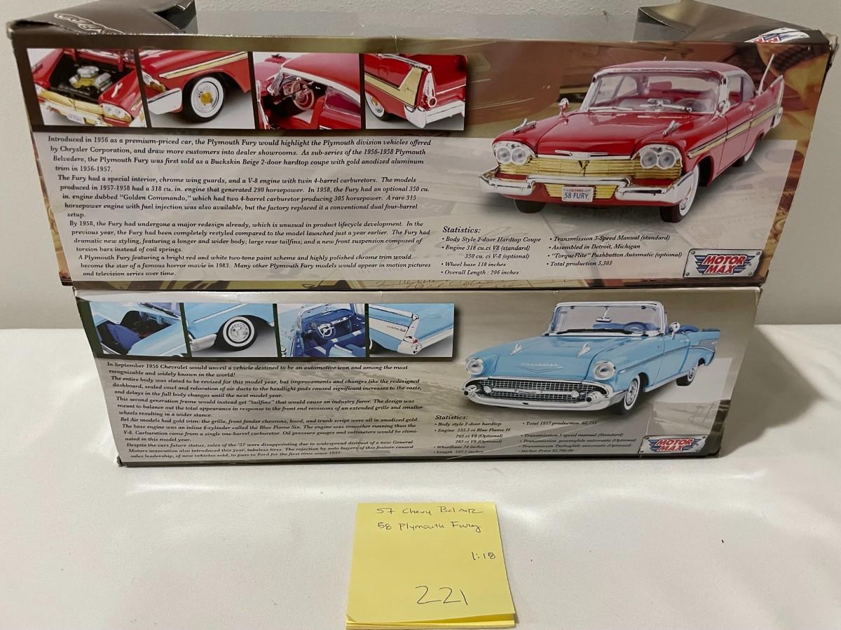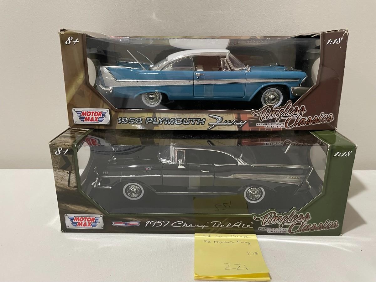 1957 Chevy Bel Aair, 1958 Plymouth Fury Diecast- New in Box - 1:18 Scale