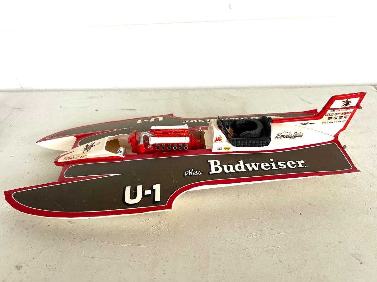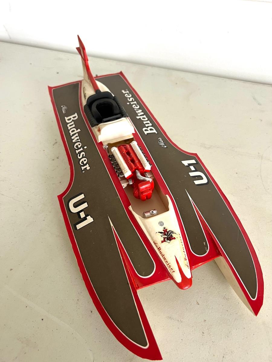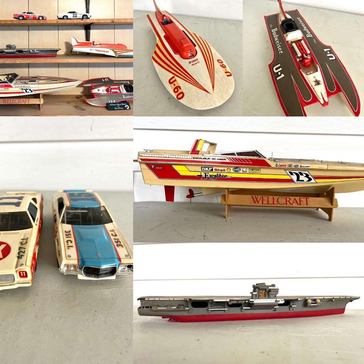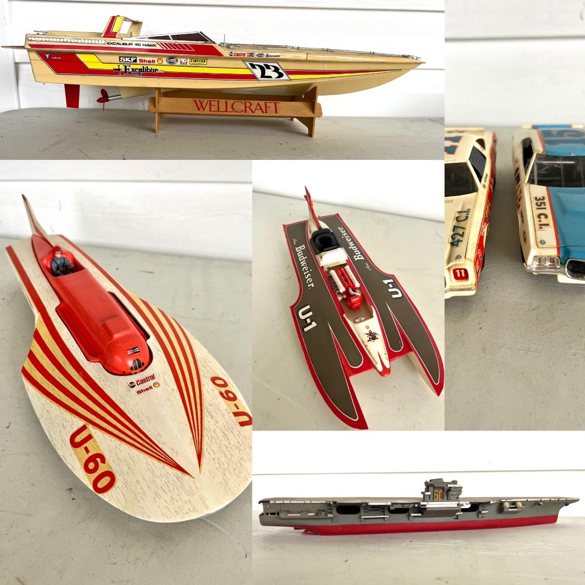 6 Piece Model Lot. Wellcraft Excalibur model measures 28 1/2 inches long and 8 inches wide. Miss Thriftway U60 measures 18 inches long and 8 inches wide. Budweiser U-1 Measures 14 inches long and 7 inches wide. Ship measures 20 1/2 inches long 5 inches wide. Model cars 8 inches long 3 inches wide. All models are in various condition, being sold as decorative items.see pictures.