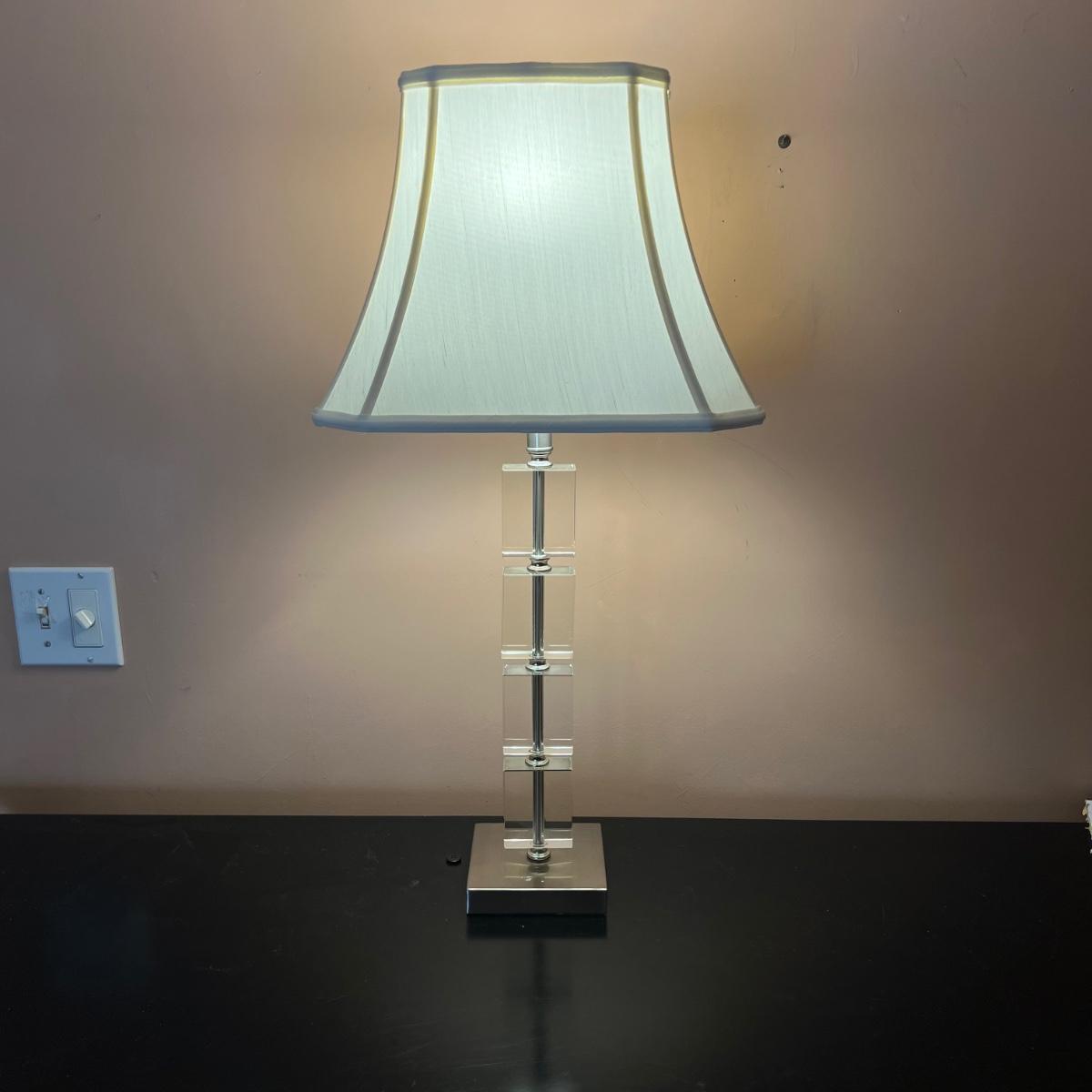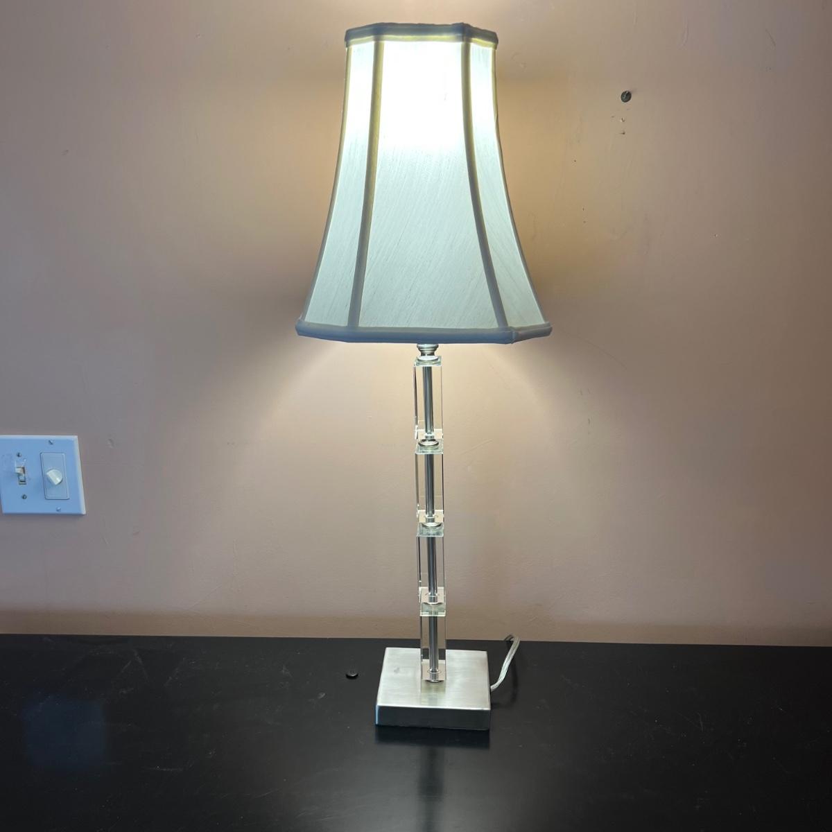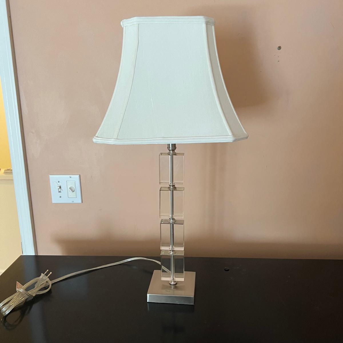 Modern table/dresser/nightstand lamp with a silver 5” square base and 4 acrylic-like cubes measures 28”H. The shade appears to be white linen. Lamp powered on when plugged in. Local Pick Up only.
