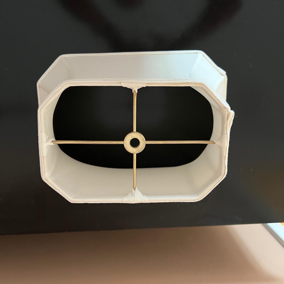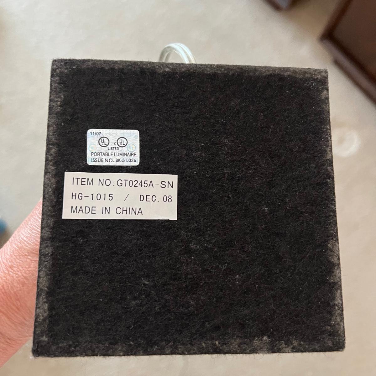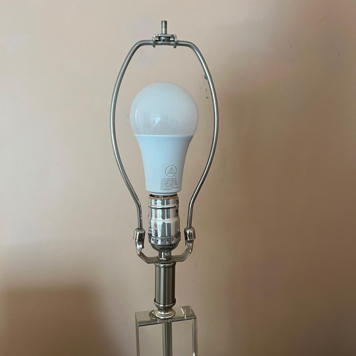 Modern table/dresser/nightstand lamp with a silver 5” square base and 4 acrylic-like cubes measures 28”H. The shade appears to be white linen. Lamp powered on when plugged in. Local Pick Up only.