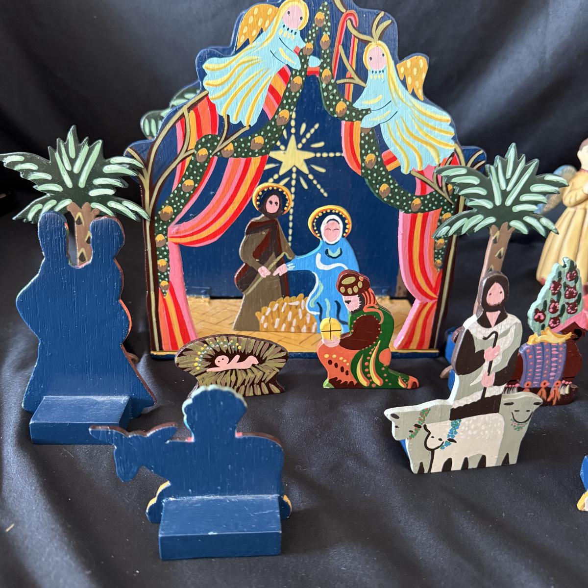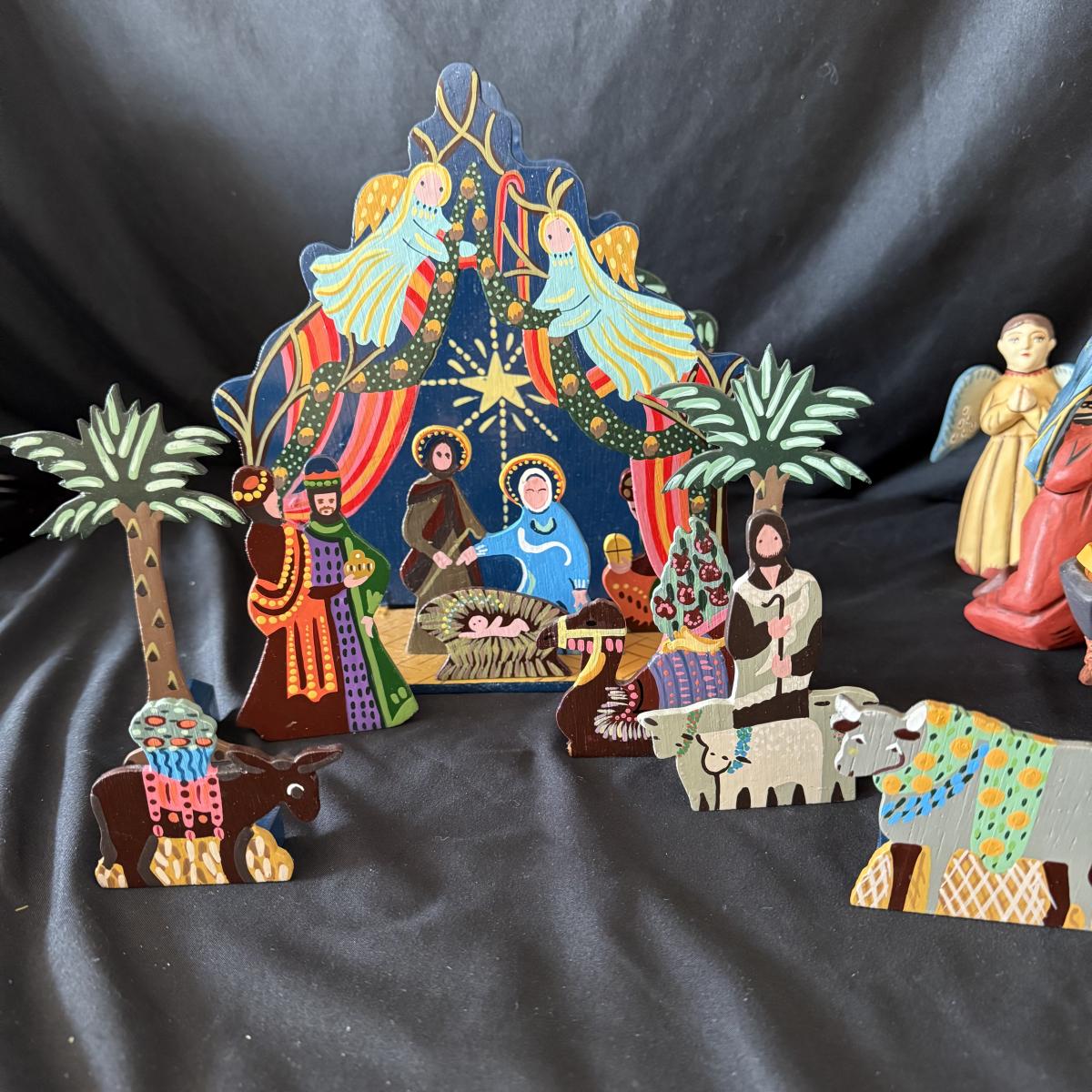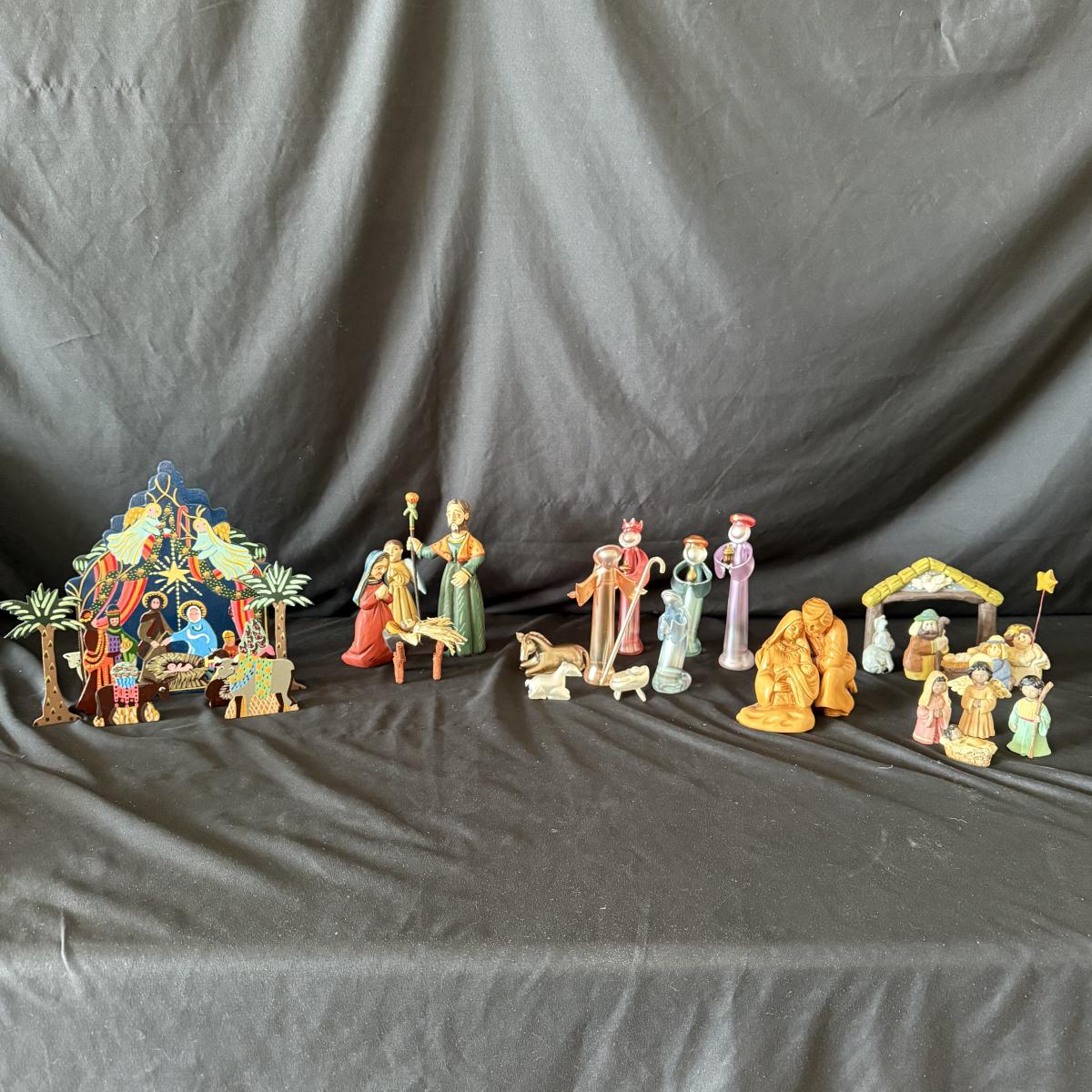 This lot contains a collection of six nativity scenes all made in a variety of styles and materials varying from painted wood, to glass, to clay, to plastic. The largest piece is the manger of the painted wooden set and it measures 7.75” x 3.5” x 9”H. See pictures for details. Shipping available.