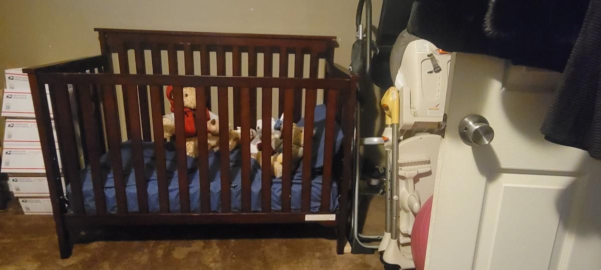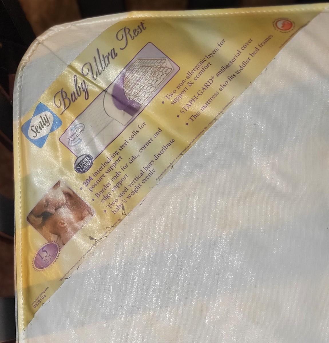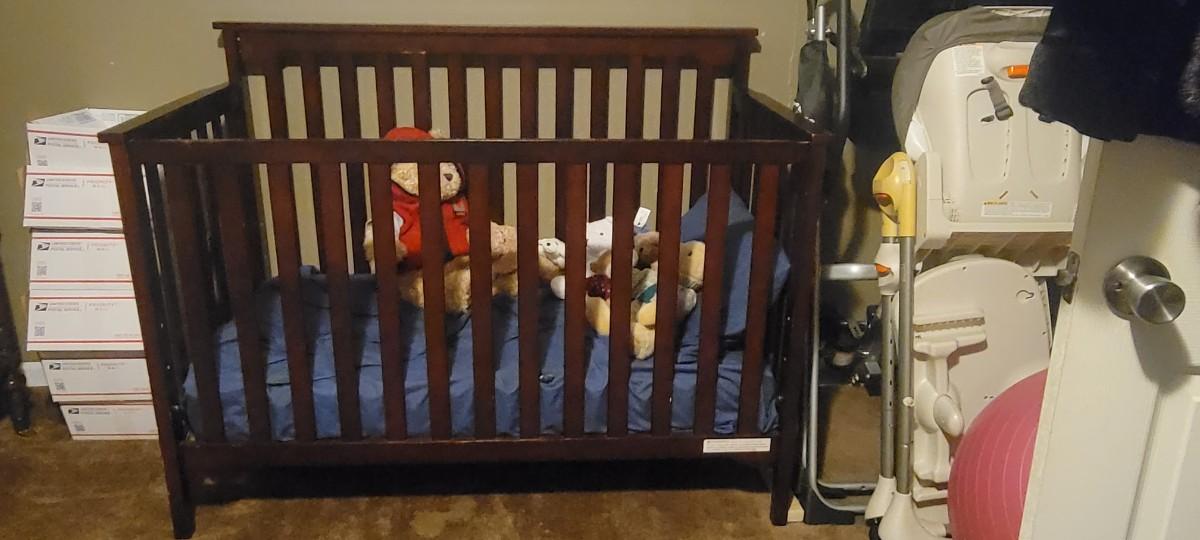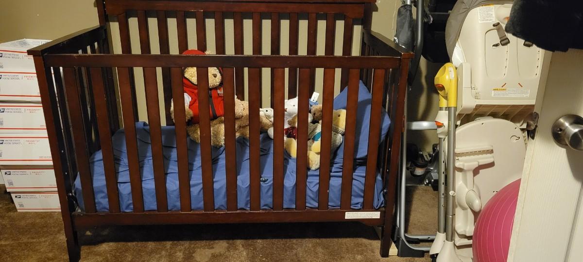 Mattress Height is adjustable. This bed is in great condition but does have a couple of scuffs to the finish. Comes with a Seely mattress. No stains on mattress. Sale of this item does not include the stuffed animals or linens shown in the pics.
