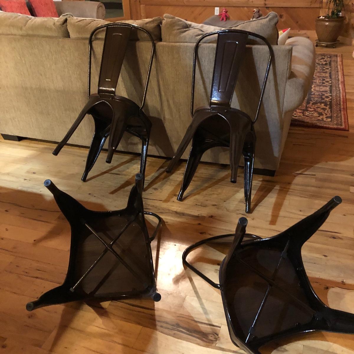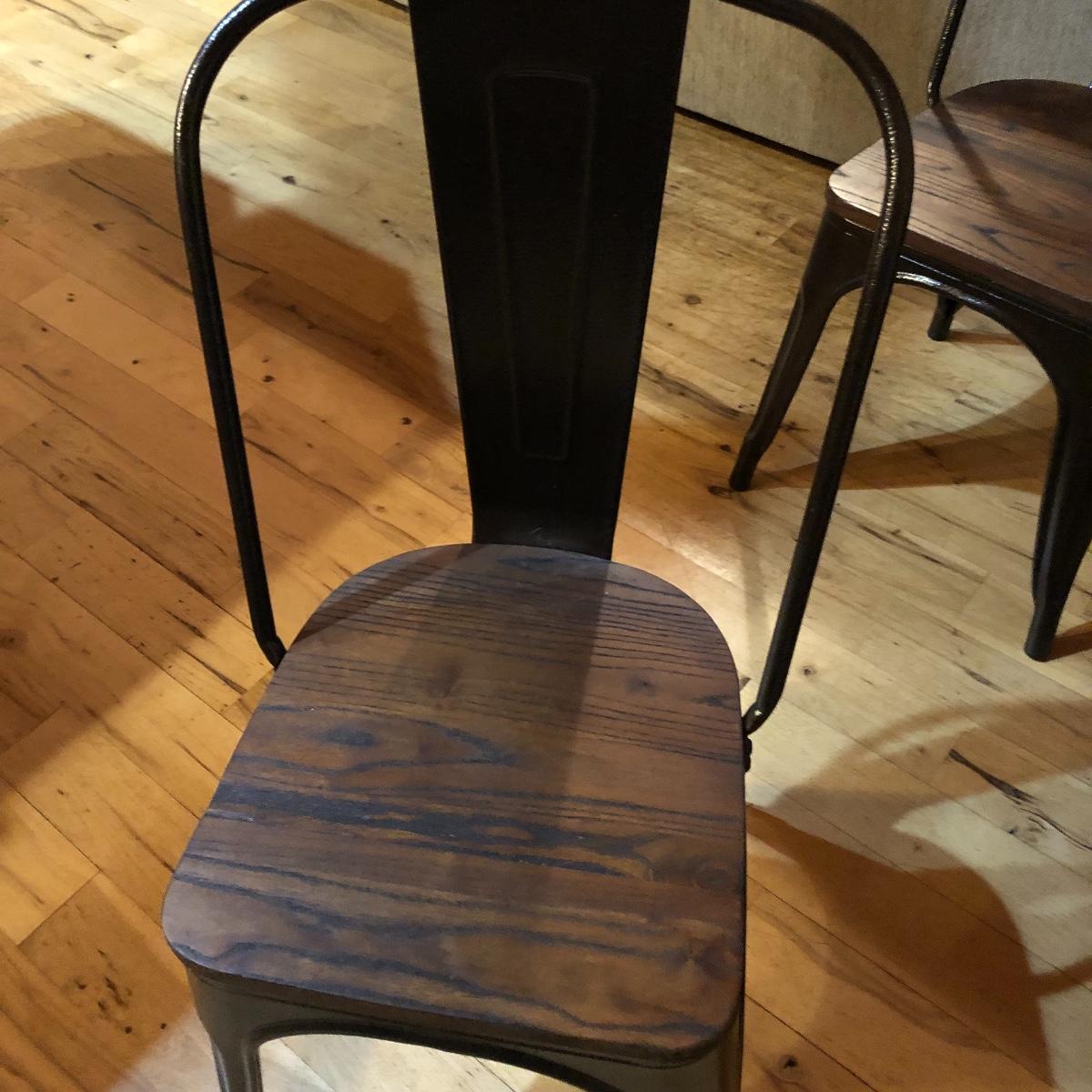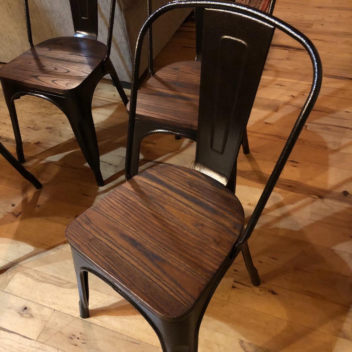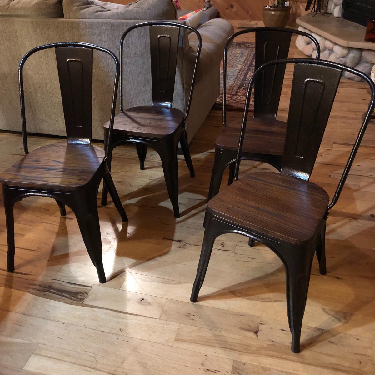 This lot includes four chairs. They have brown metal frames, backs and legs and wood seats. They have plastic caps on the feet of the legs. The chairs measure 17” x 14.5” x 33.5”. Seat height is 17.5”. Local pick up only.