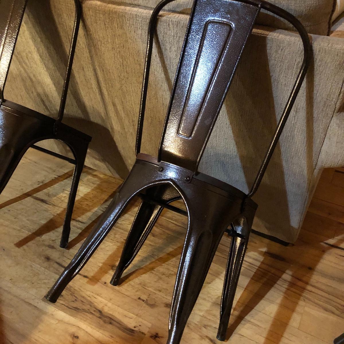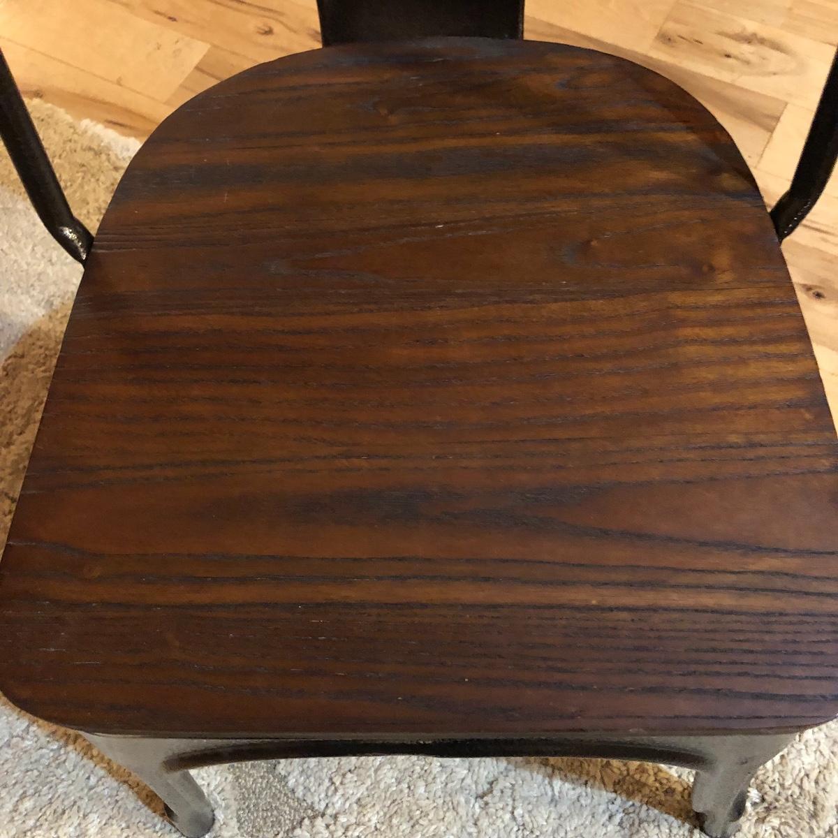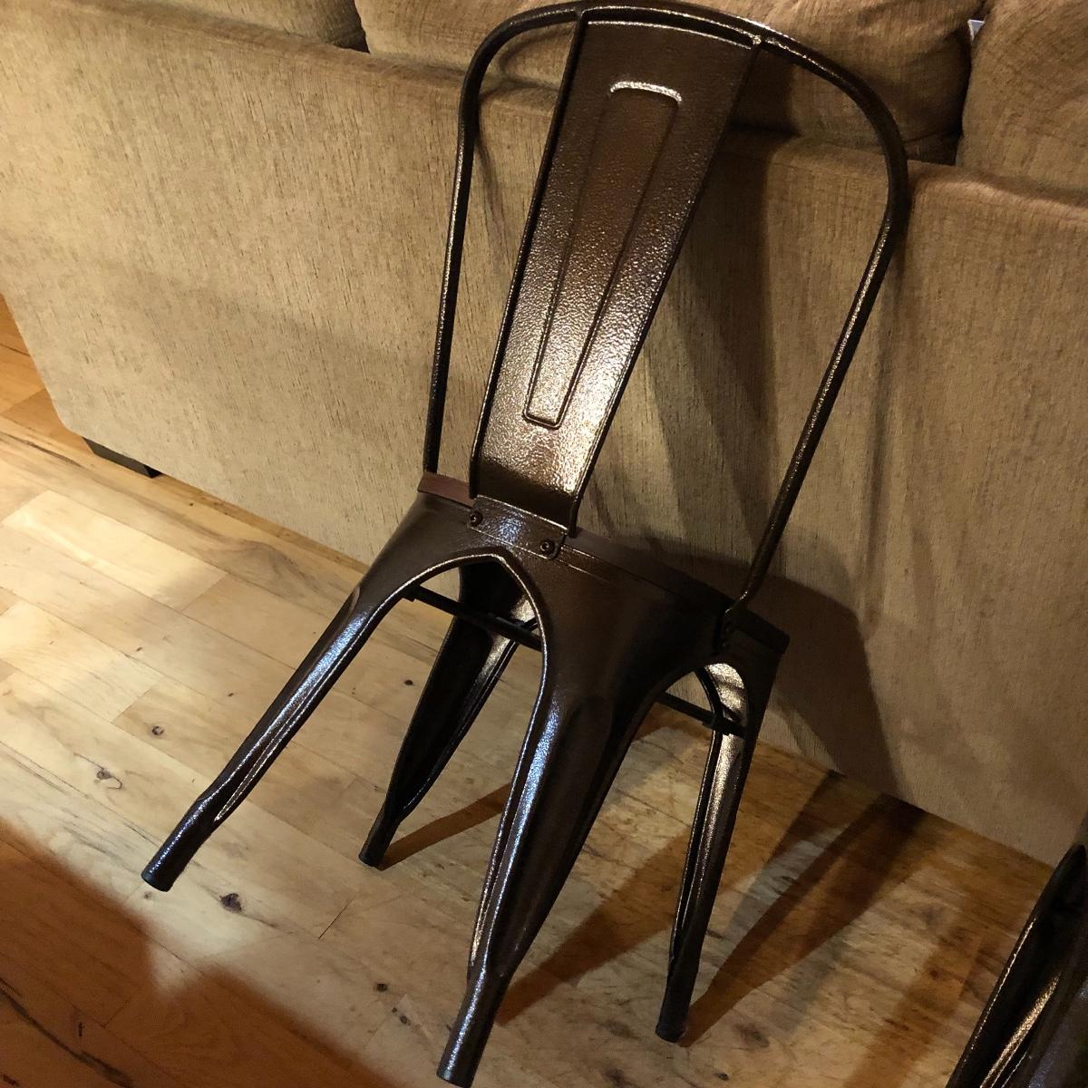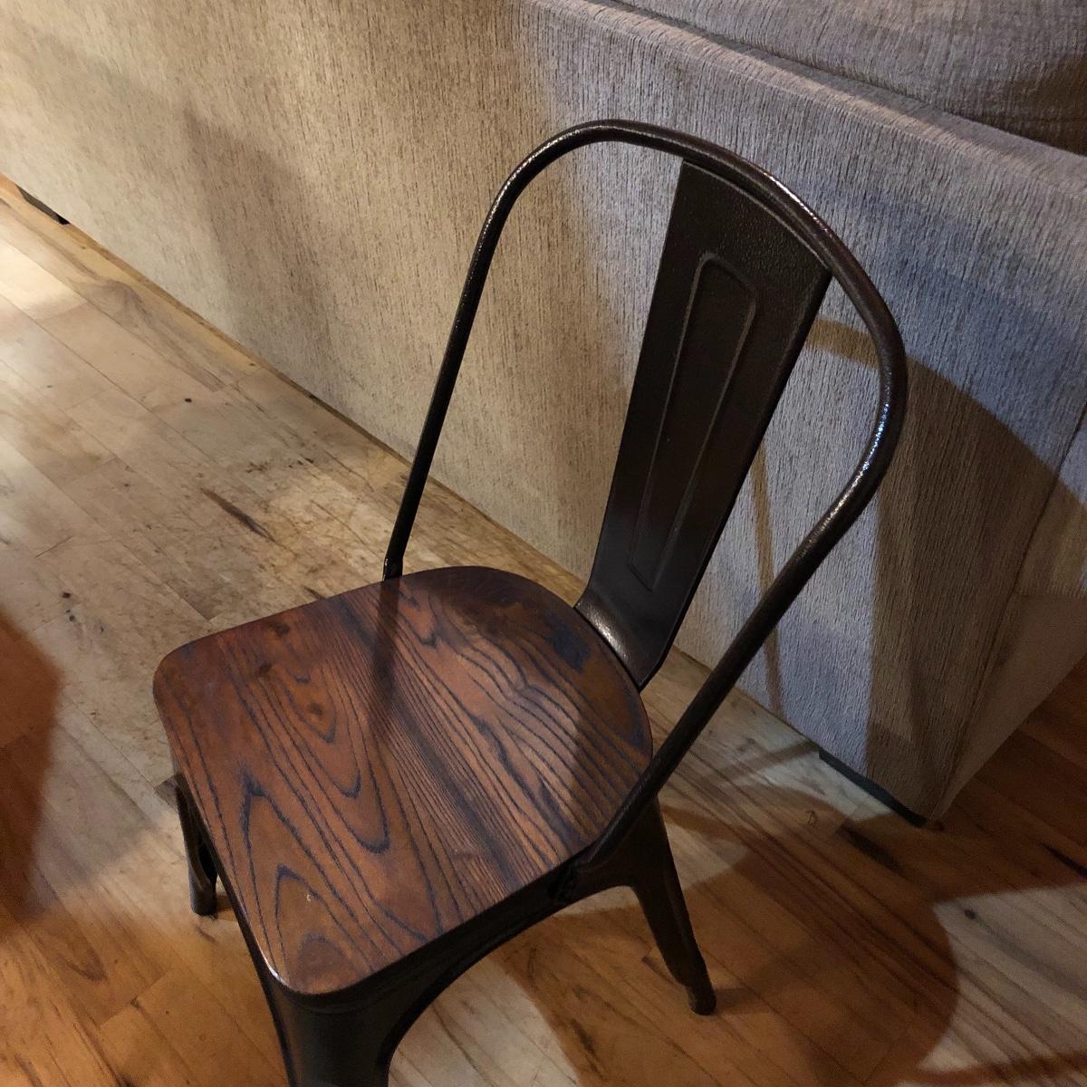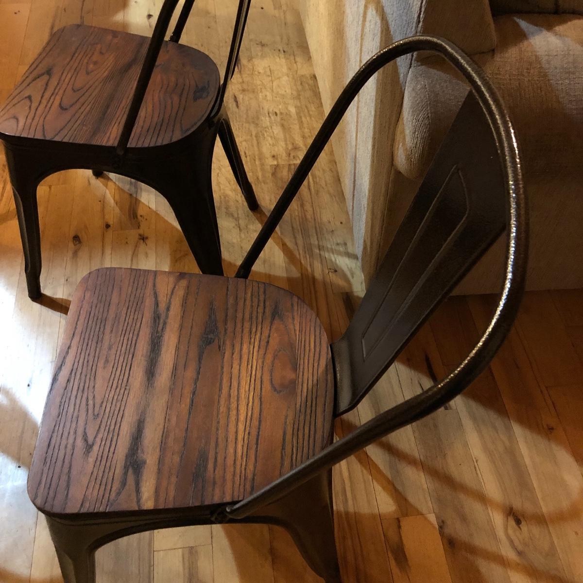 This lot includes four chairs. They have brown metal frames, backs and legs and wood seats. They have plastic caps on the feet of the legs. The chairs measure 17” x 14.5” x 33.5”. Seat height is 17.5”. Local pick up only.