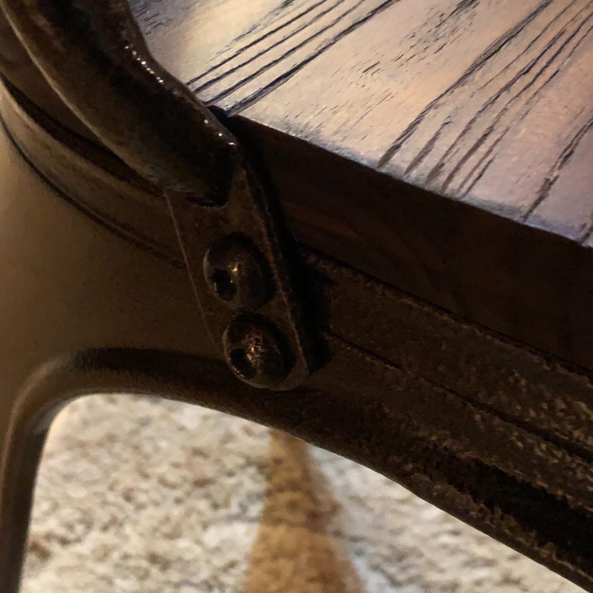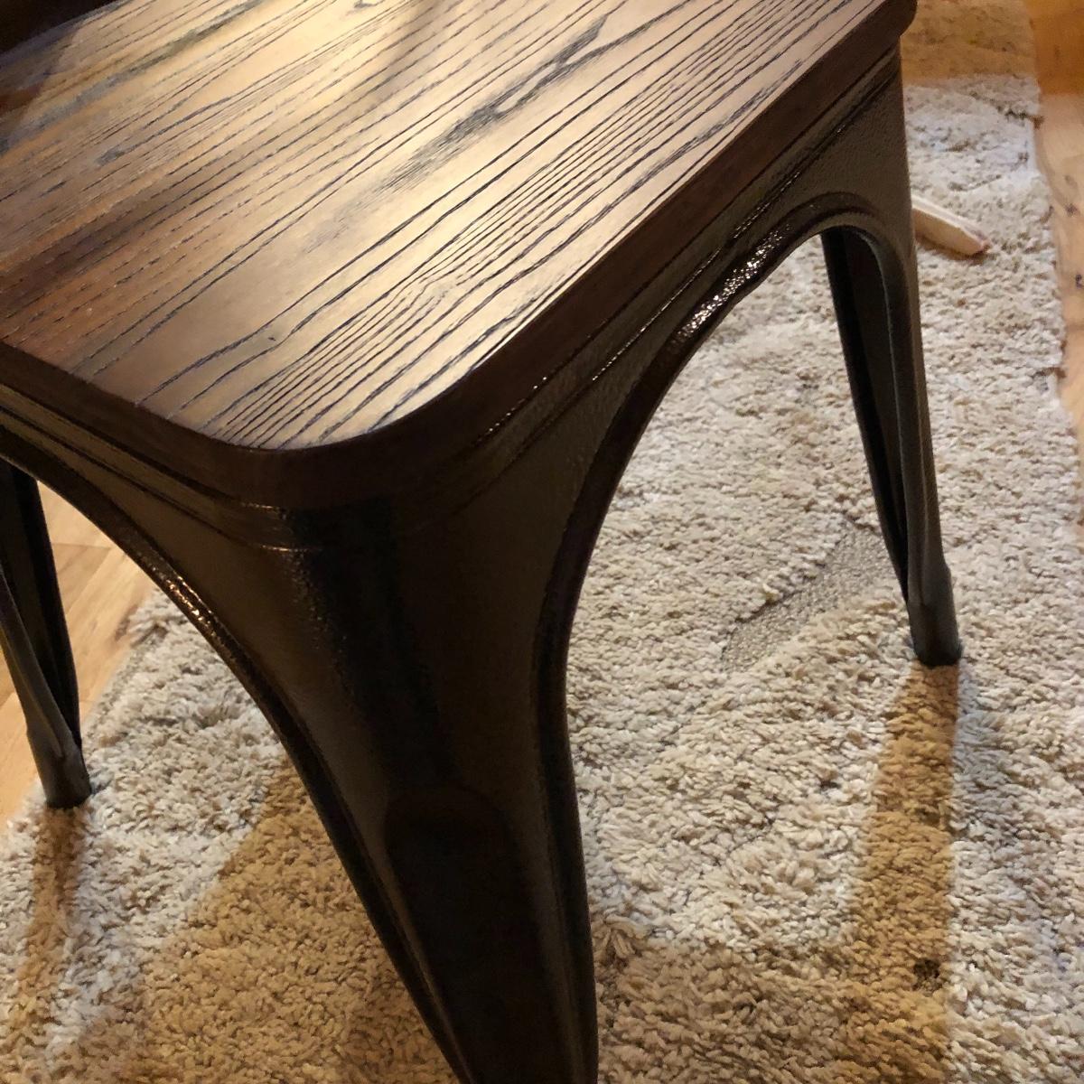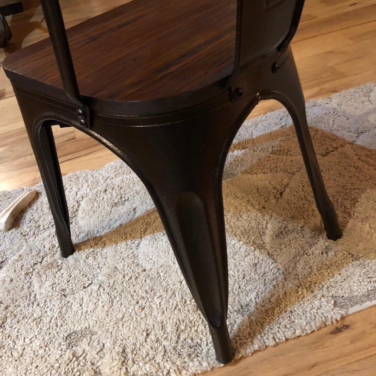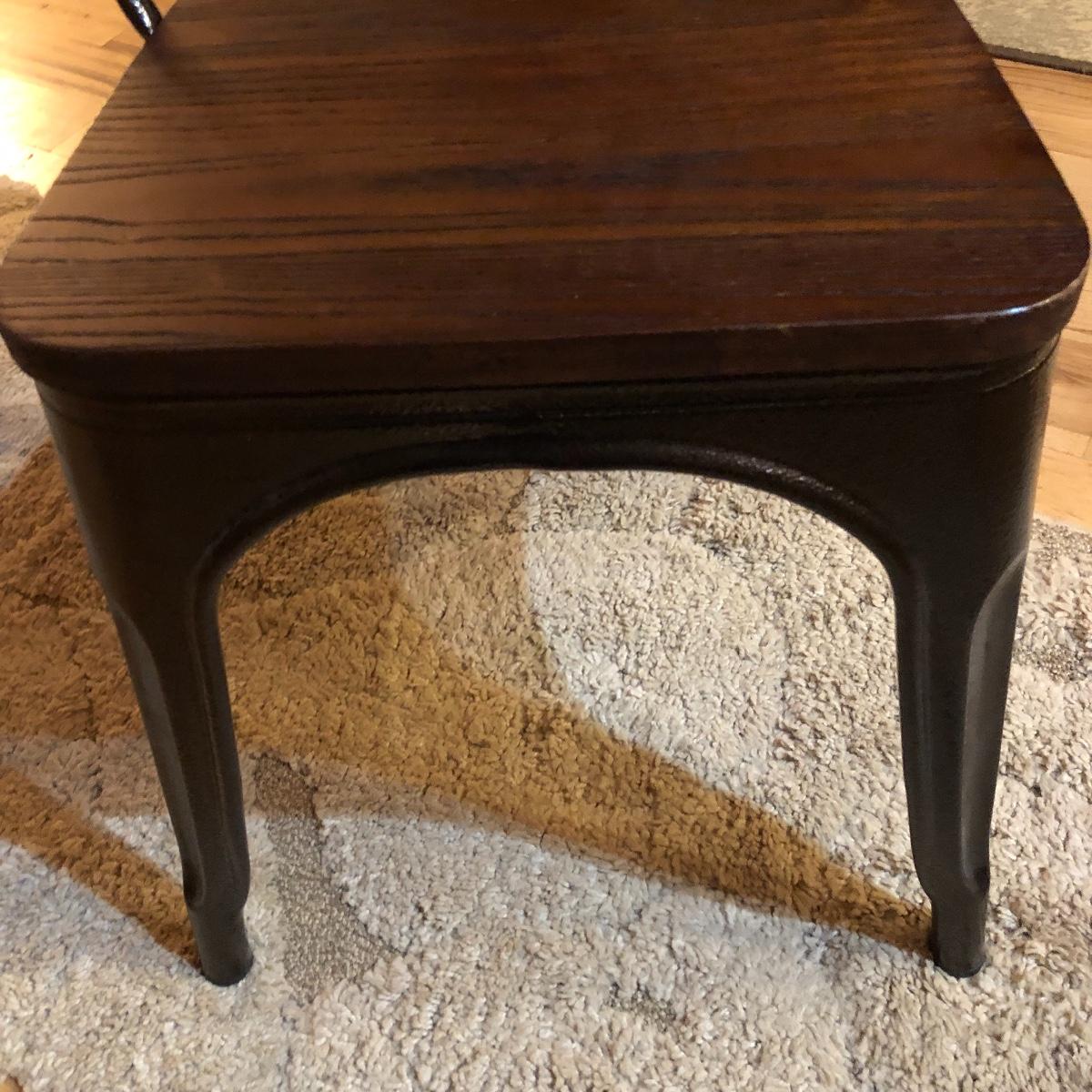 This lot includes four chairs. They have brown metal frames, backs and legs and wood seats. They have plastic caps on the feet of the legs. The chairs measure 17” x 14.5” x 33.5”. Seat height is 17.5”. Local pick up only.
