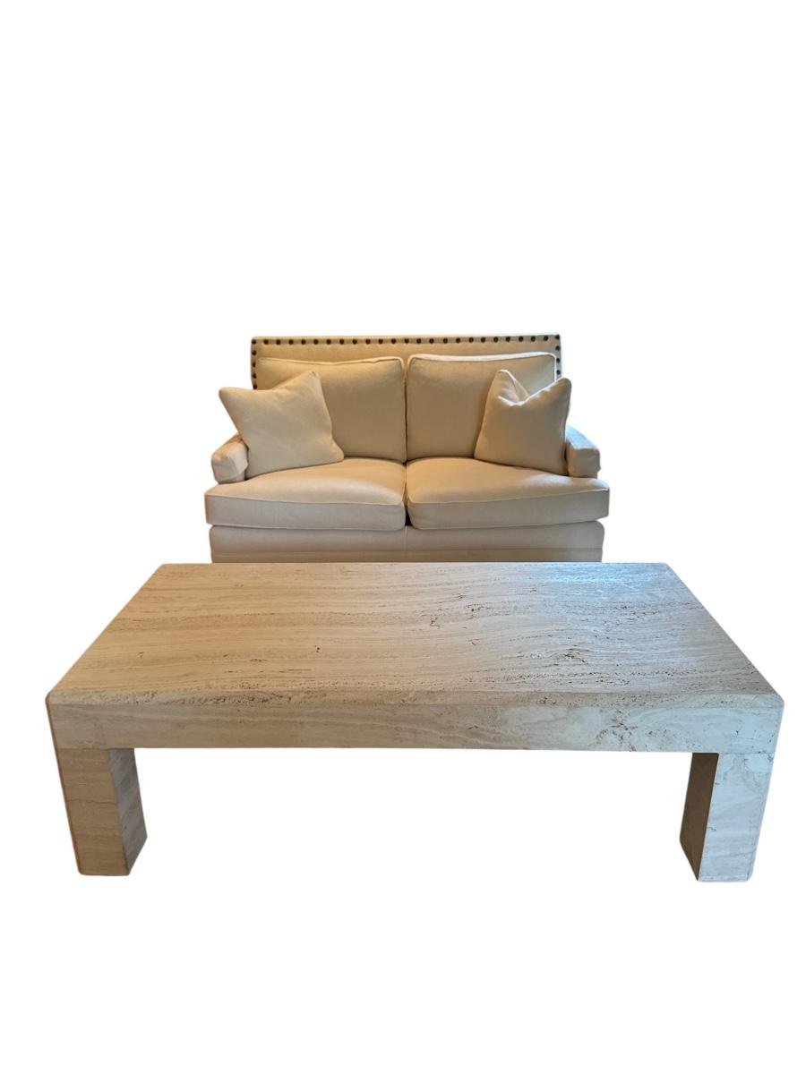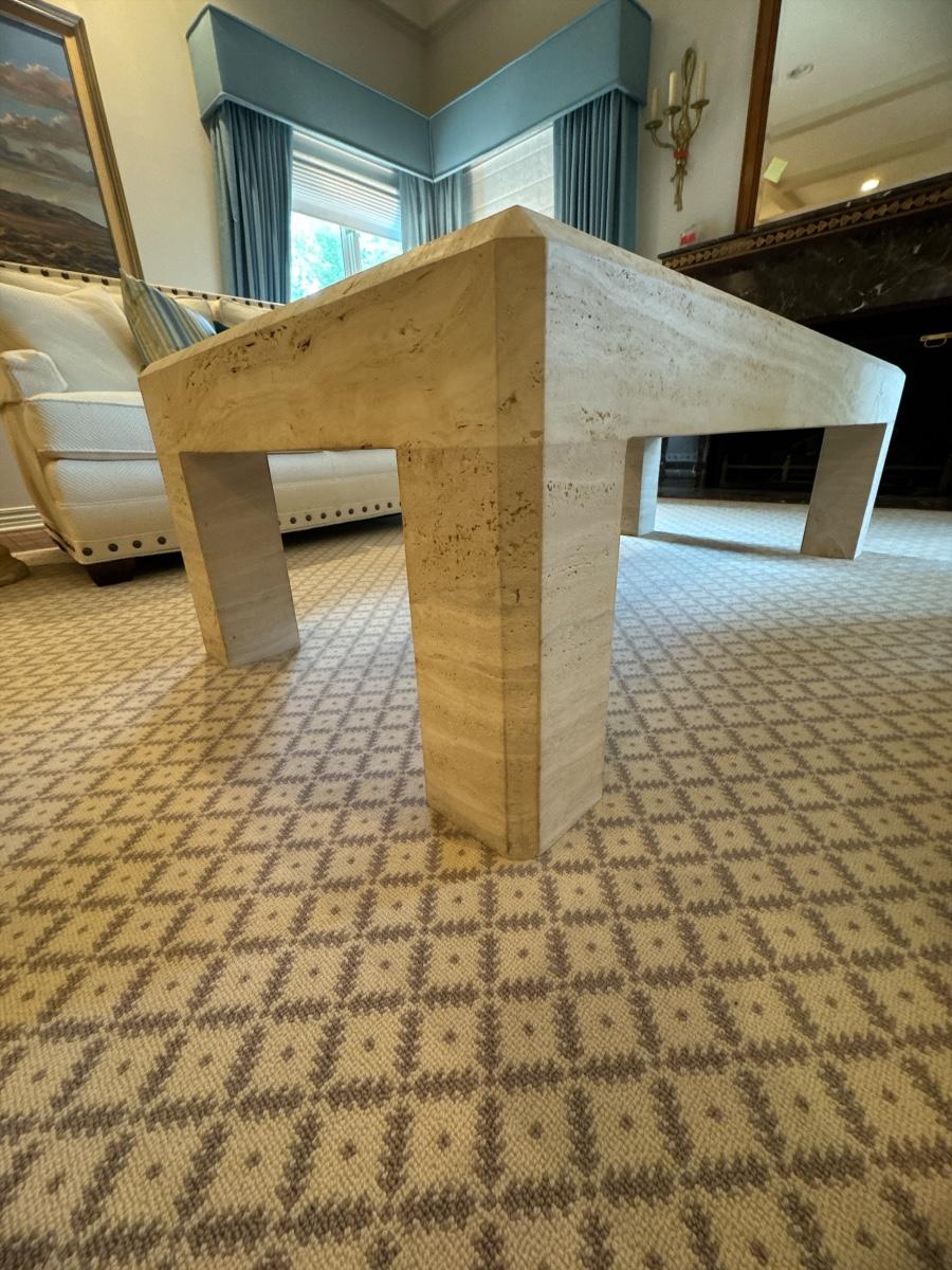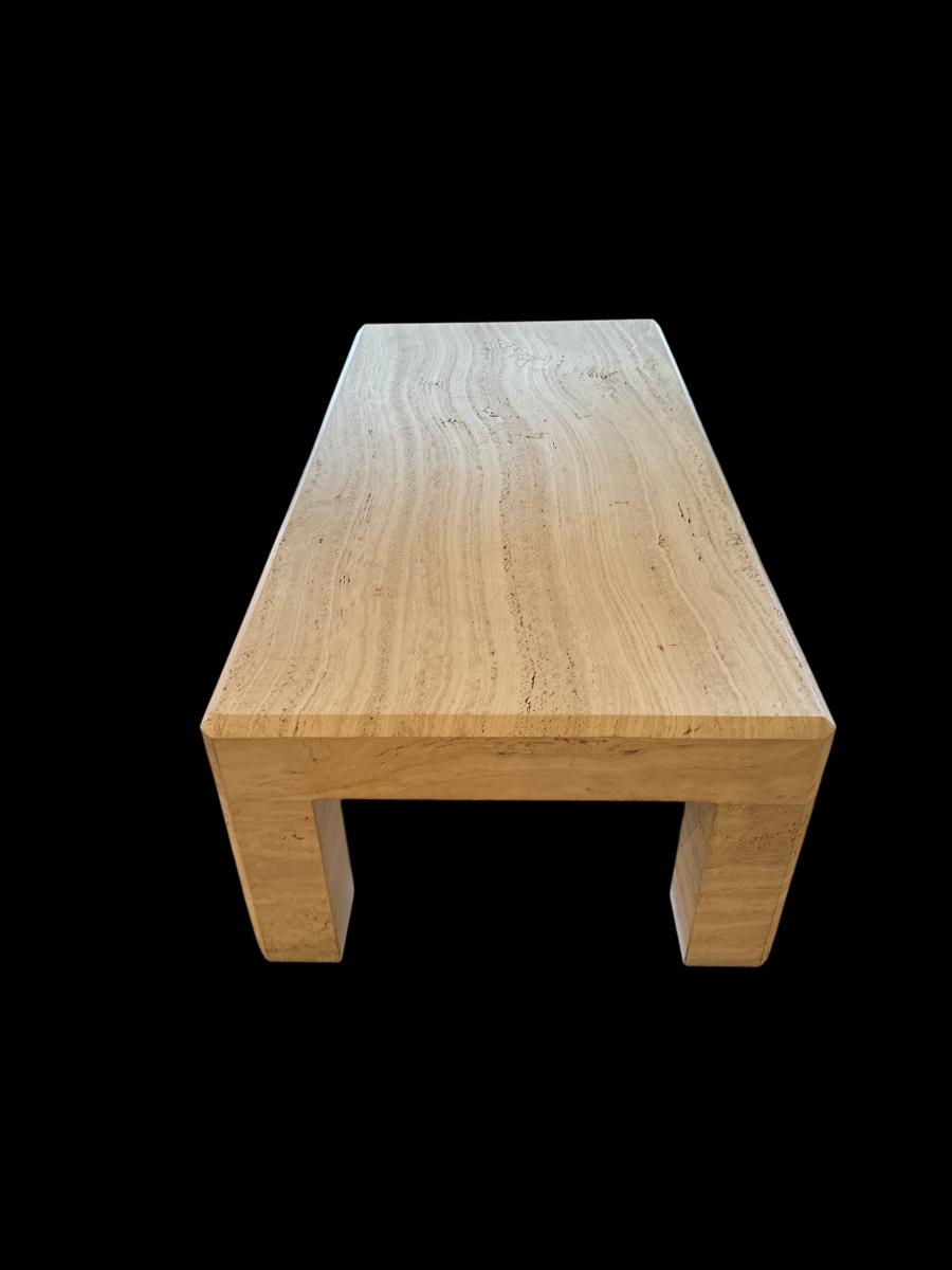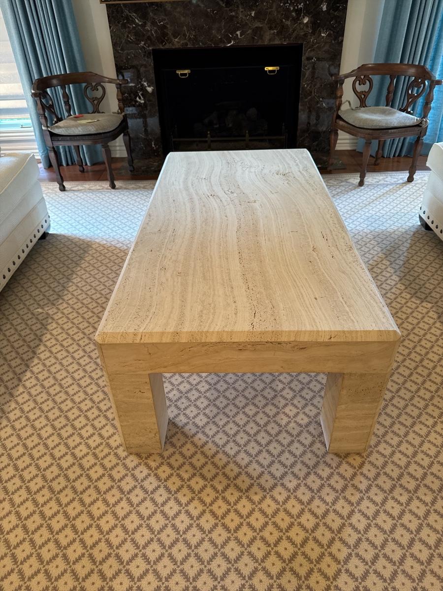 Sleek and sophisticated cast stone coffee table with the look of natural travertine. This substantial rectangular piece features clean, modern lines and waterfall-style legs. Neutral tones and subtle veining make it a versatile fit for any living room decor—from contemporary to transitional.