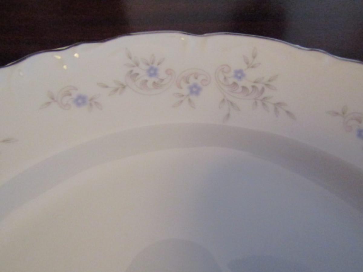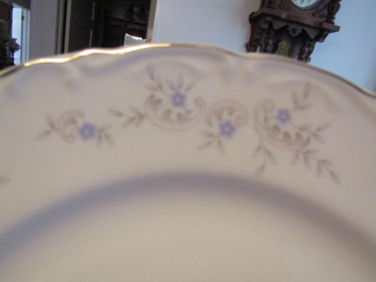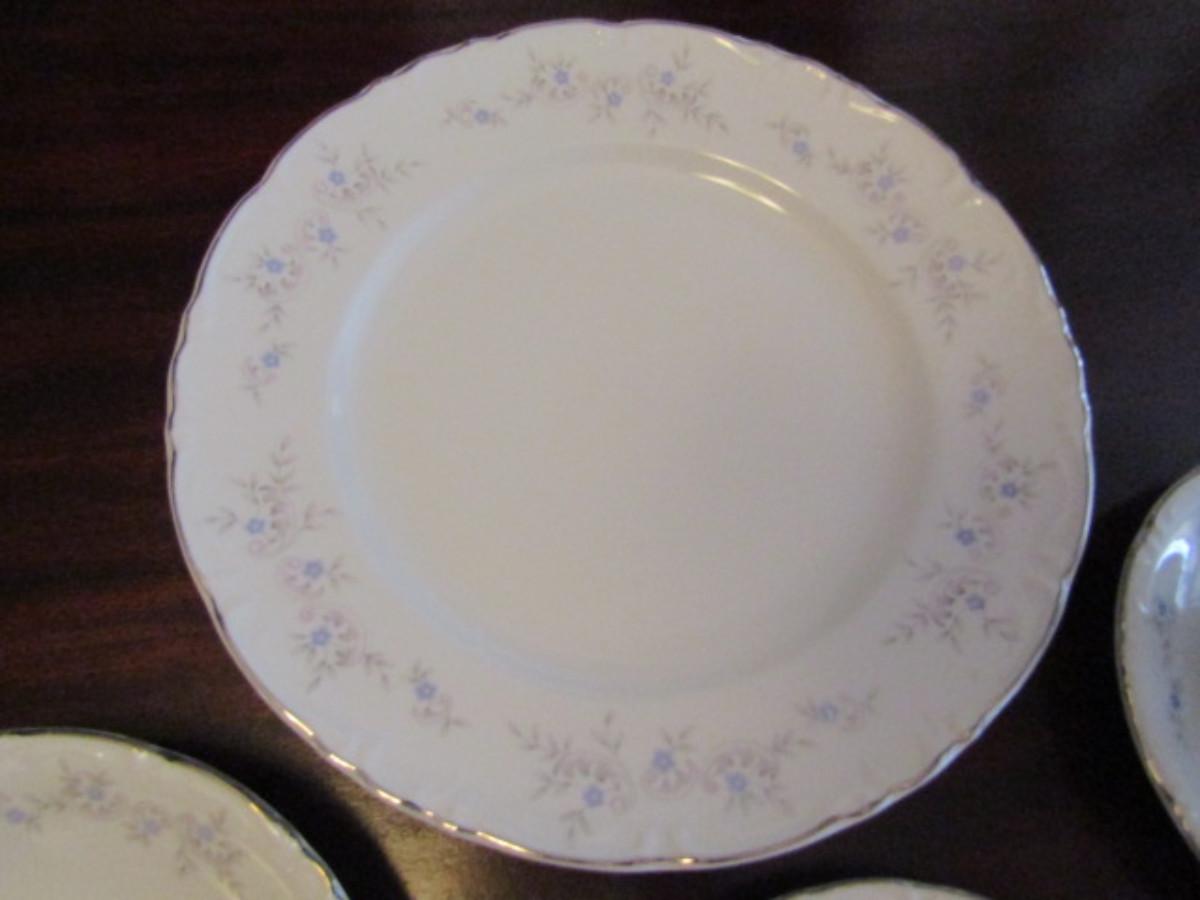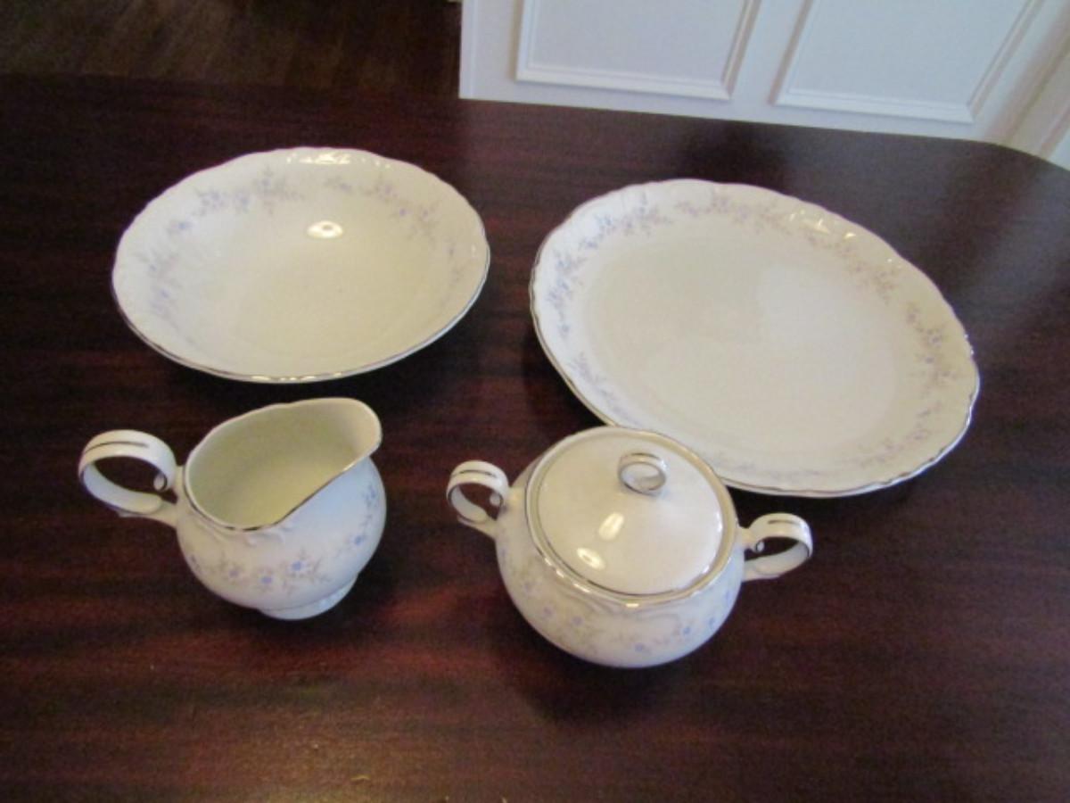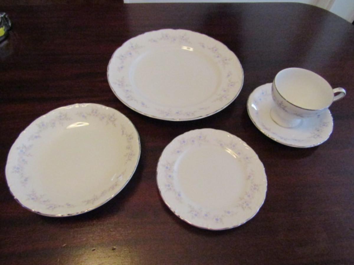 Modern China- Approx 42 Pieces. Dinner Plates- 8, Bread Plates- 8, Cups and Saucers- 8 of each, Soup Bowls- 6, Vegetable Bowl- 1, Platter- 1, Cream and Sugar.