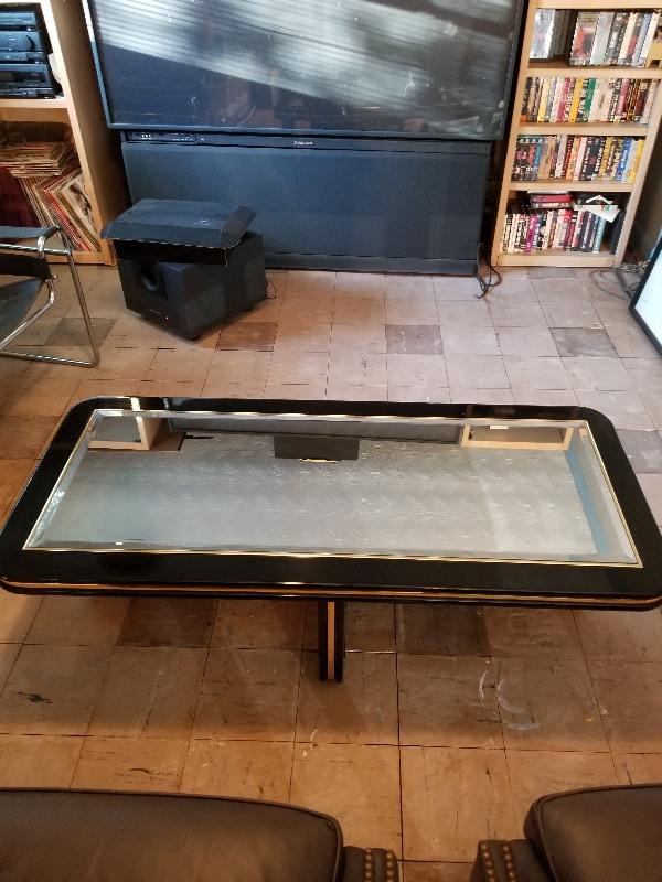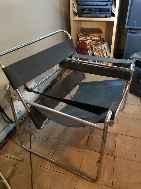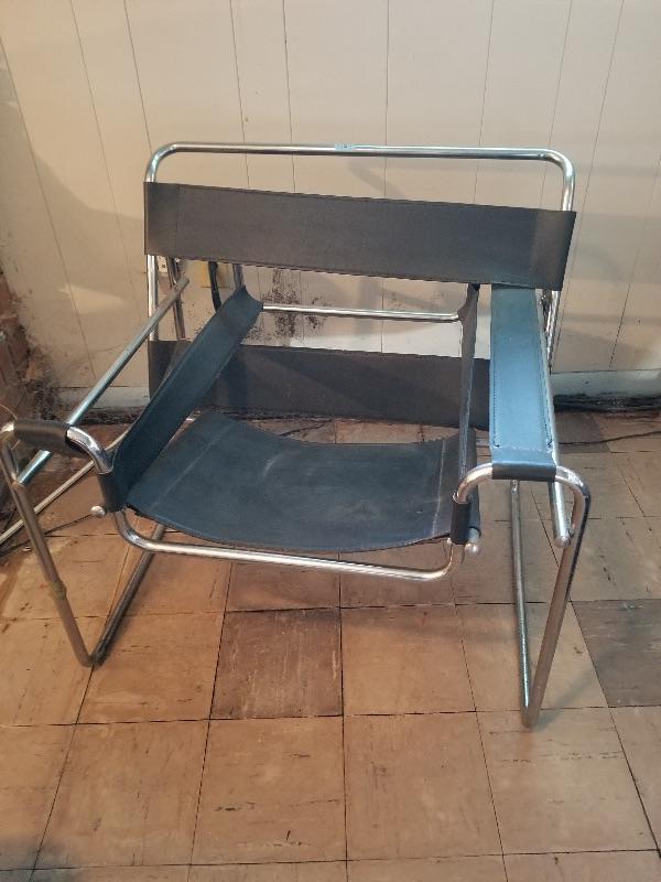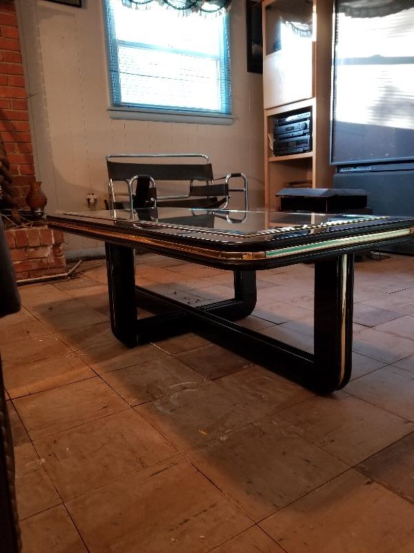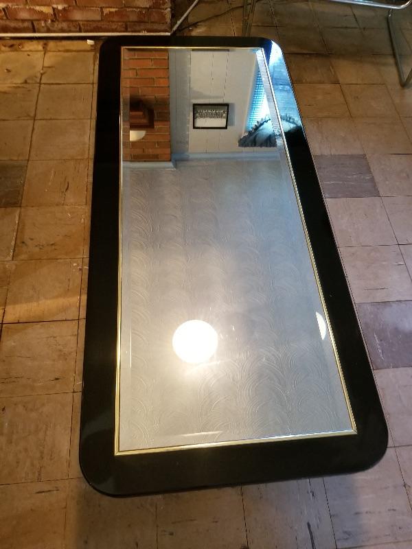 Modern black coffee table with mirror top and metal chair with leather straps.