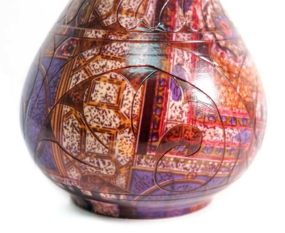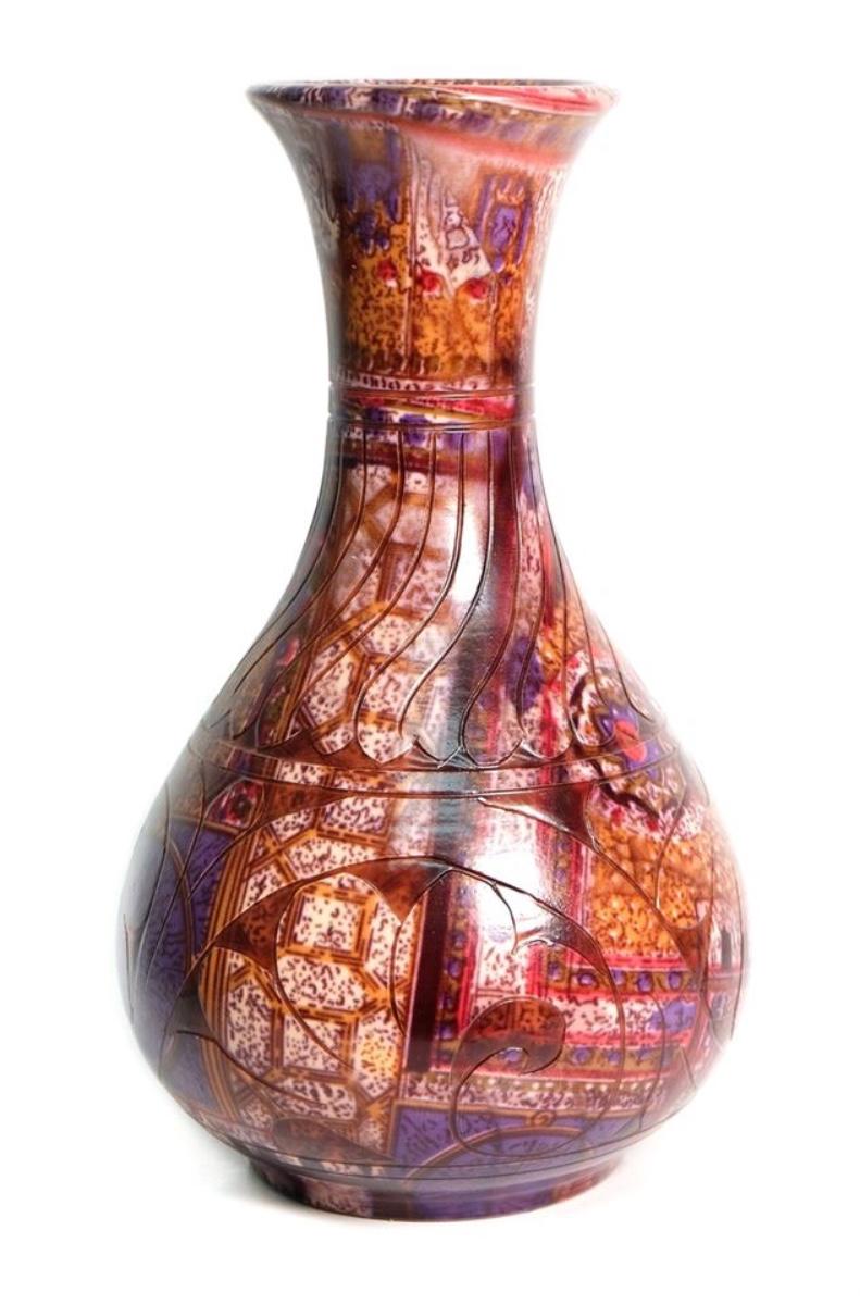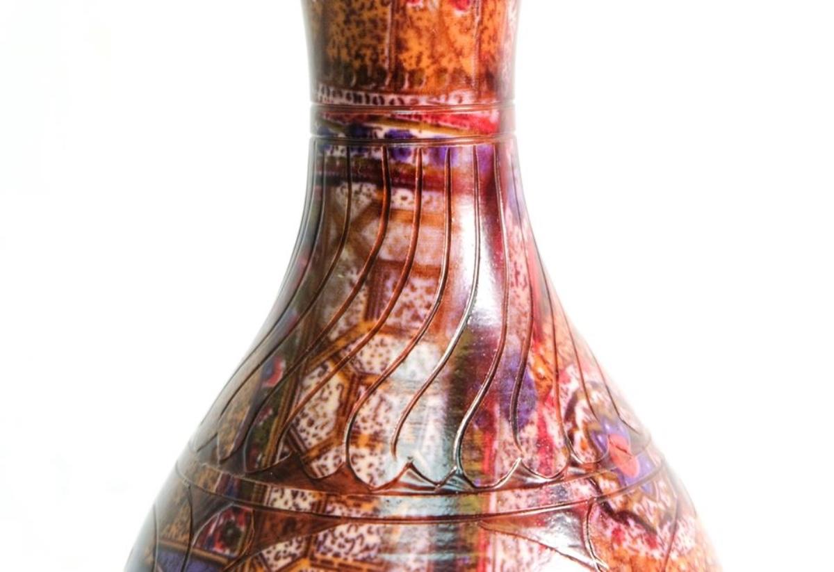 Modern pottery vase having incised motif and colorful glaze. Initialed on the bottom. Approx. height 7.5 in.
