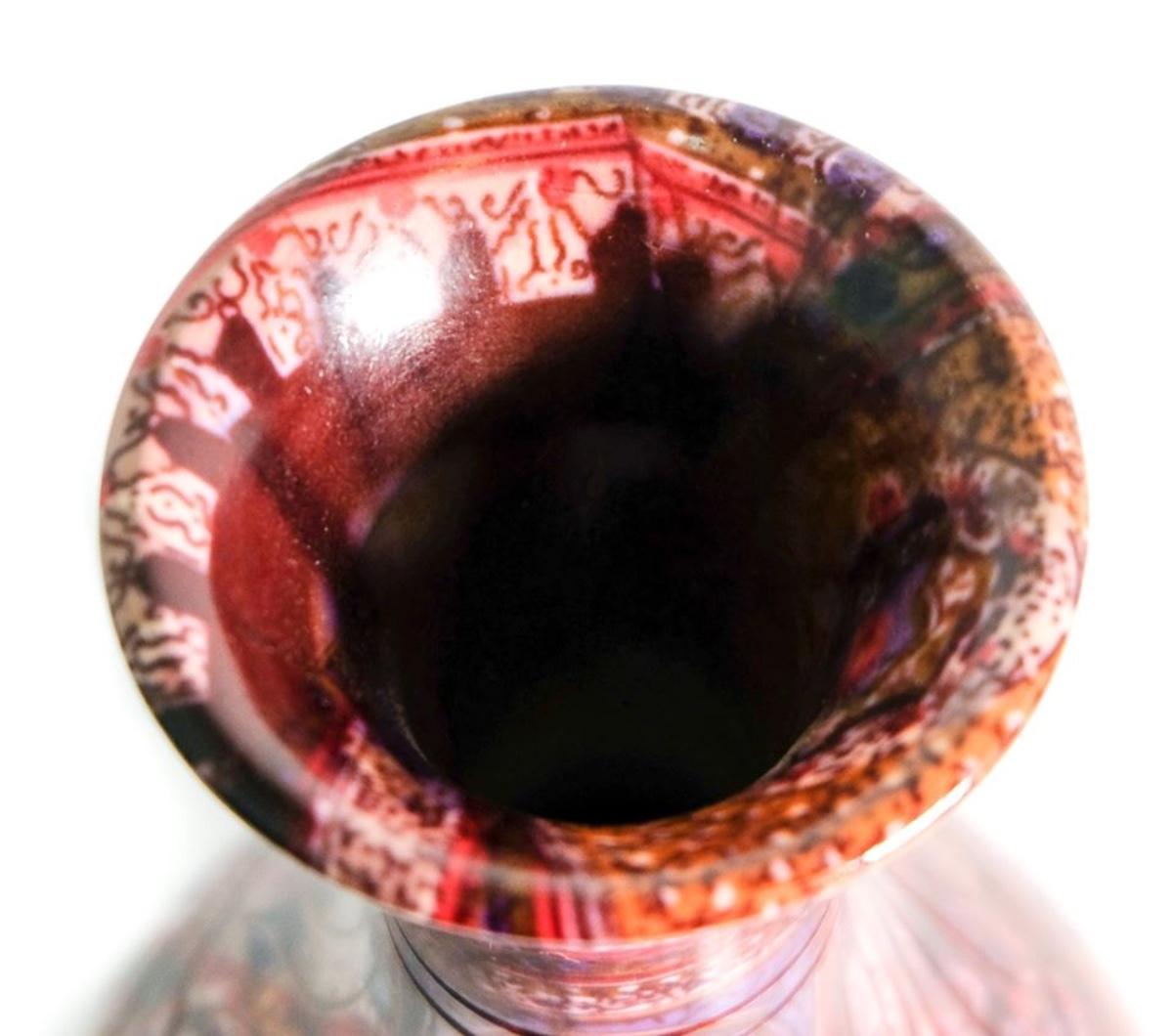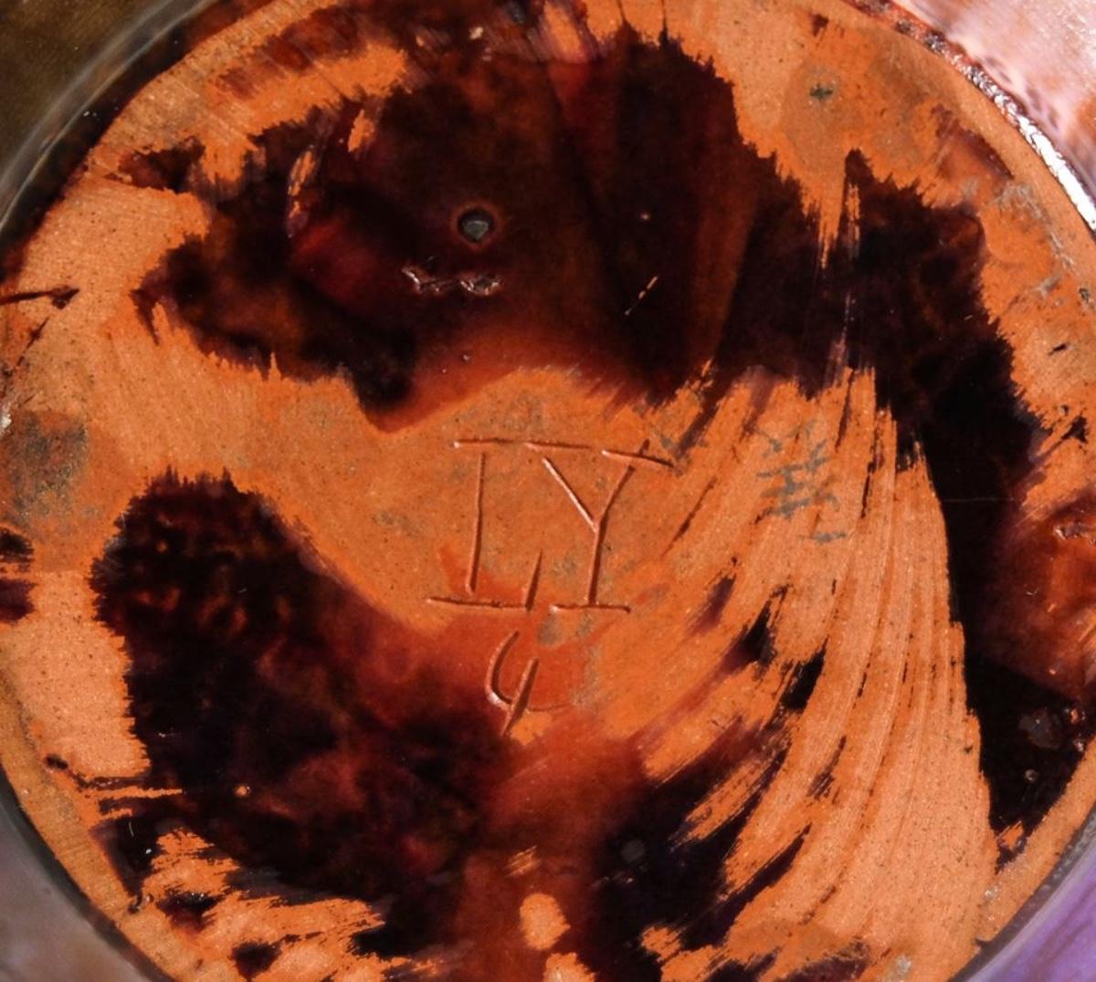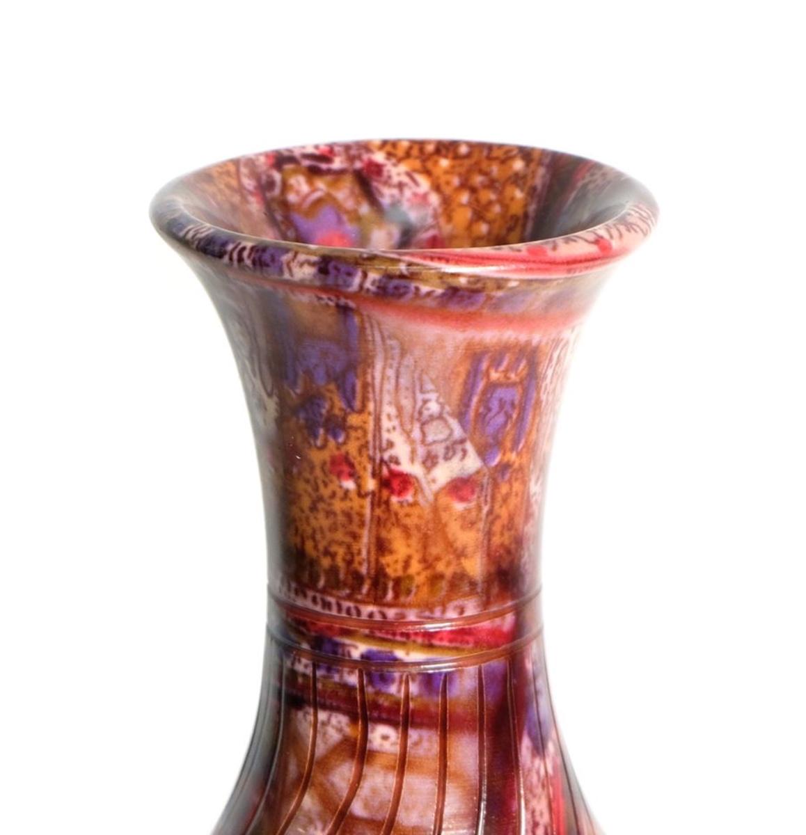 Modern pottery vase having incised motif and colorful glaze. Initialed on the bottom. Approx. height 7.5 in.