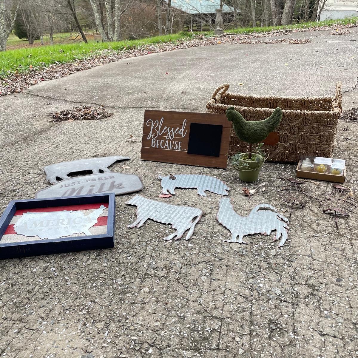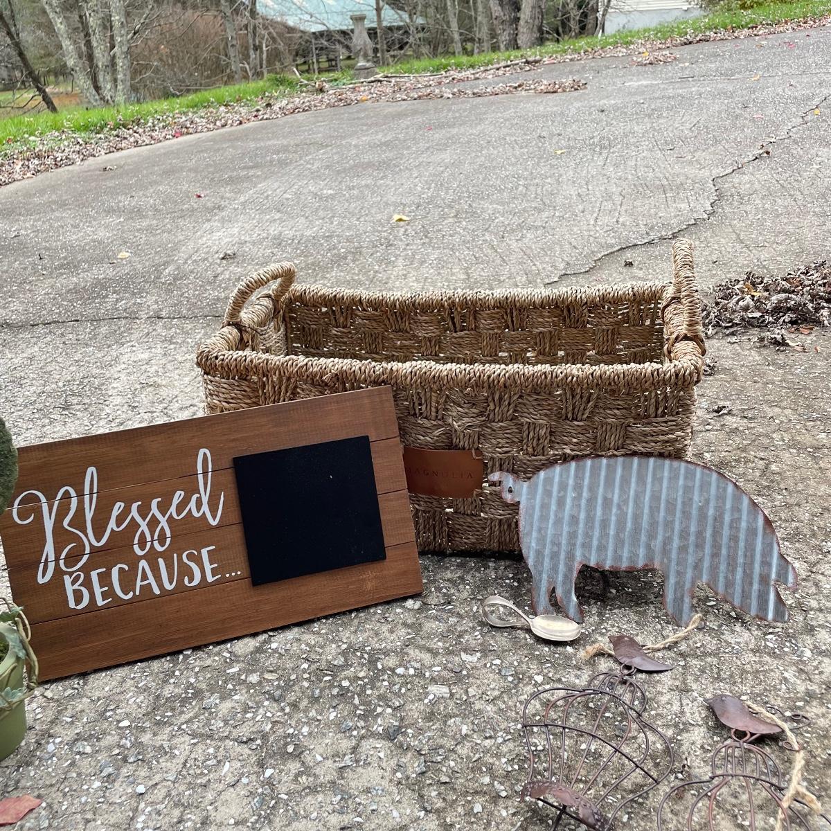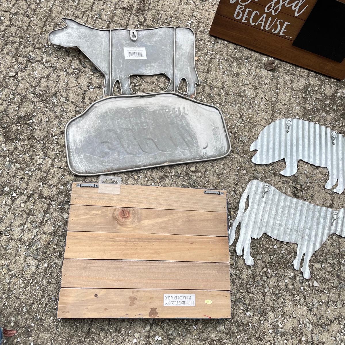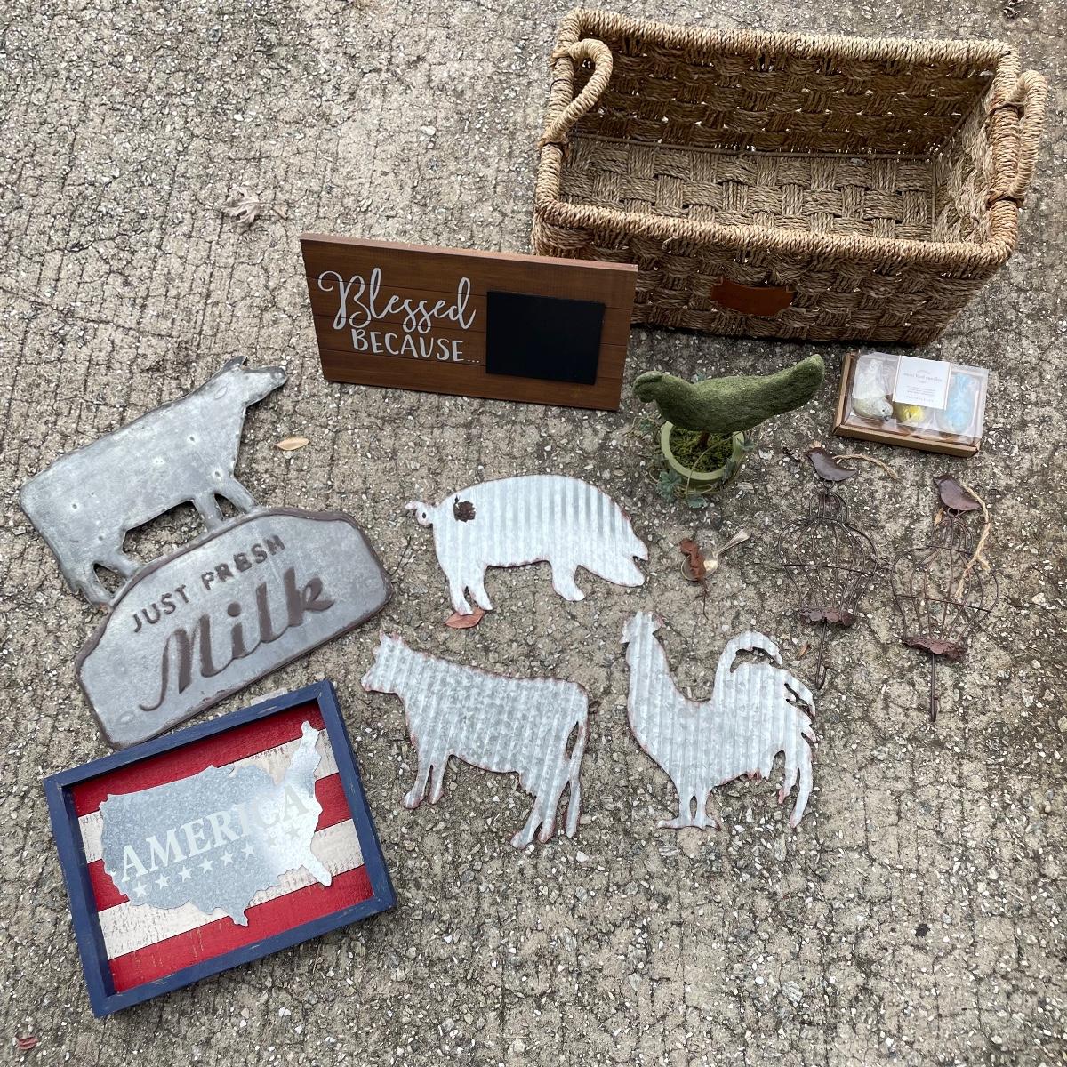 Wonderful farmhouse decor. Three metal farm animals plus a Blessed wood and chalkboard display. The woven Magnolia basket is 19” x 10” x 8”. See images. Local pick up only.