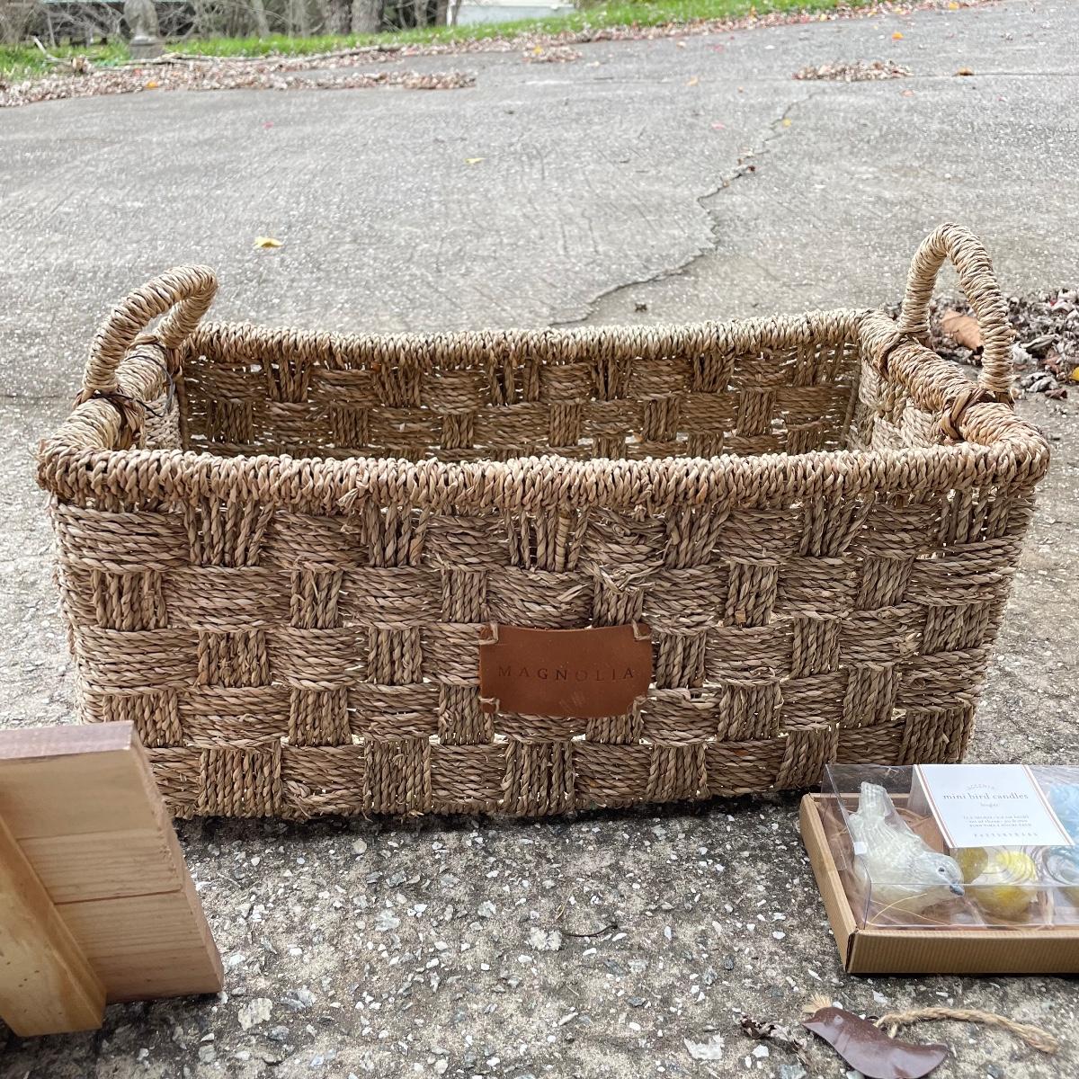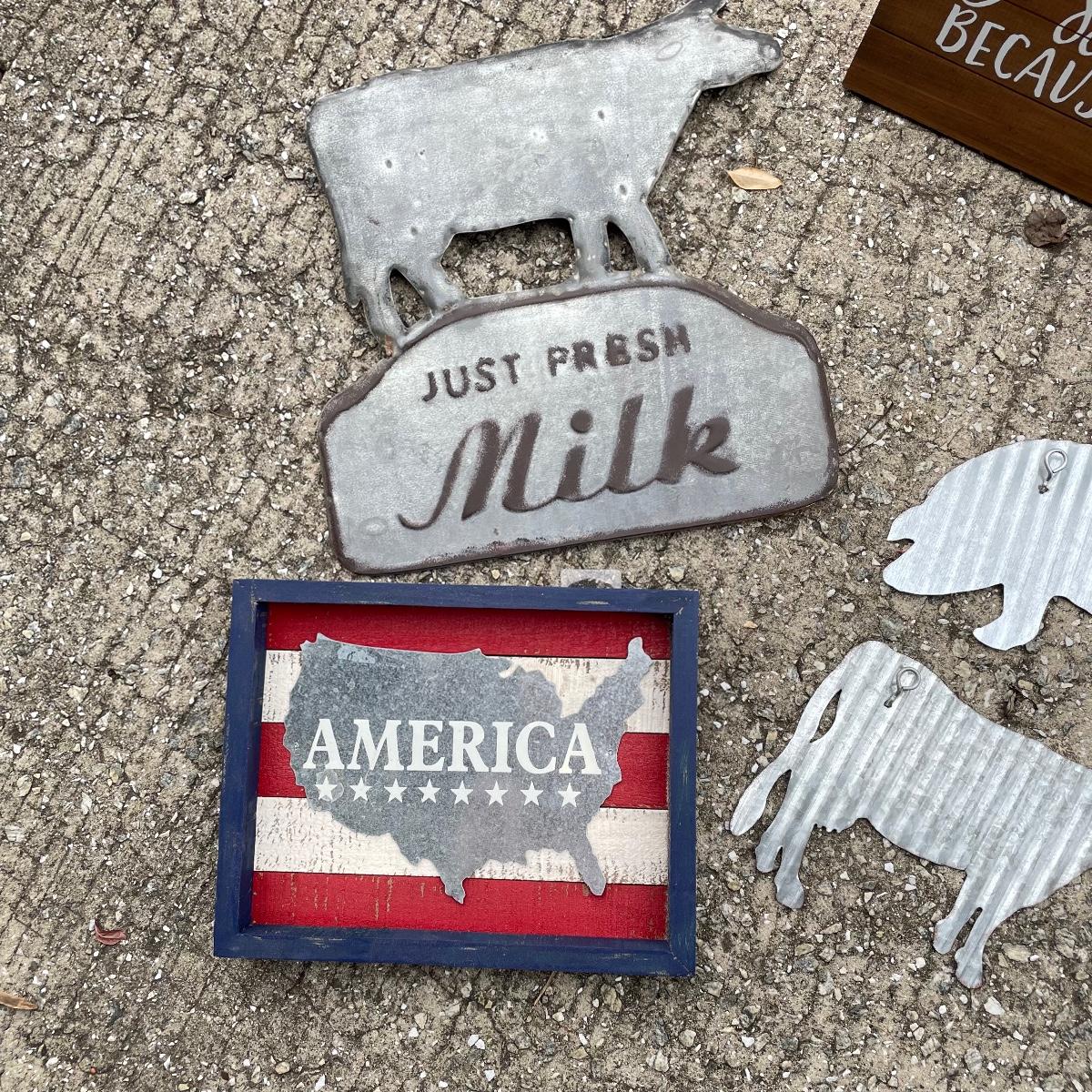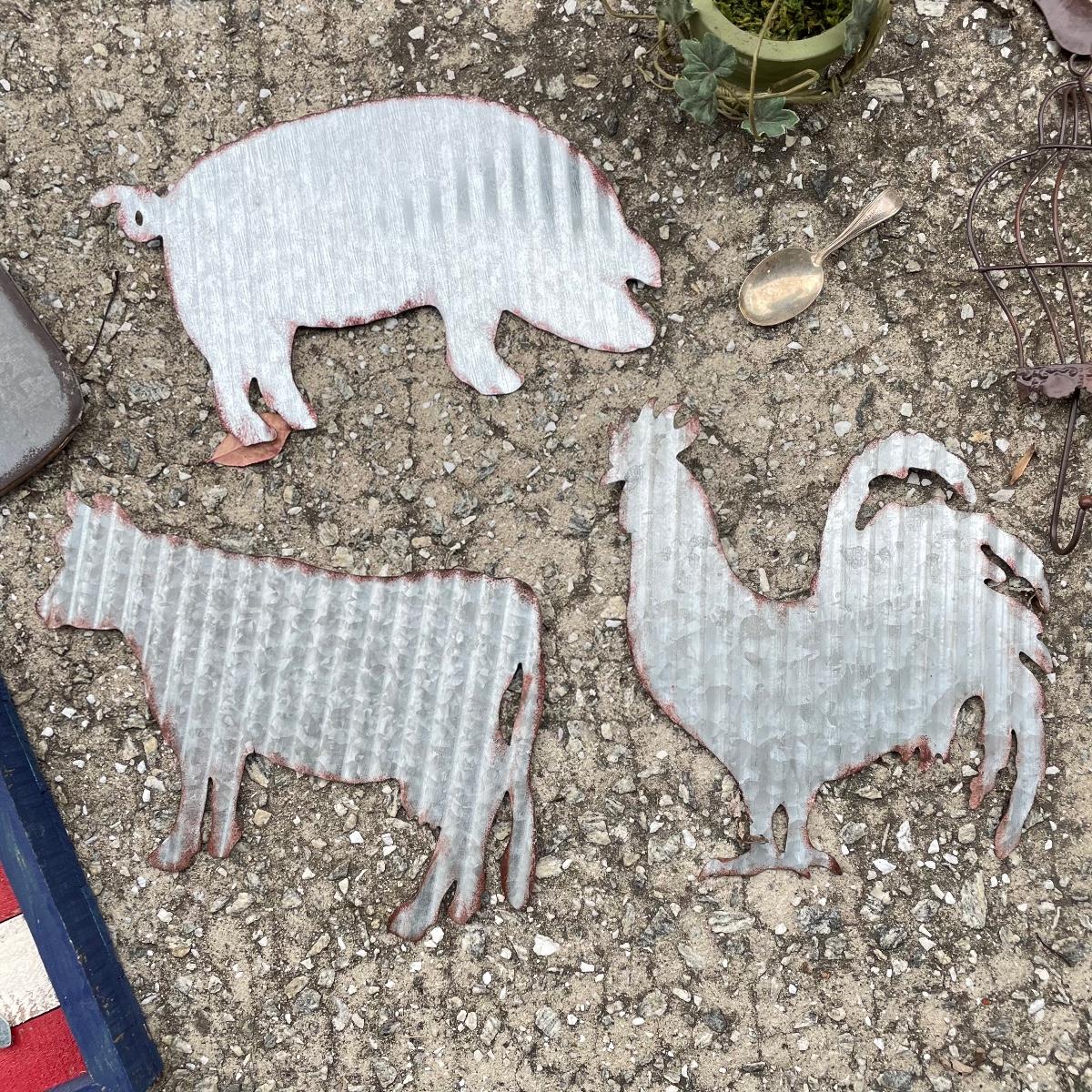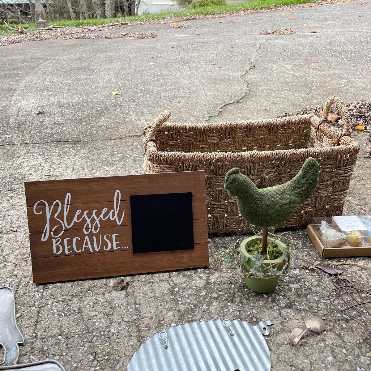 Wonderful farmhouse decor. Three metal farm animals plus a Blessed wood and chalkboard display. The woven Magnolia basket is 19” x 10” x 8”. See images. Local pick up only.