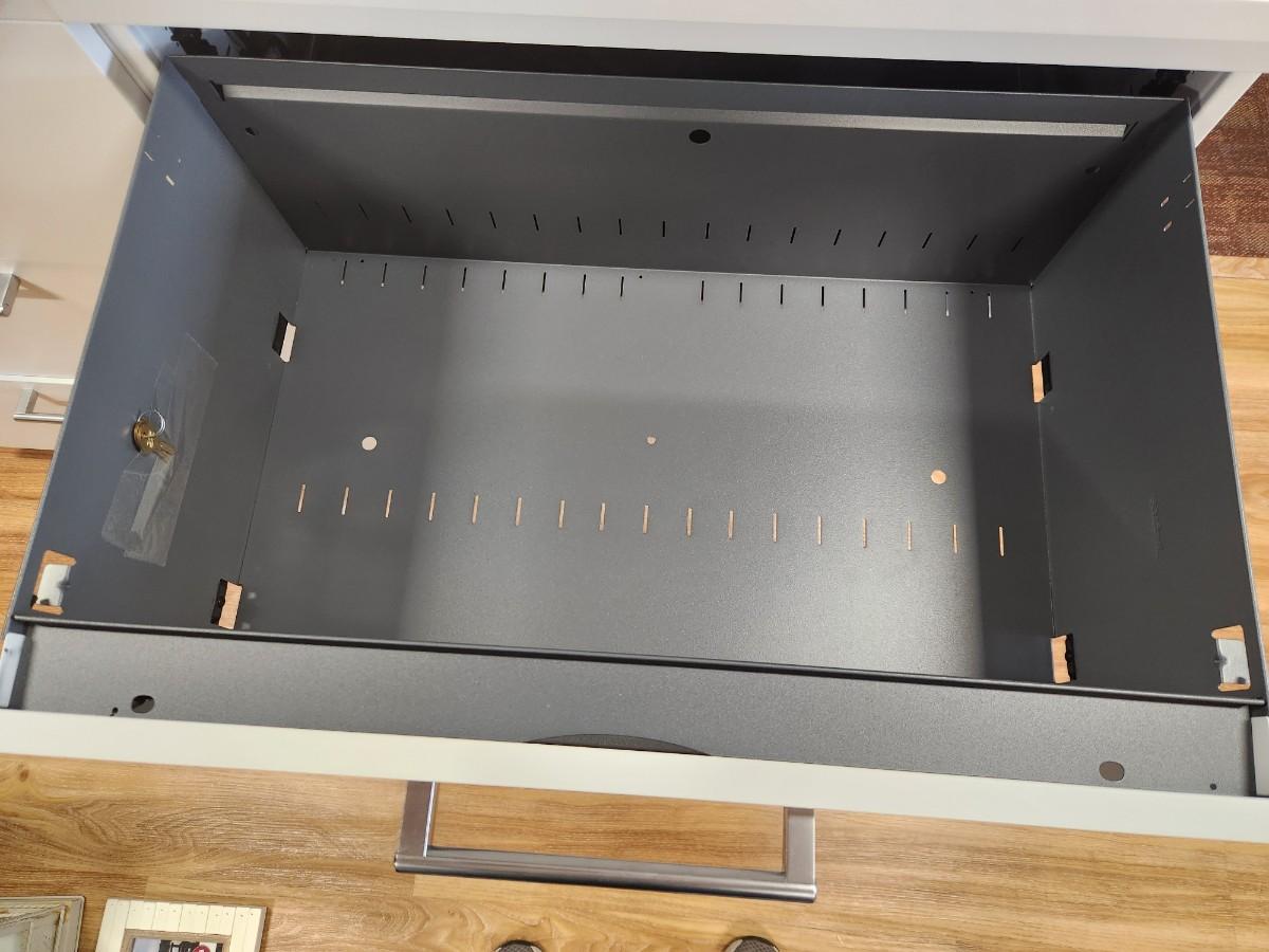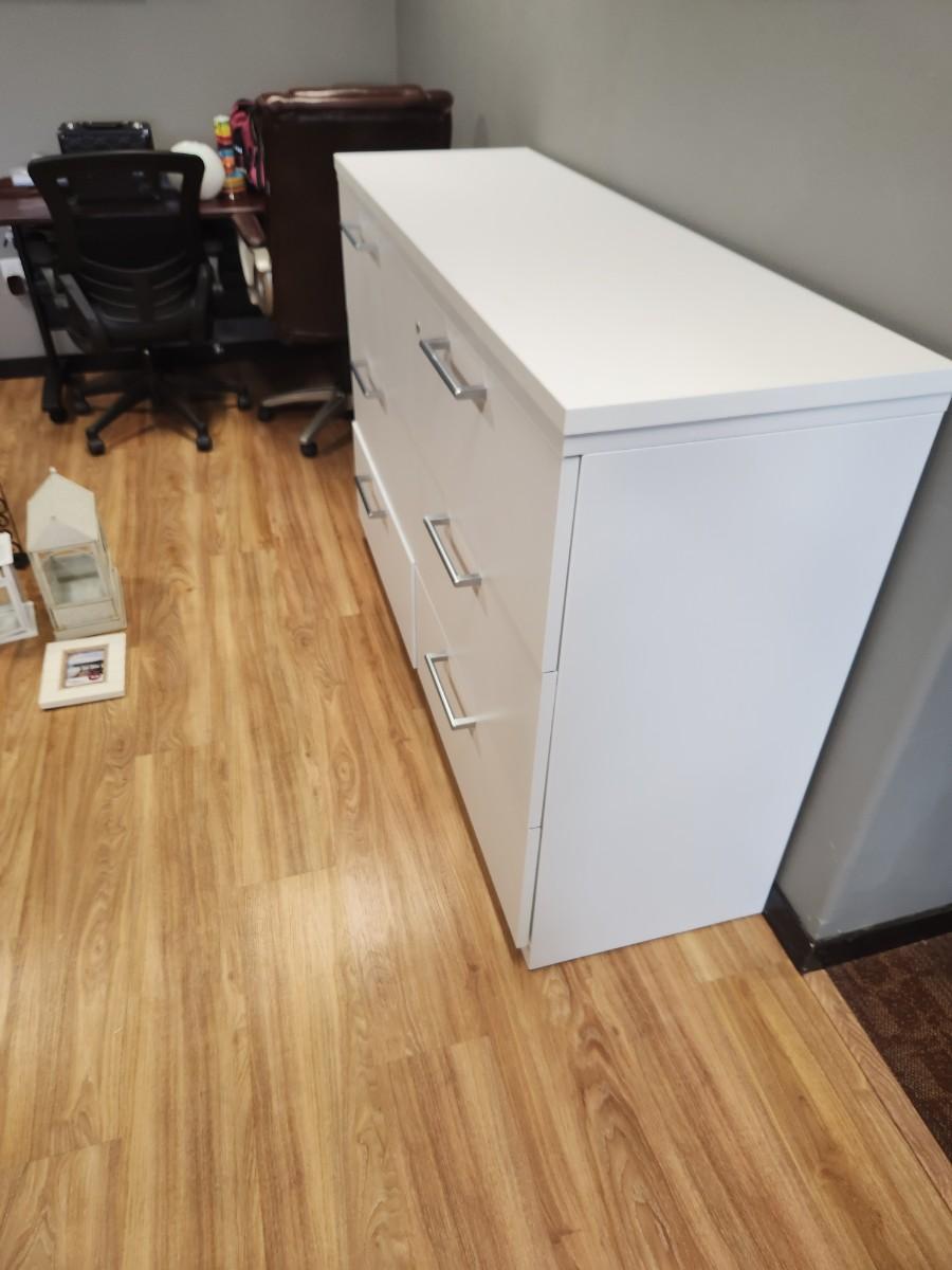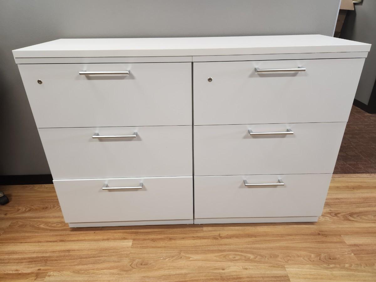 There are 2 cabinets that are pushed together, and the top piece is removable and just rests on both filing cabinets.