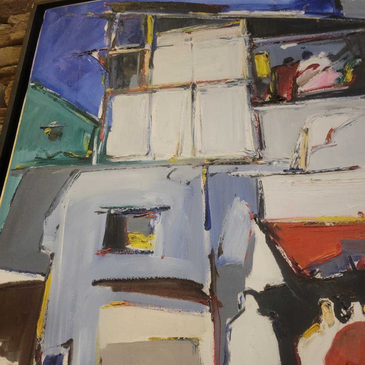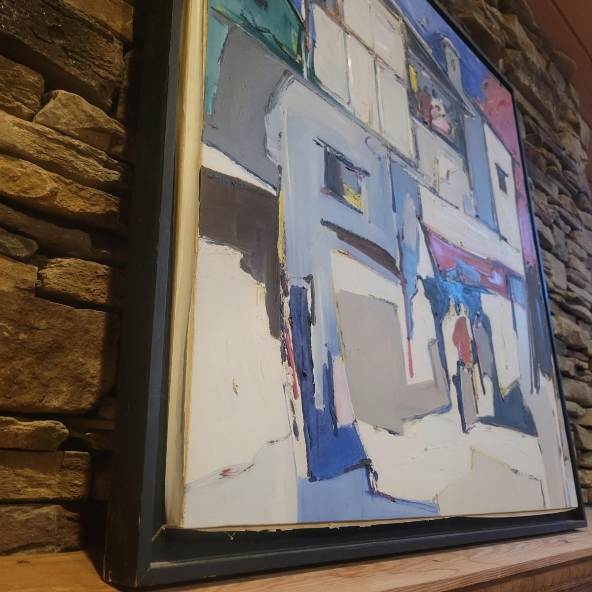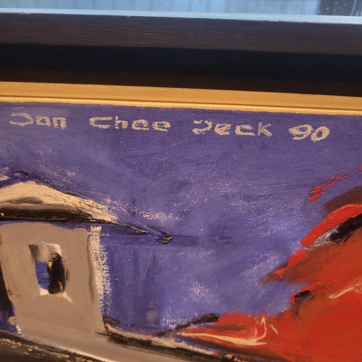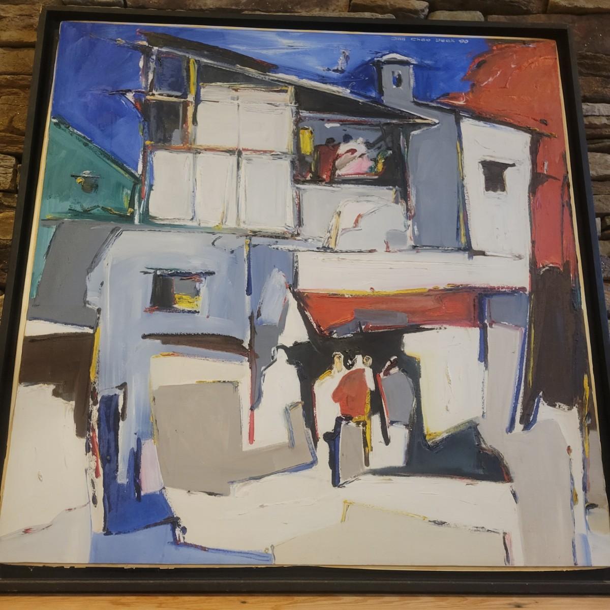 A modern original on canvas in good condition with some minor blemishes on the frame. This colorful modern art piece features a wooden canvas frame with a black stain. Piece was painted by Tan Chee Teck and is a modern city scene that measures approximately 39" x 39" x 2". Shipping available. Shipping art can be costly. We suggest calling our local UPS with dimensions and getting an estimate before bidding: (828) 252-6930.