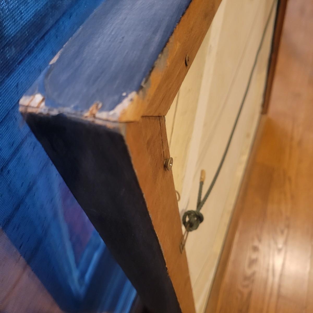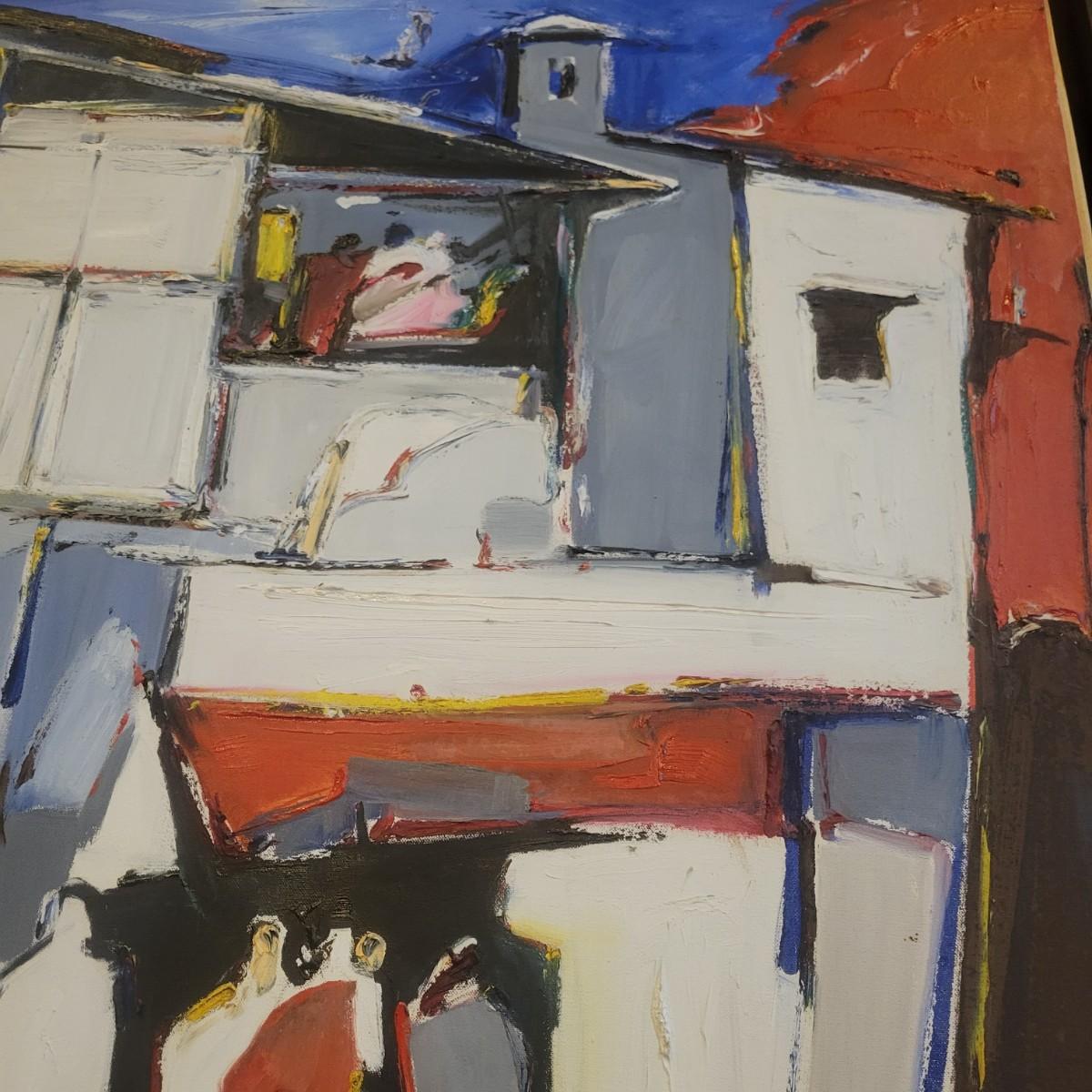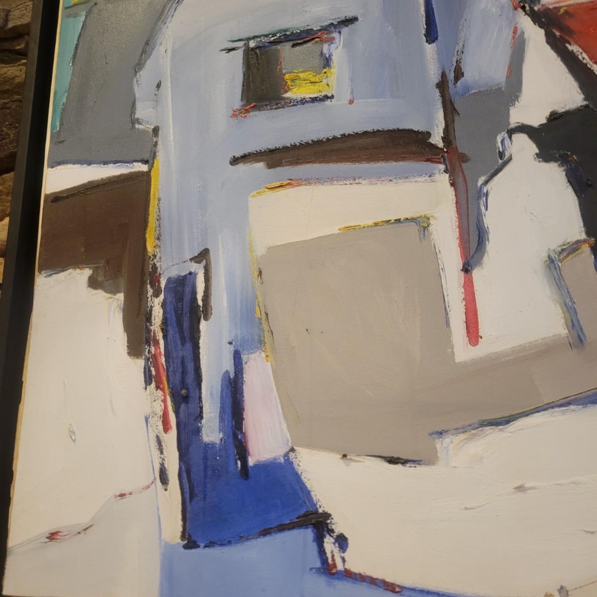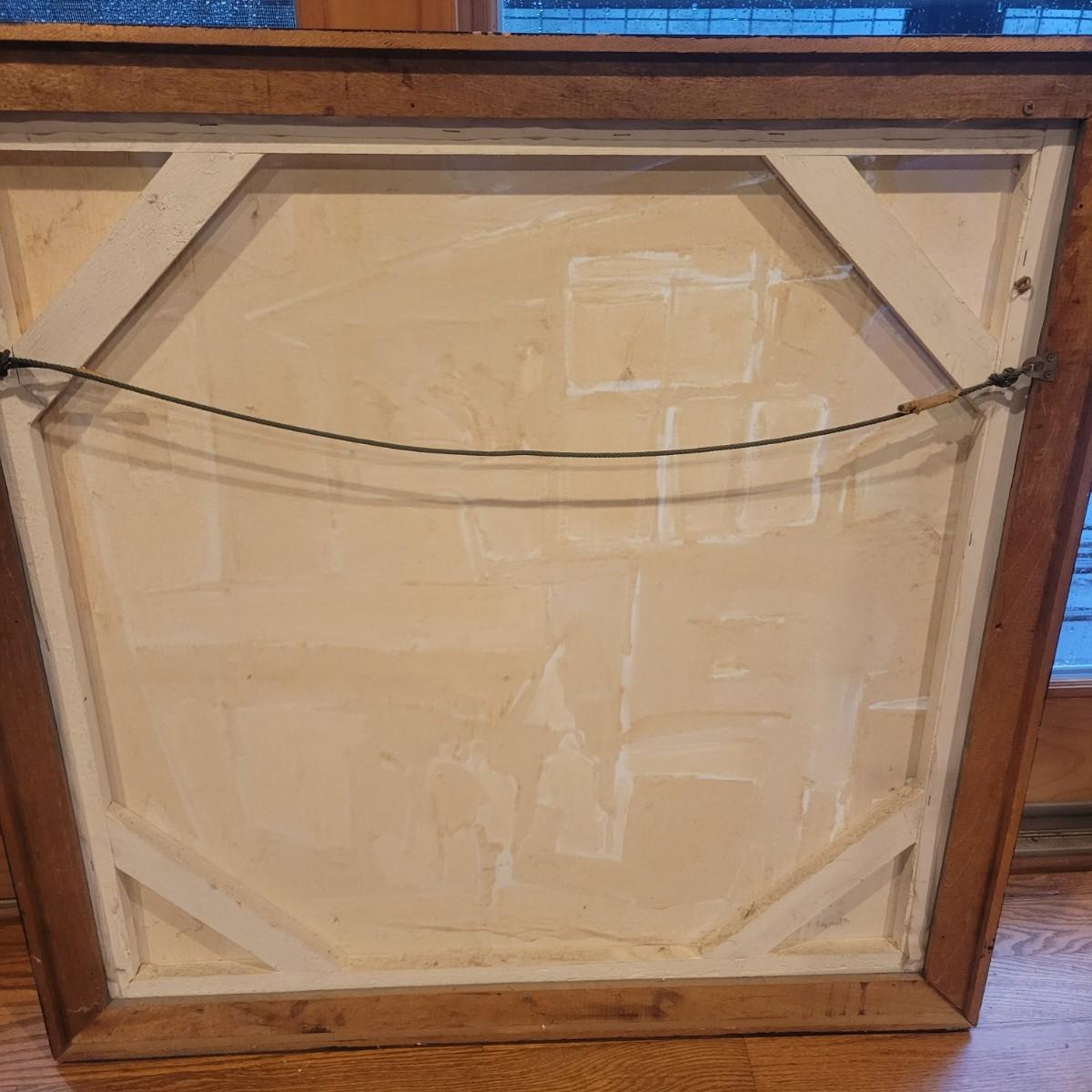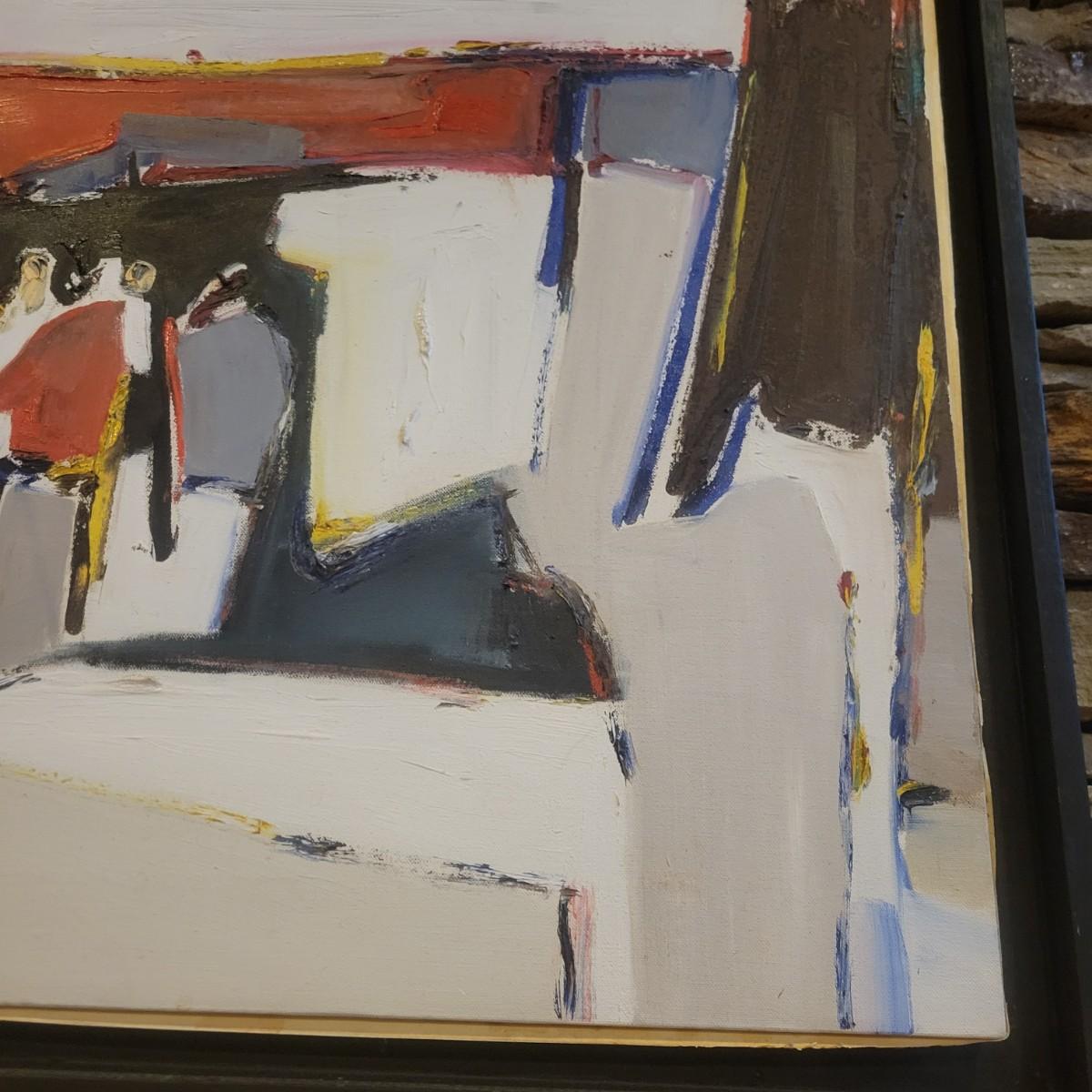 A modern original on canvas in good condition with some minor blemishes on the frame. This colorful modern art piece features a wooden canvas frame with a black stain. Piece was painted by Tan Chee Teck and is a modern city scene that measures approximately 39" x 39" x 2". Shipping available. Shipping art can be costly. We suggest calling our local UPS with dimensions and getting an estimate before bidding: (828) 252-6930.