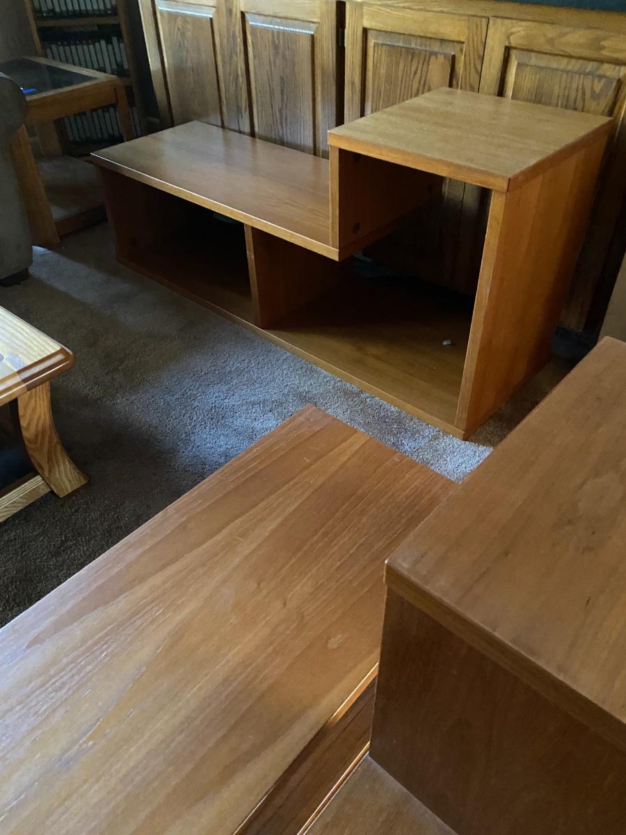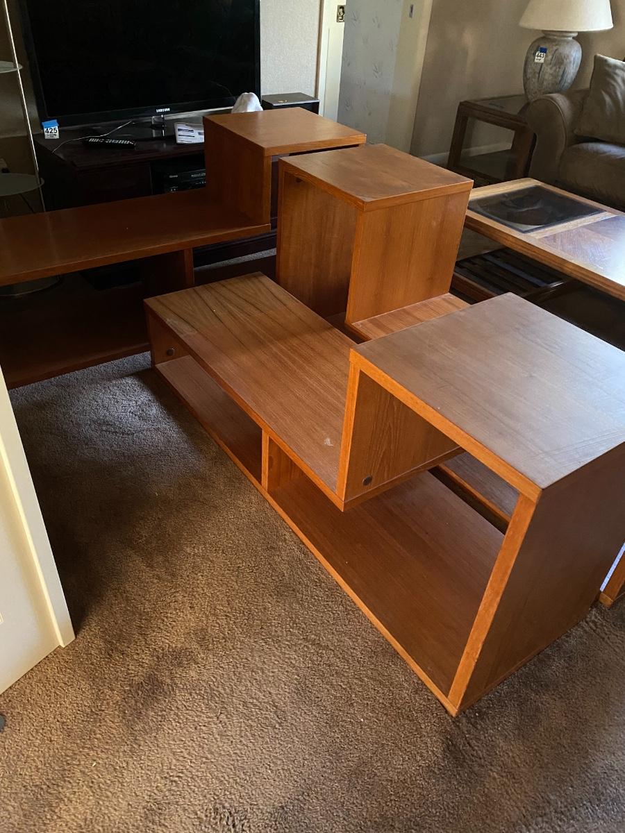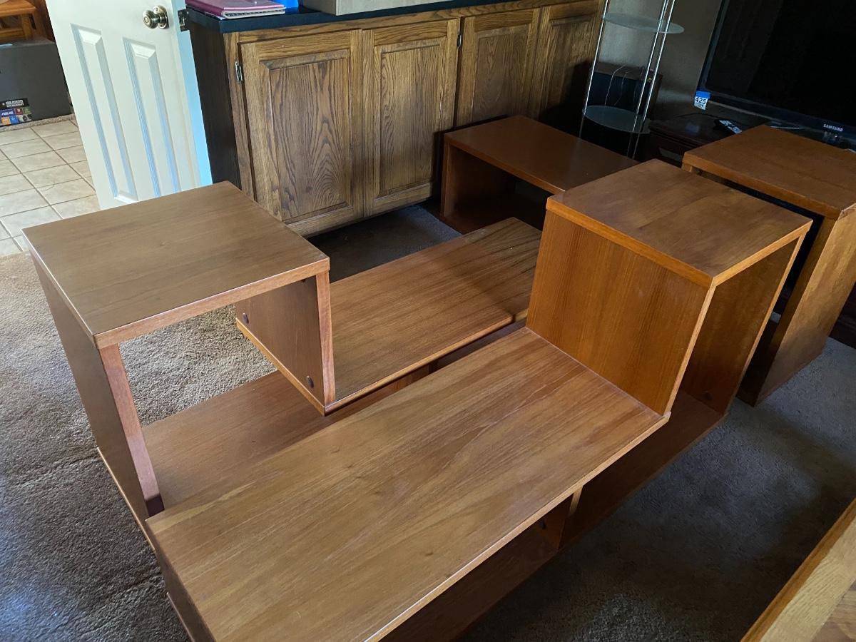 In four pieces. Each piece measures 5 ft wide x 18”D x 26.5” H. Heavy. You must bring help to move this item or send movers.