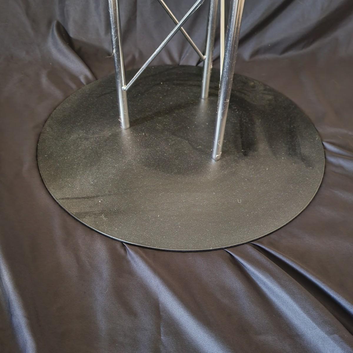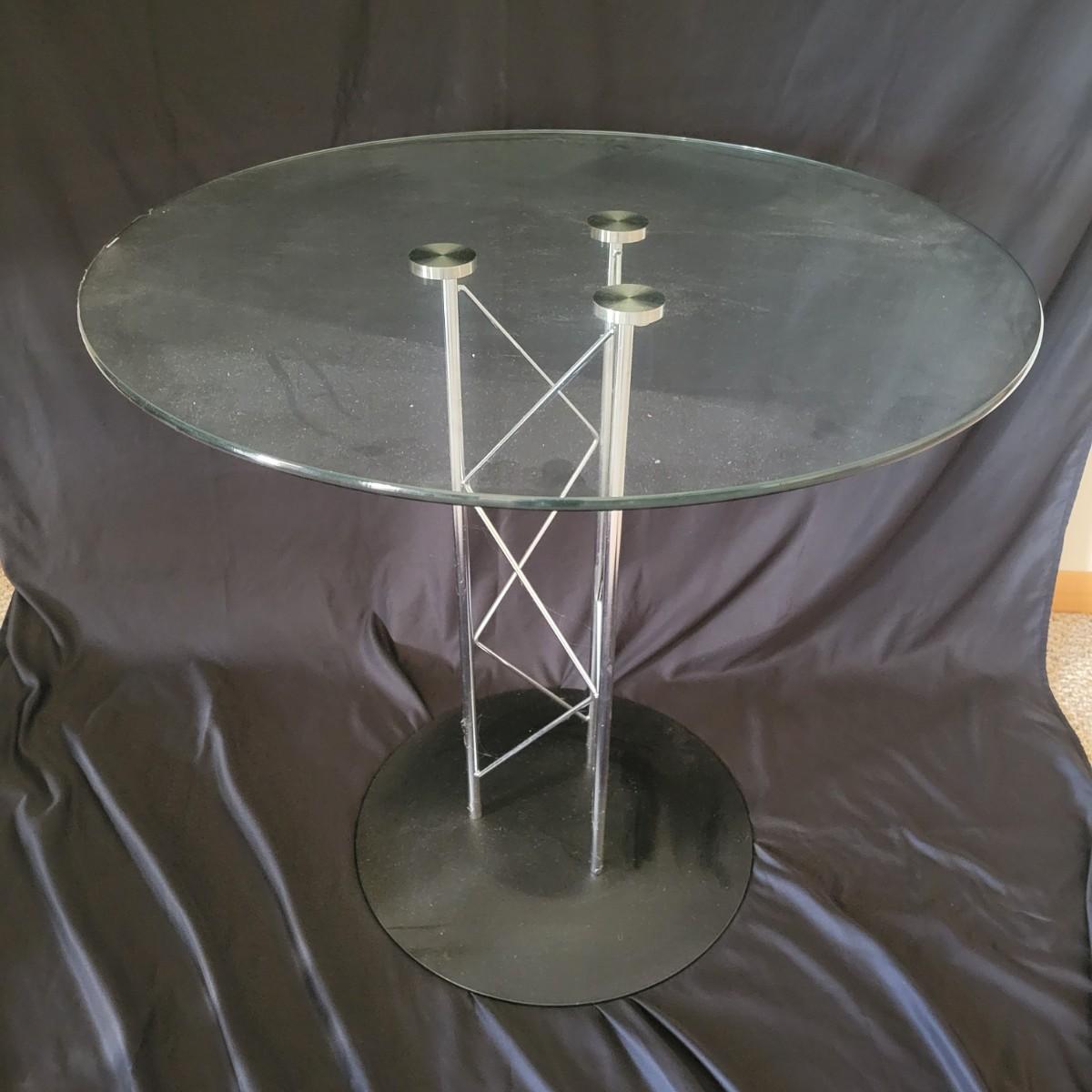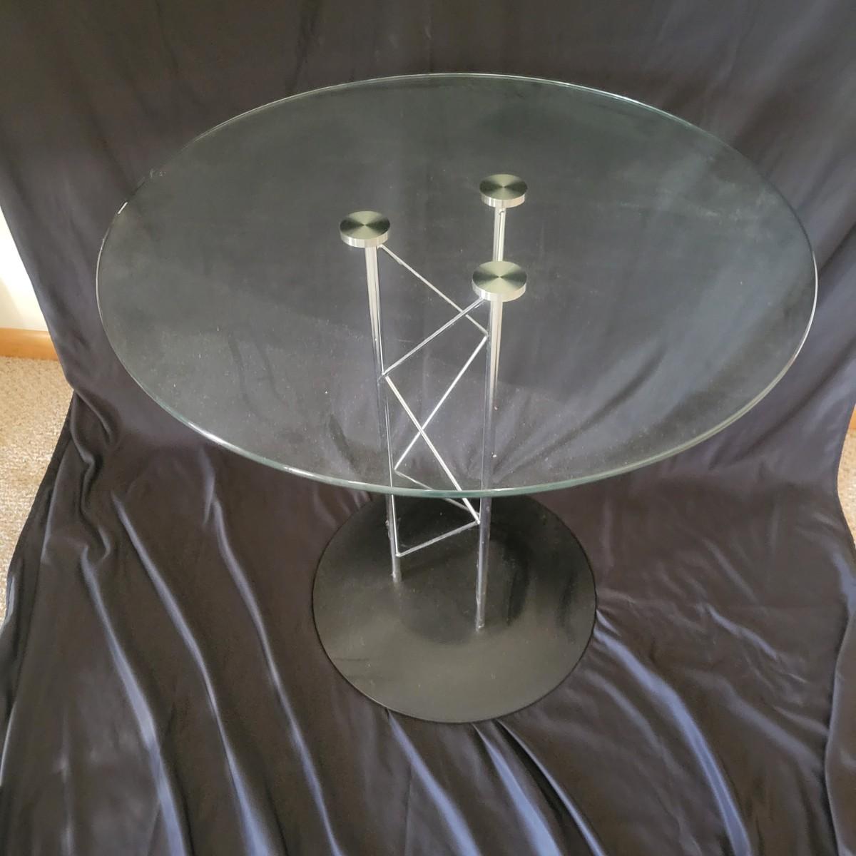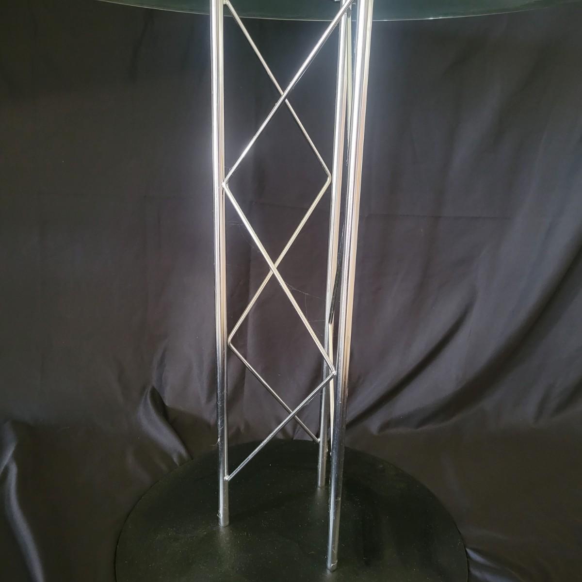 A tempered glass and metal side table. This modern table features a chromed metal frame with a black metal base and a round tempered glass top. It measures approximately 31.5"D x 30"H. Local pickup only. Winning bidder must bring assistance to help move and load this item due to its weight and/or size.