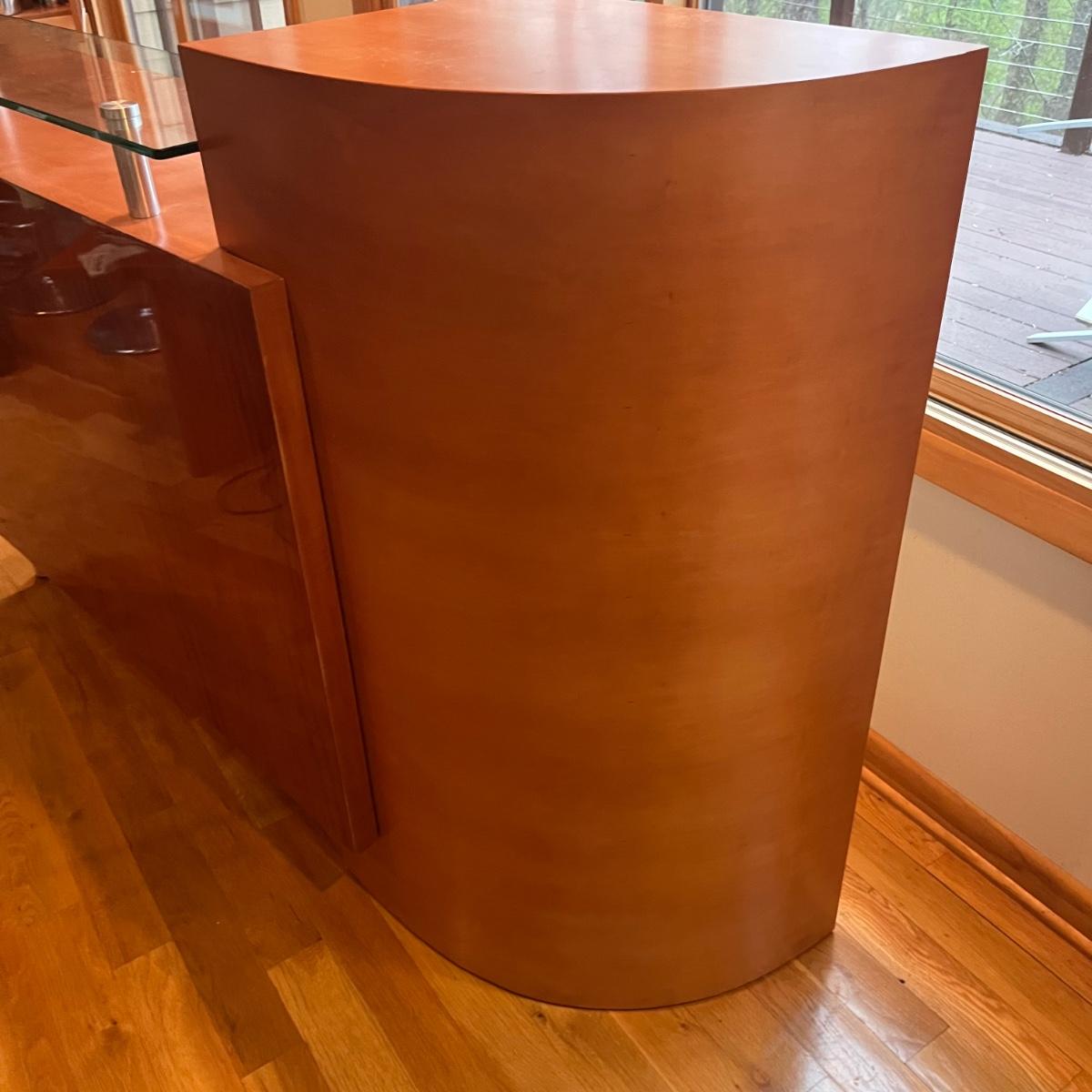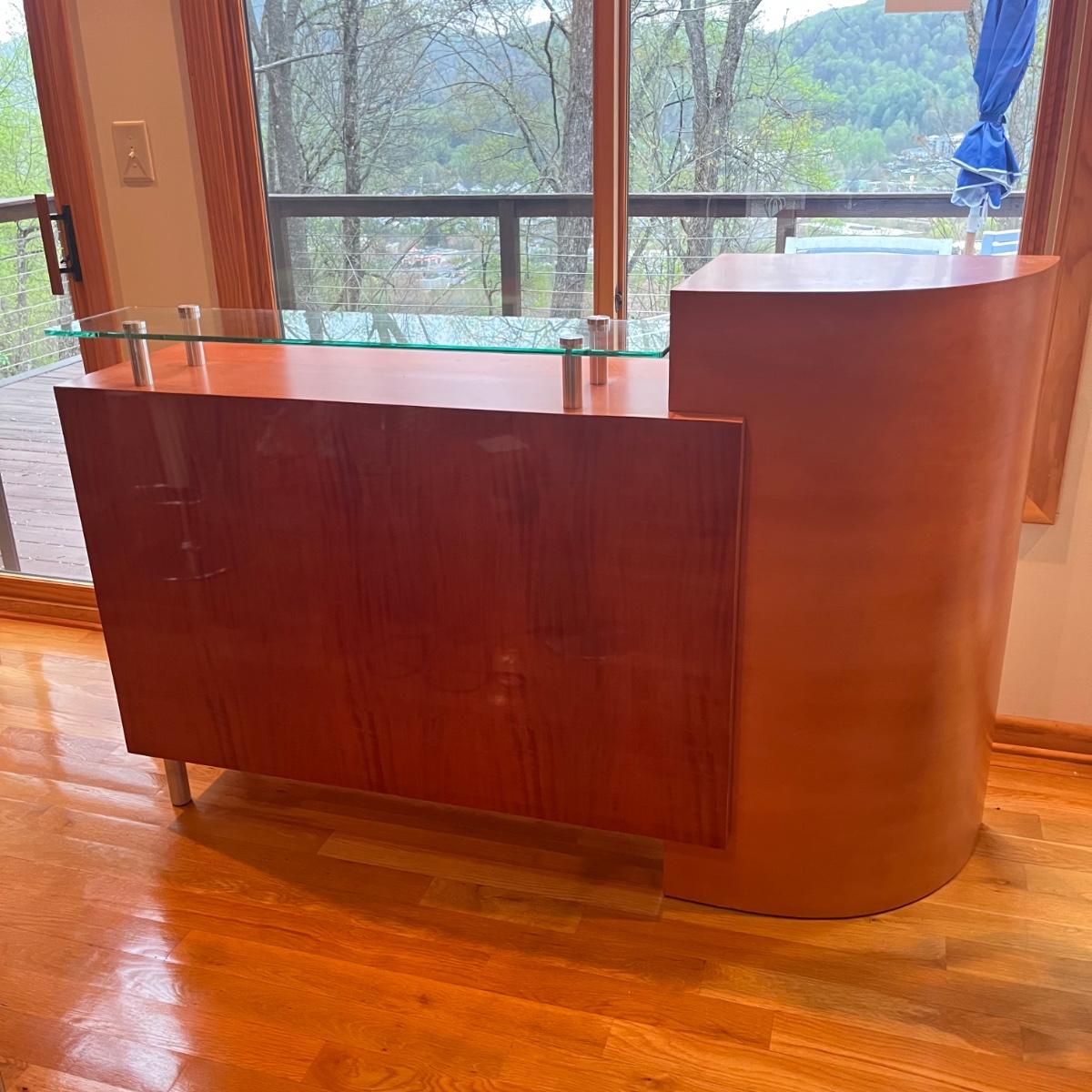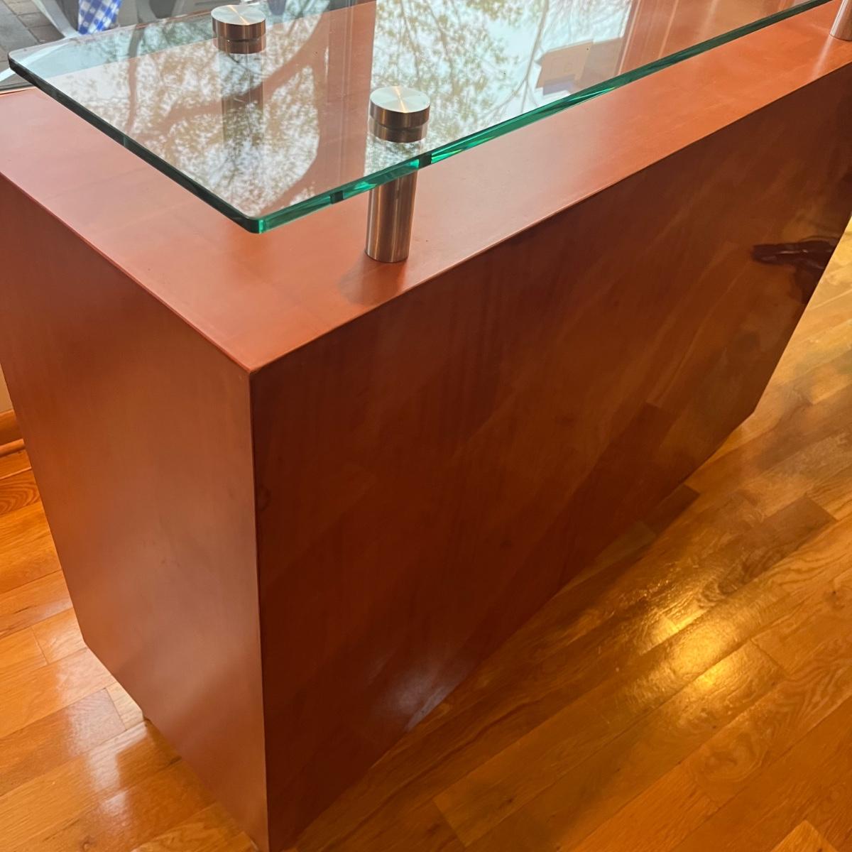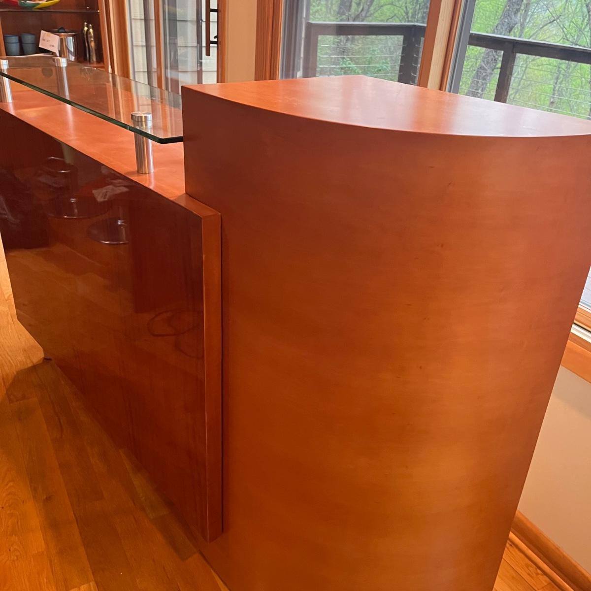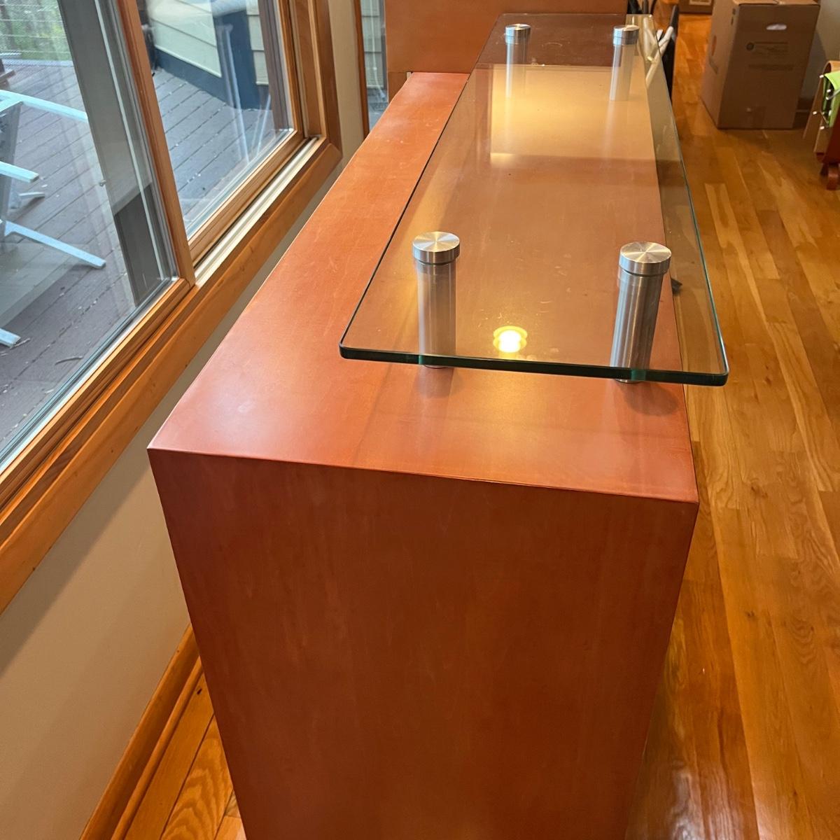 Lot includes a modern bar with a raised glass top, adjustable shelves, glass hanger and metal legs on one side. Bar has some wear on top and chip in laminate see pictures. Bar measures 18” x 66” x 43.5”H.