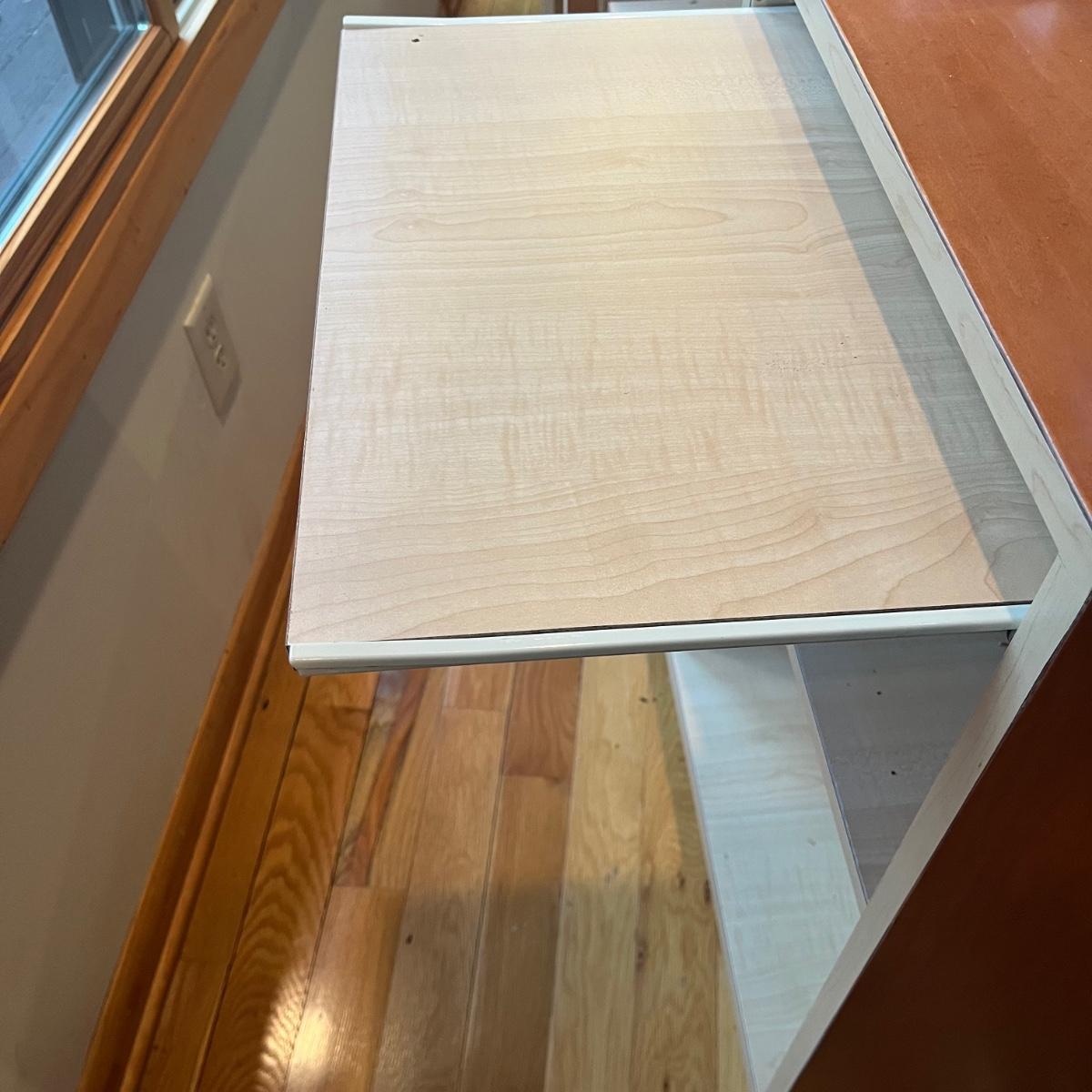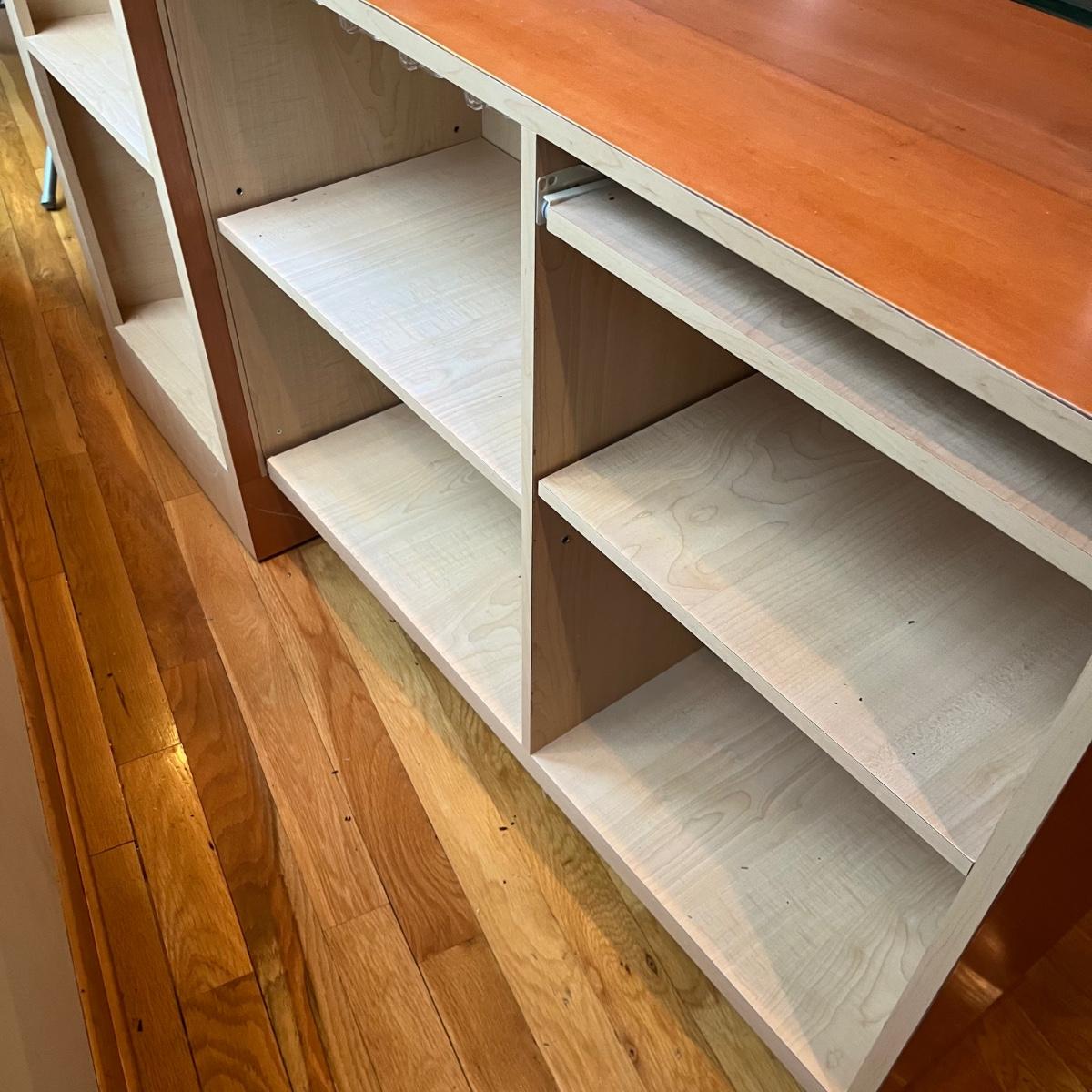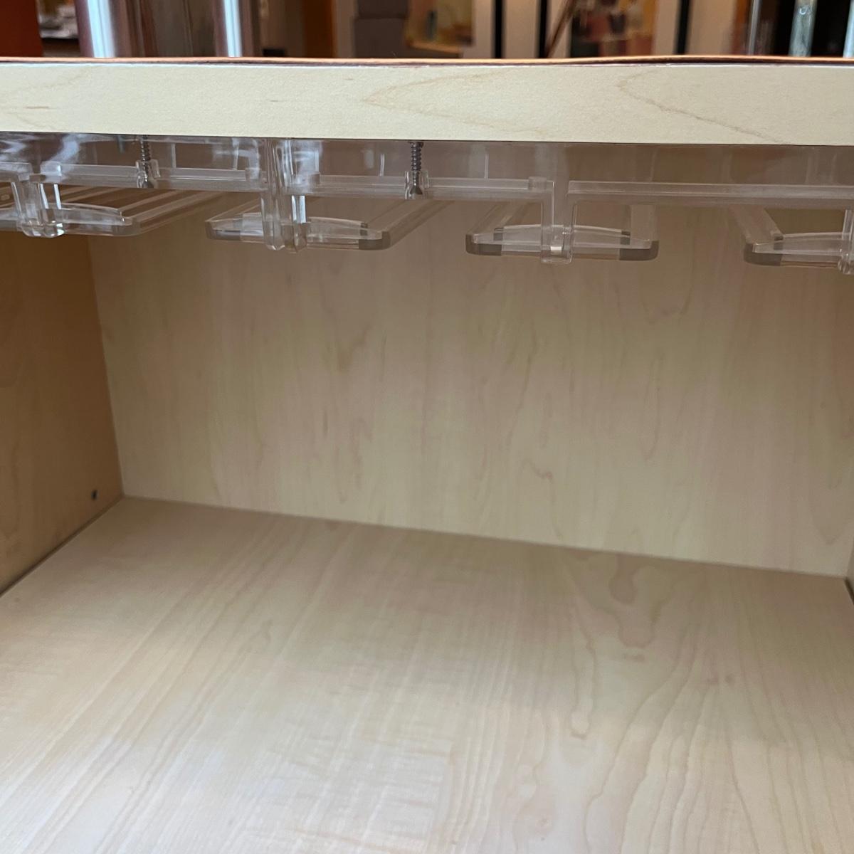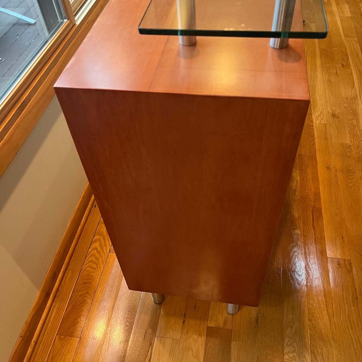 Lot includes a modern bar with a raised glass top, adjustable shelves, glass hanger and metal legs on one side. Bar has some wear on top and chip in laminate see pictures. Bar measures 18” x 66” x 43.5”H.