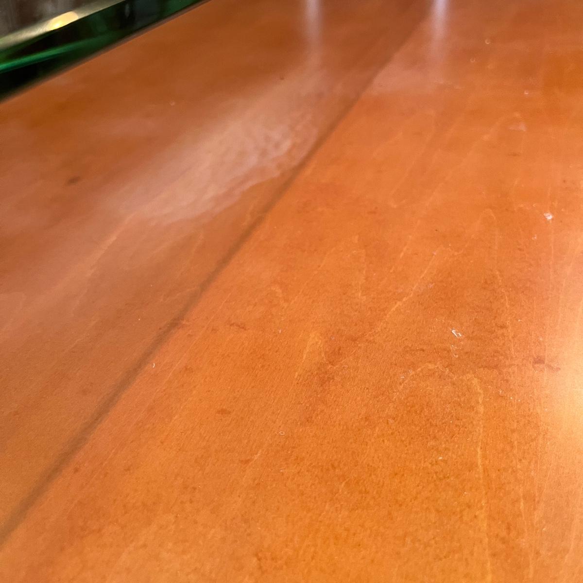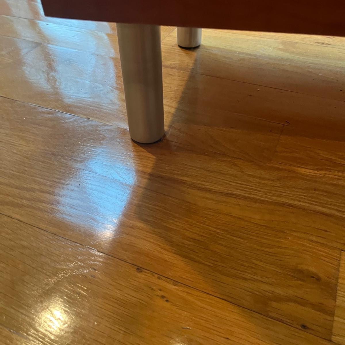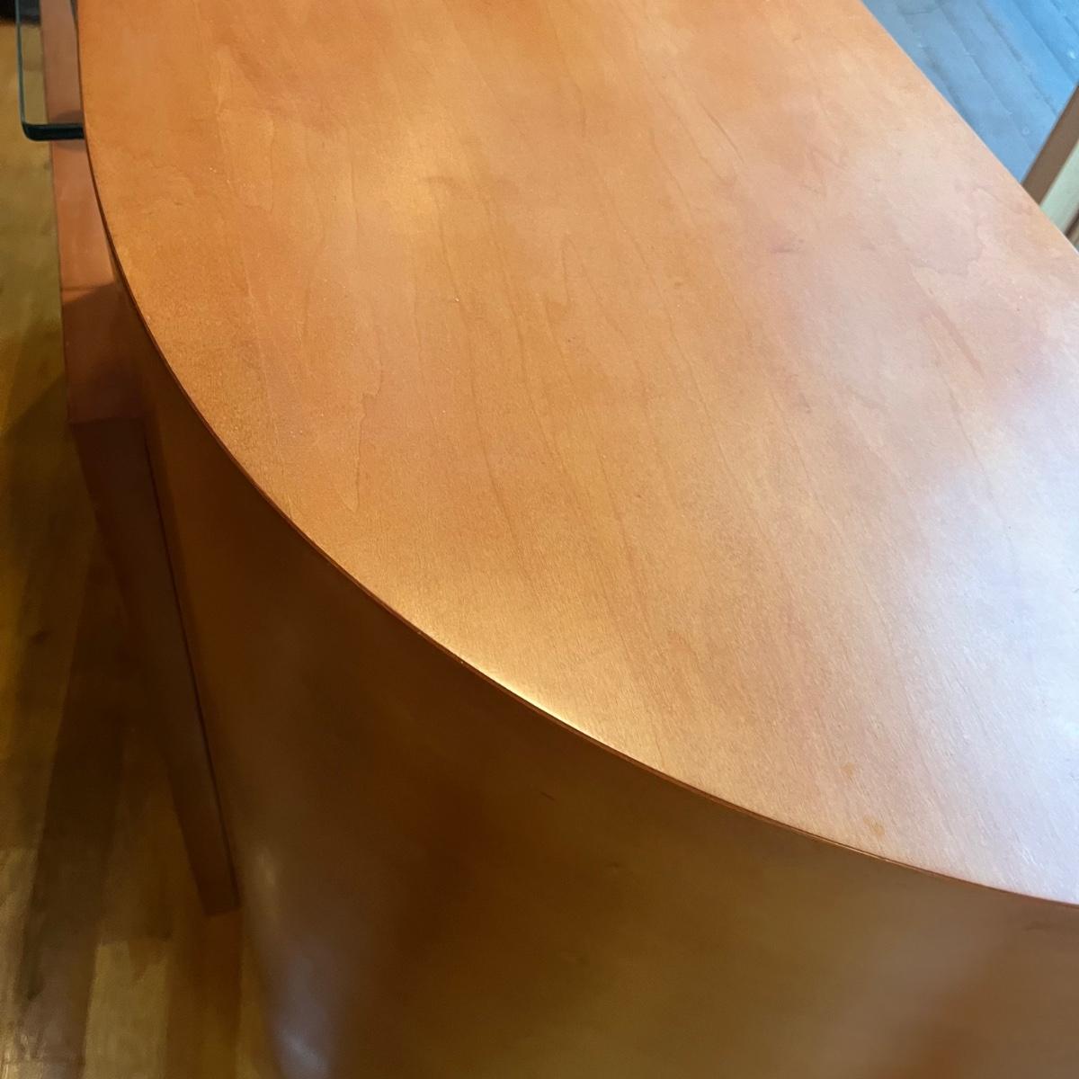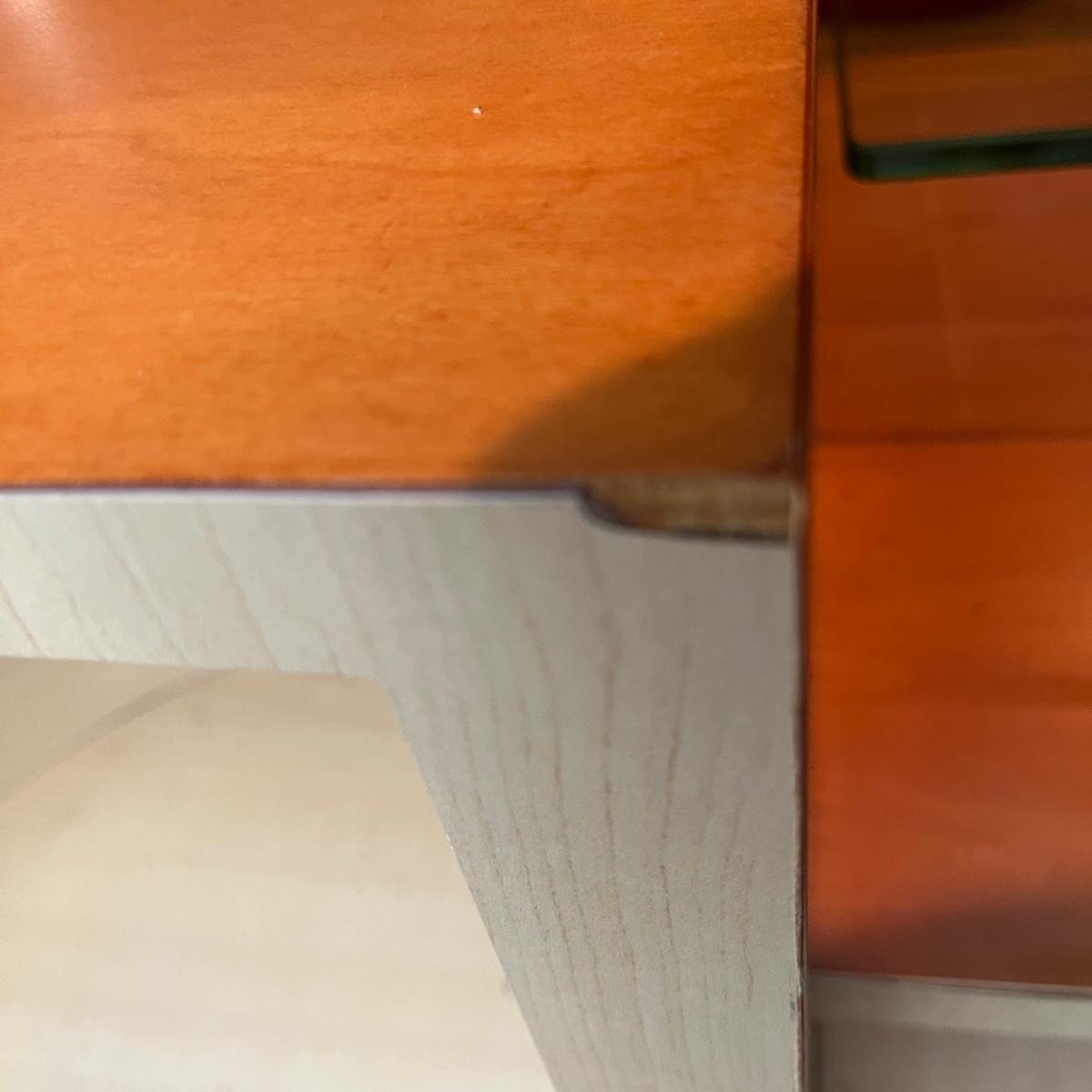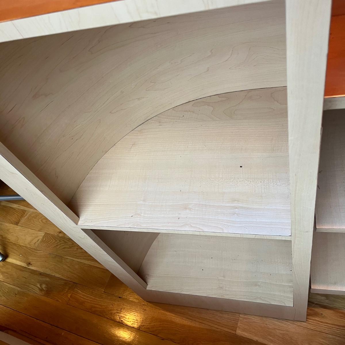 Lot includes a modern bar with a raised glass top, adjustable shelves, glass hanger and metal legs on one side. Bar has some wear on top and chip in laminate see pictures. Bar measures 18” x 66” x 43.5”H.