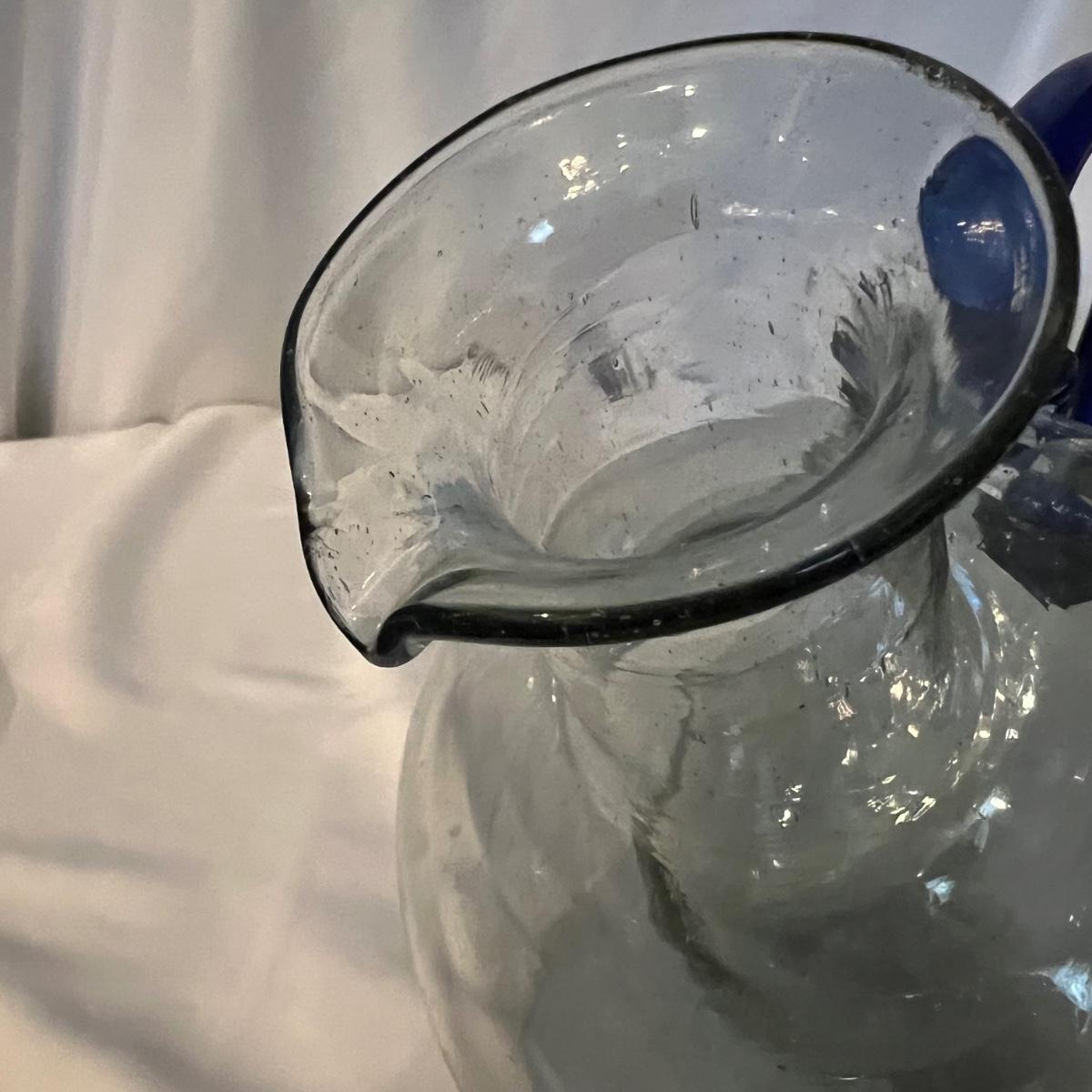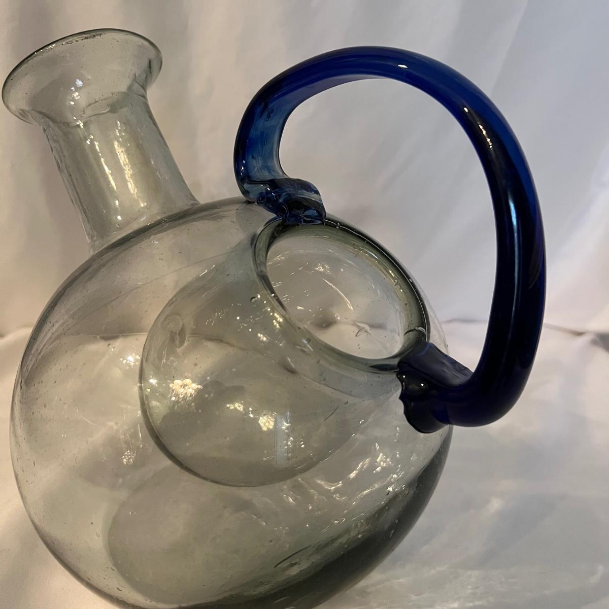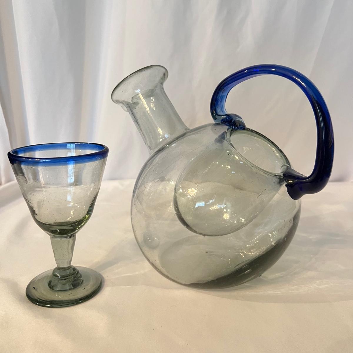 This modern glass pitcher with blue handle appears to be hand blown and has a built in ice compartment to chill the contents. It comes with six matching stemmed glasses that have rims that match the cobalt blue handle of the pitcher.