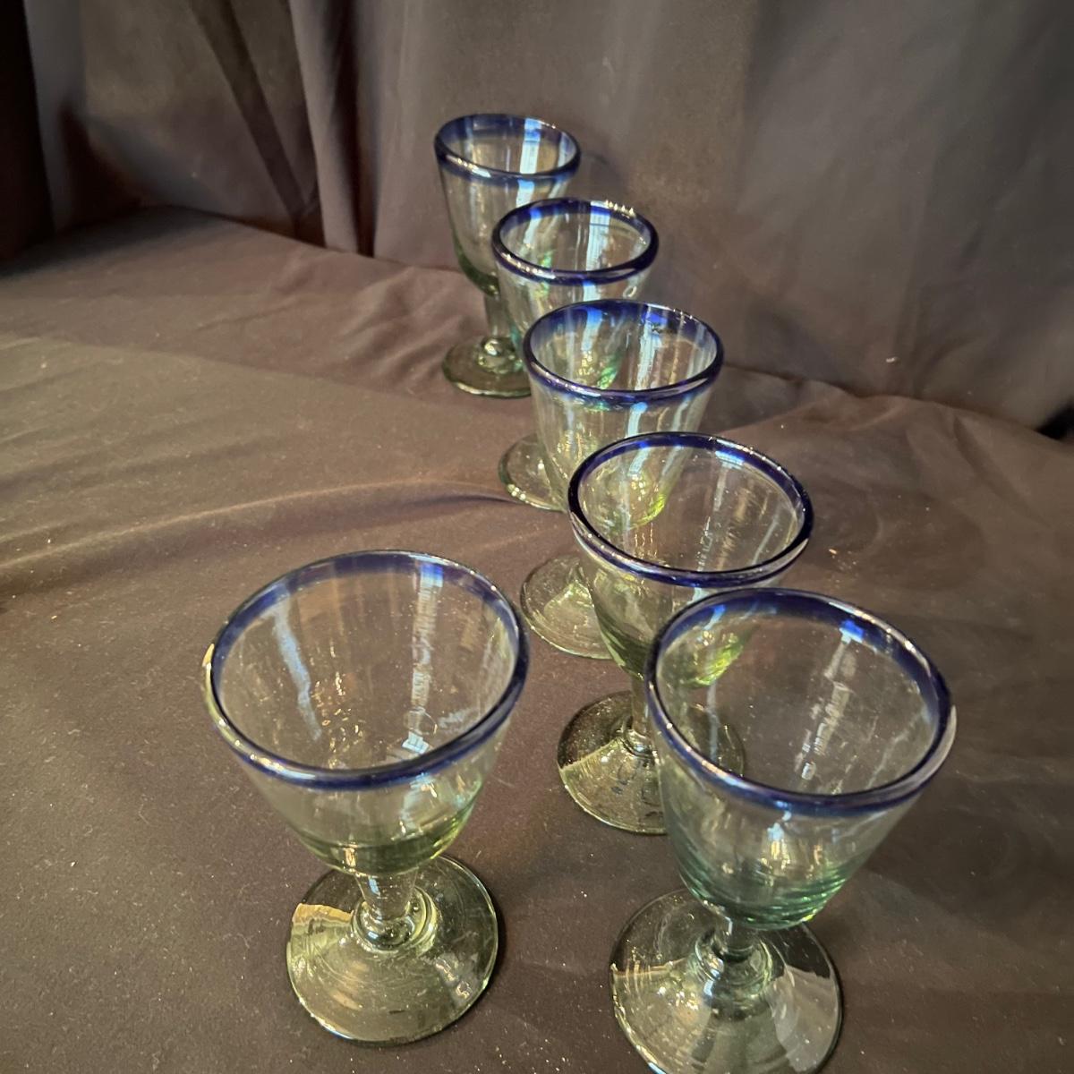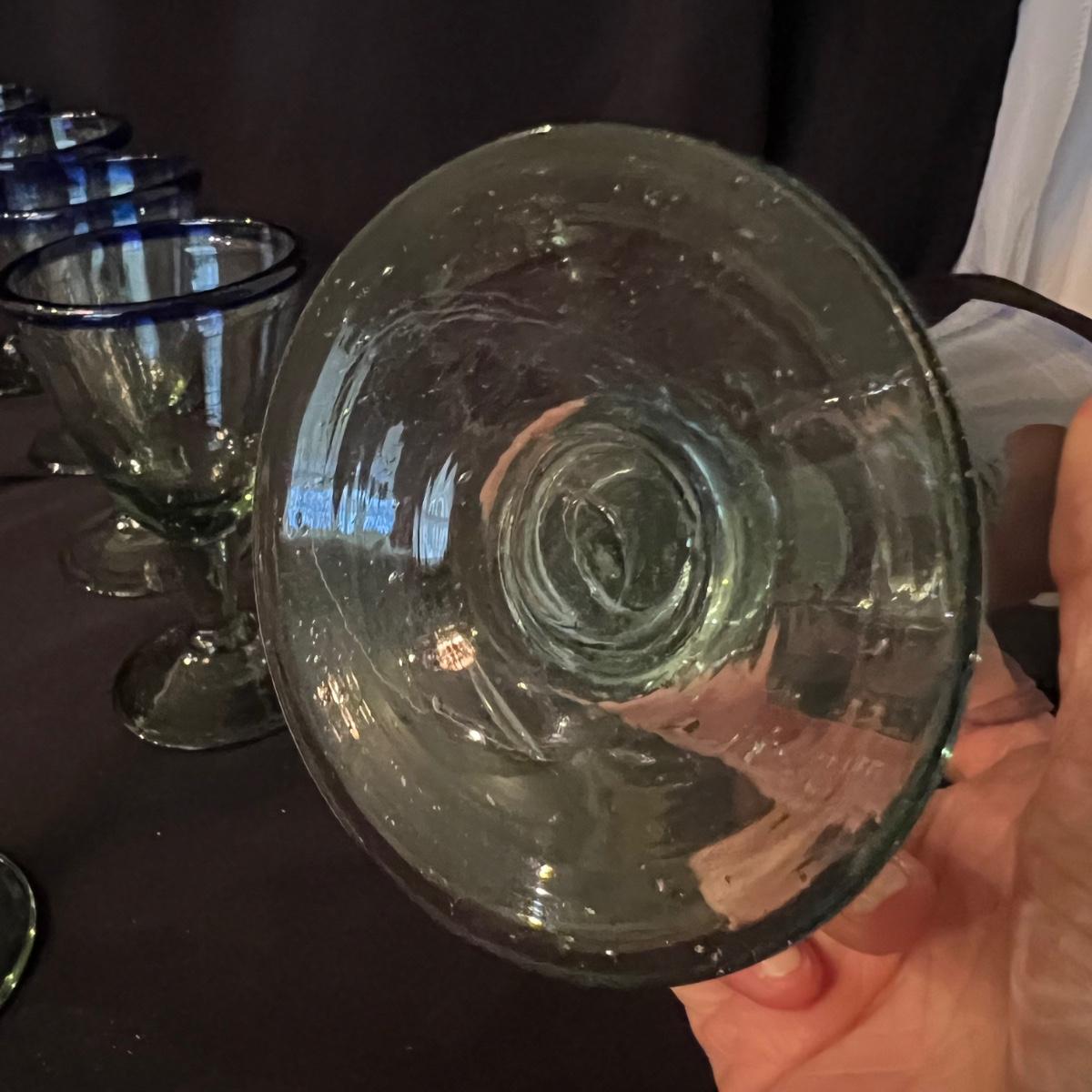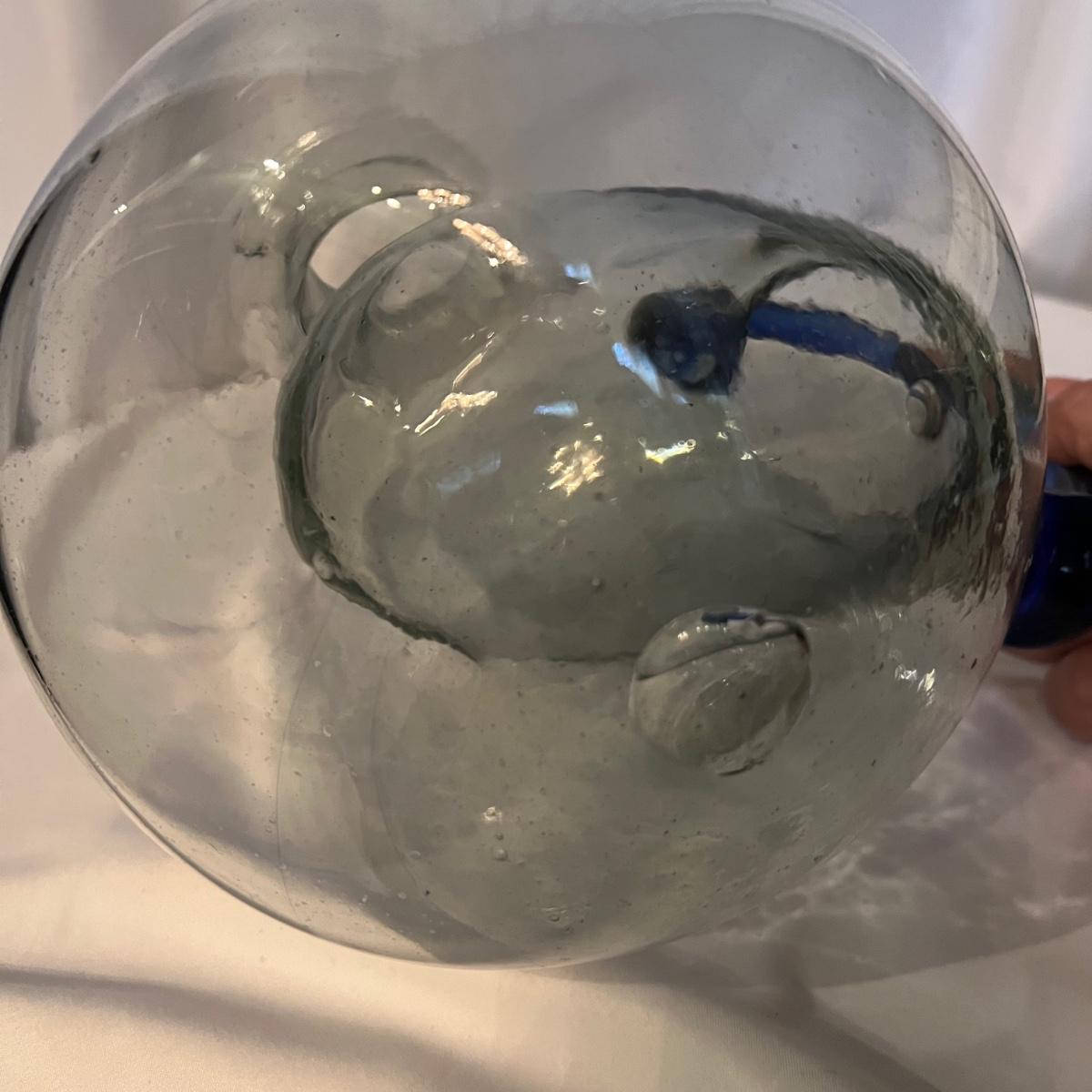 This modern glass pitcher with blue handle appears to be hand blown and has a built in ice compartment to chill the contents. It comes with six matching stemmed glasses that have rims that match the cobalt blue handle of the pitcher.