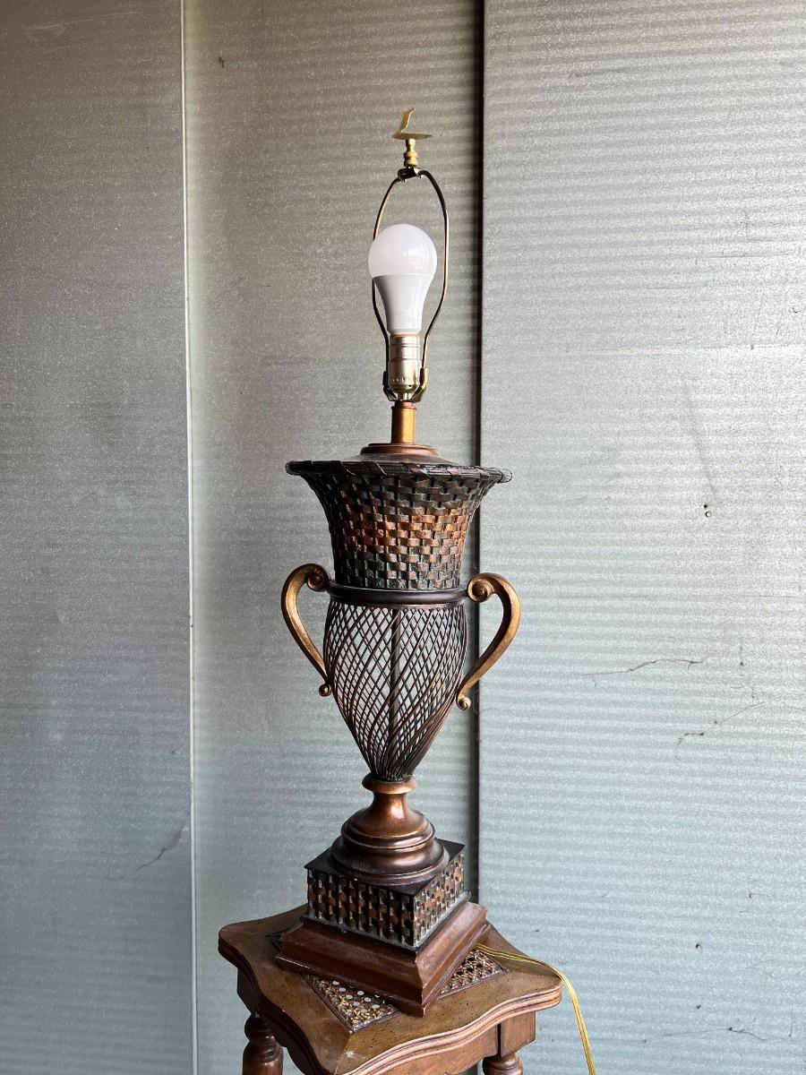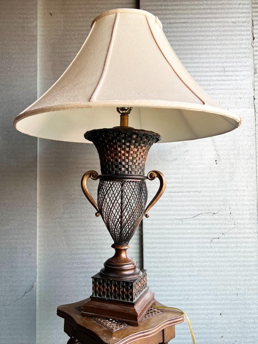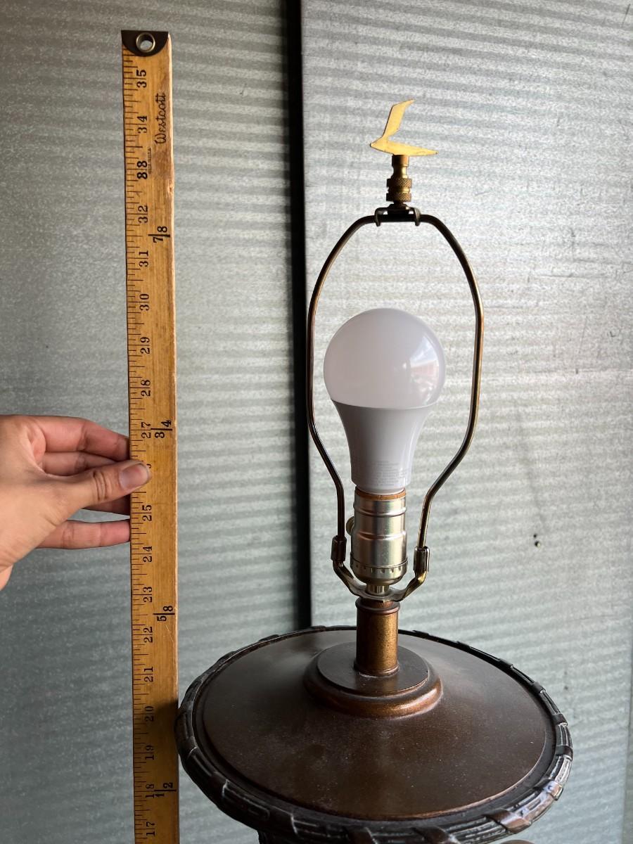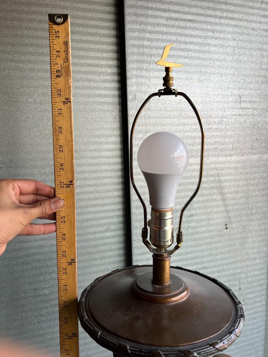 There is no significant damage to the lamp and is in overall good displayable condition. The lampshade has some light wear, but no other significant damage. Has not been plugged in and tested. Check pictures for more details and for sizing.