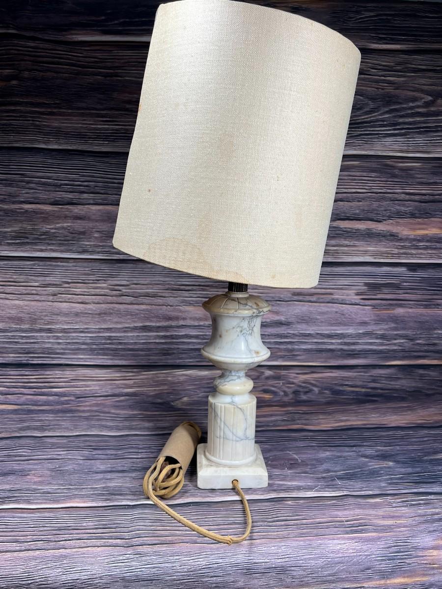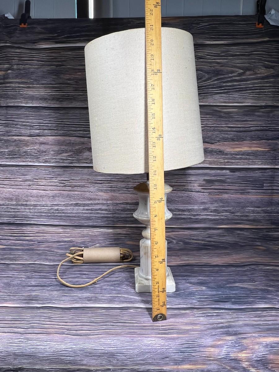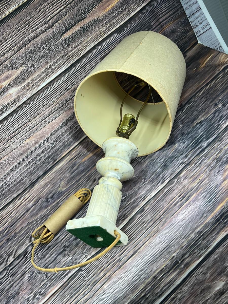 Modern Home Faux Marble Side Table Lamp, the lamp shade is bent and leans to one side and there is a small crack. Does not come with a lightbulb and has not been tested, the base needs to be tightened and is a bit loose. Check pictures for more details and for sizing.